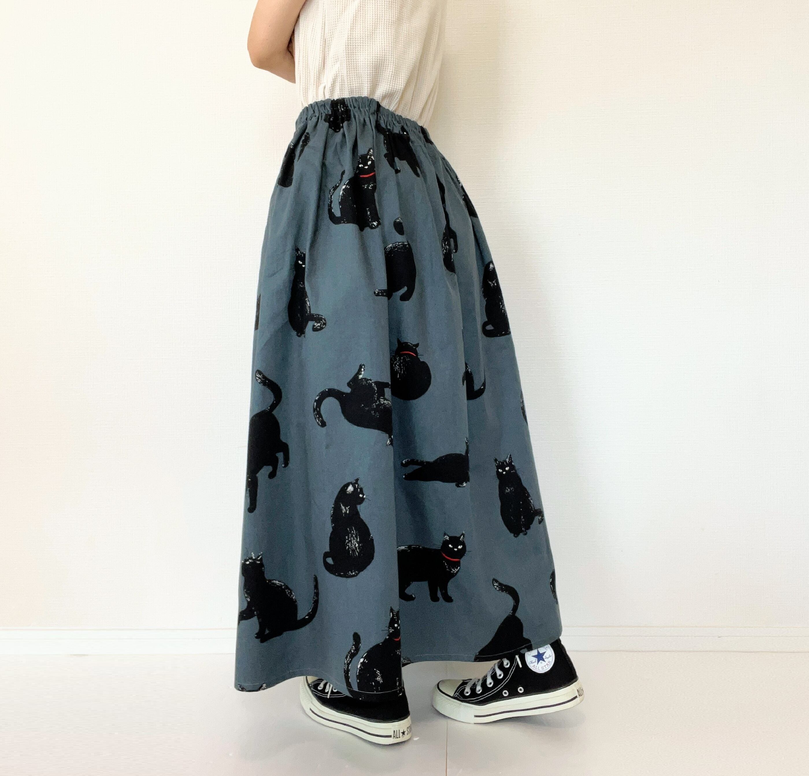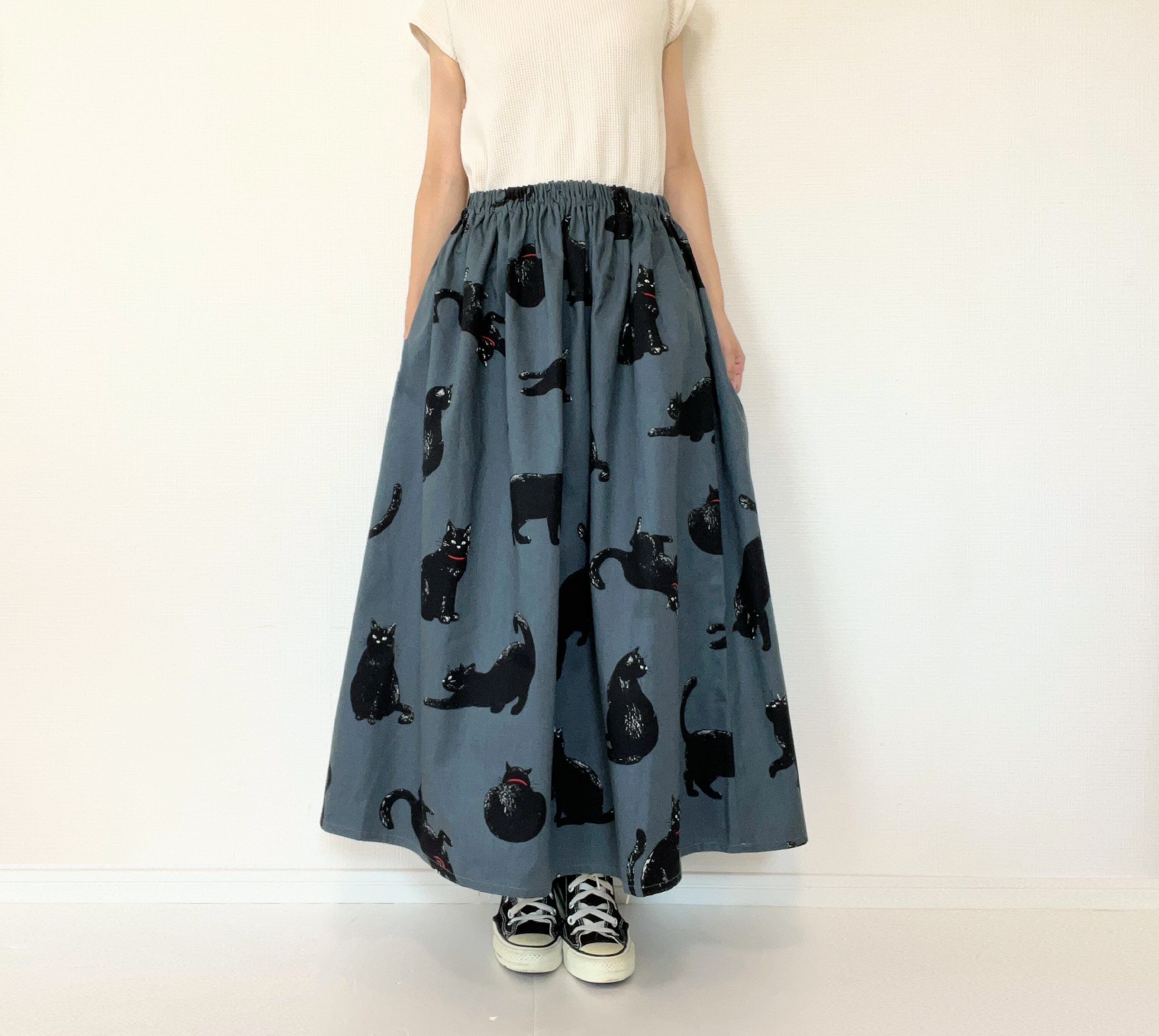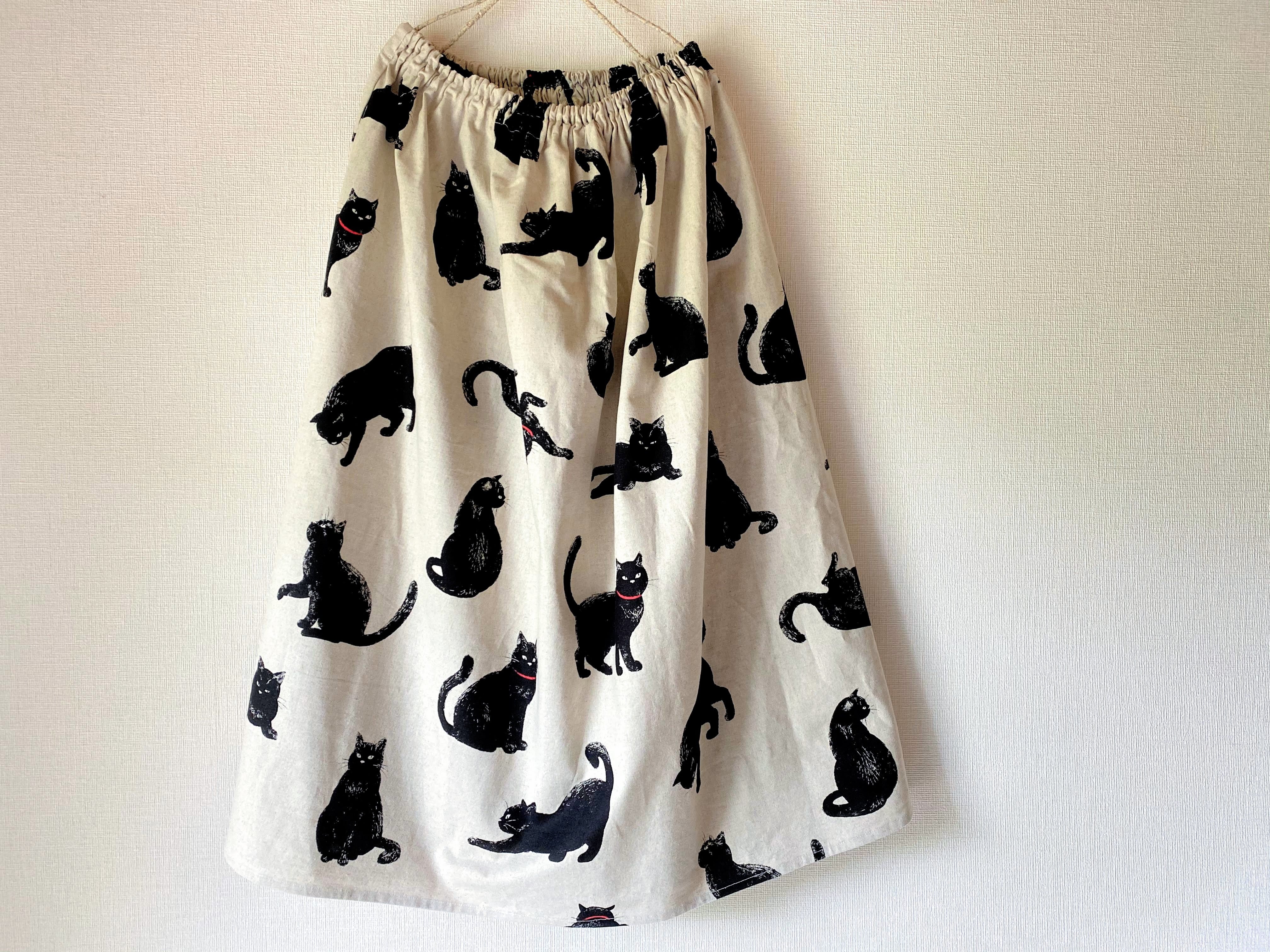 こなまいきな黒猫のロングスカート*マキシ丈*国産コットン100%*綿*ポケット付き*ホワイト