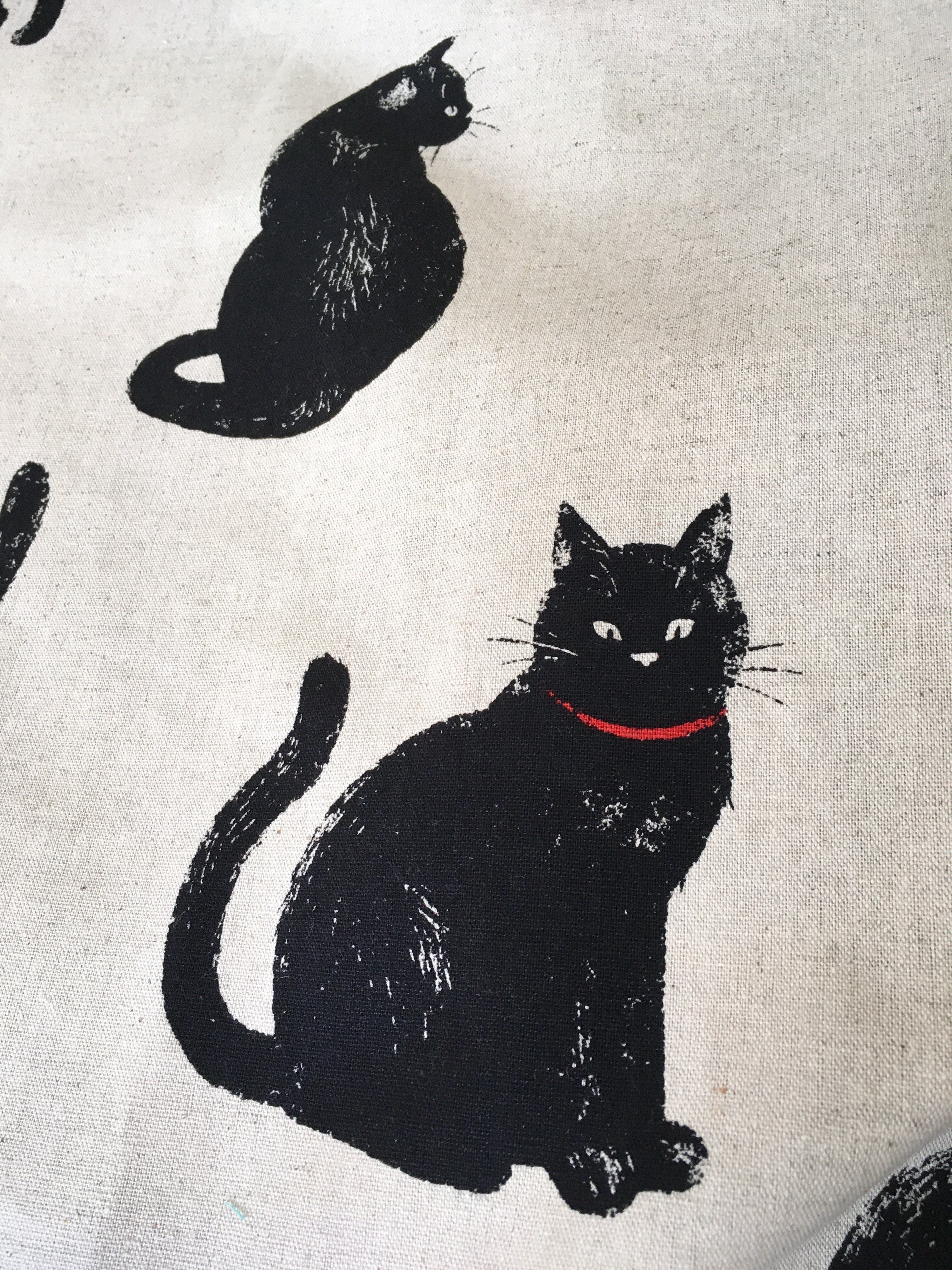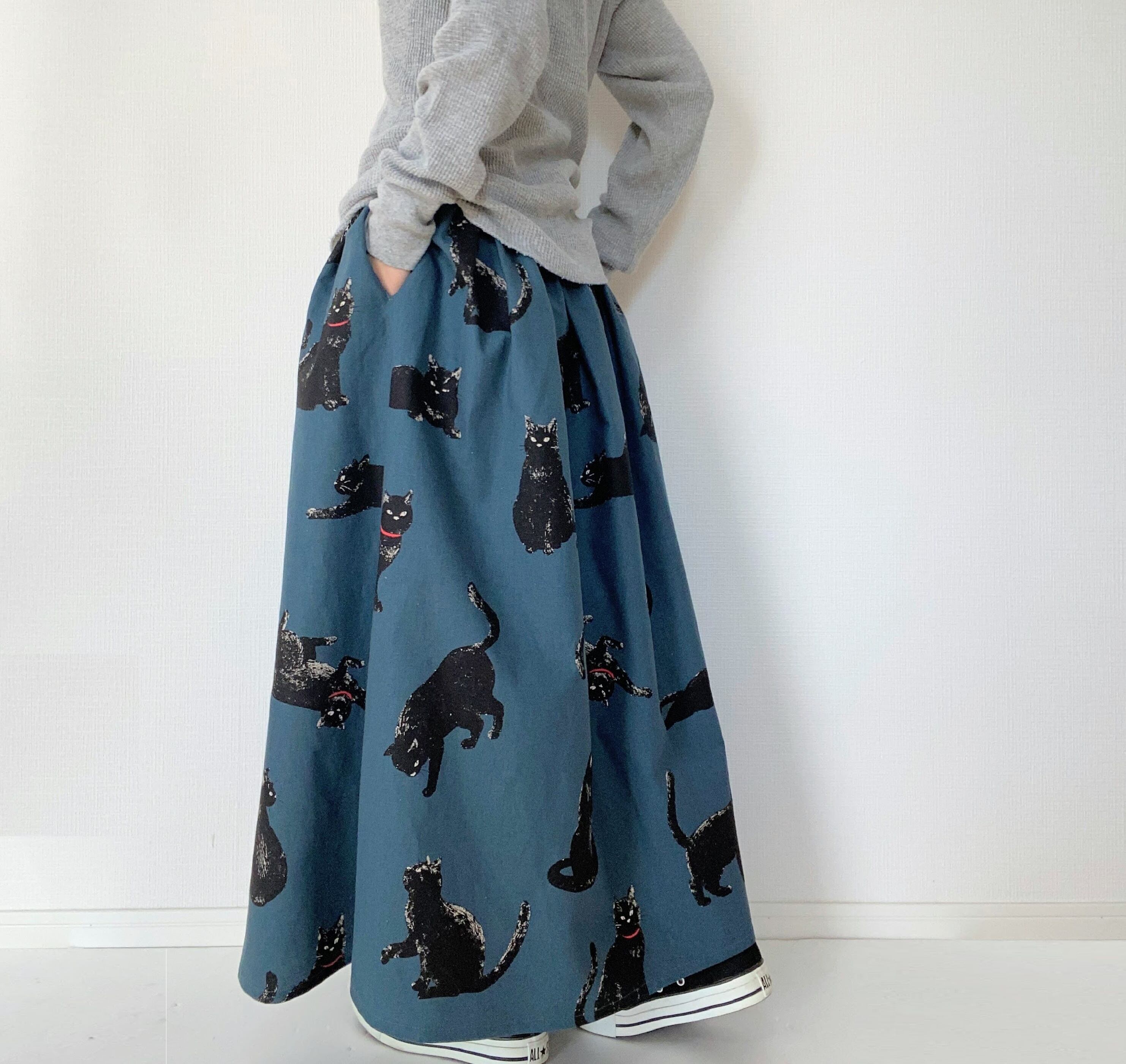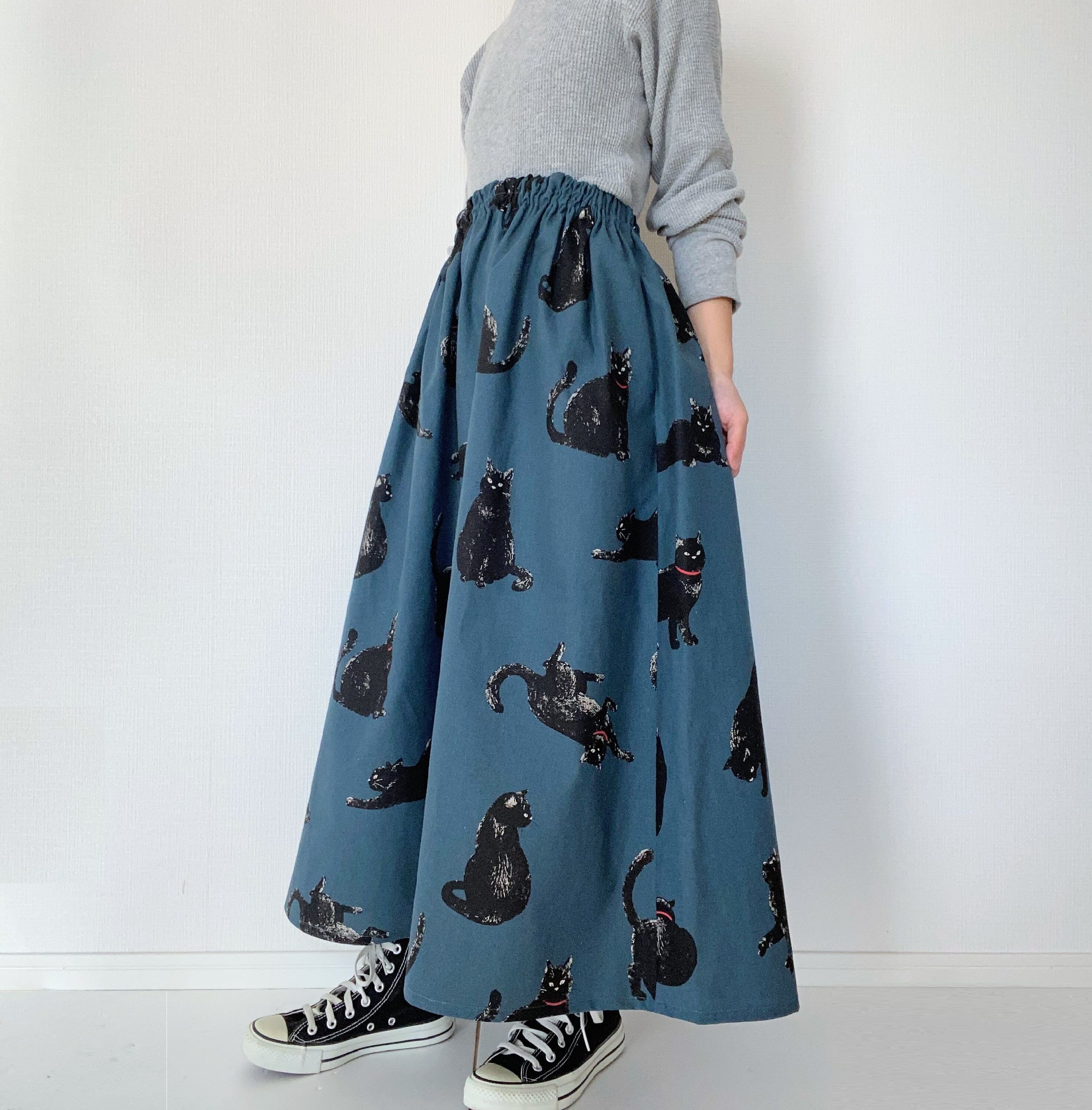 こなまいきな黒猫のロングスカート*マキシ丈*国産コットン100%*綿*ポケット付き*ホワイト