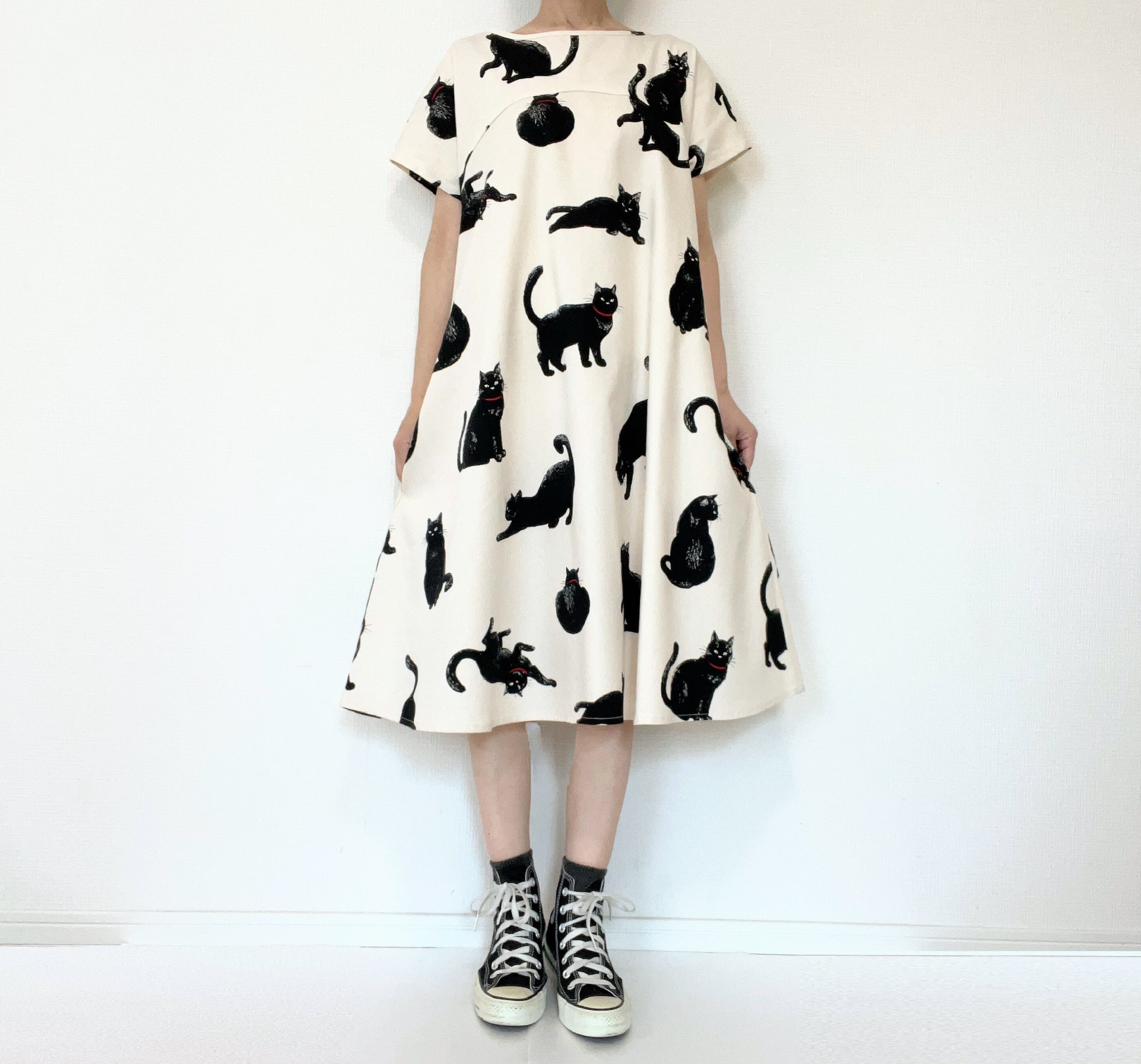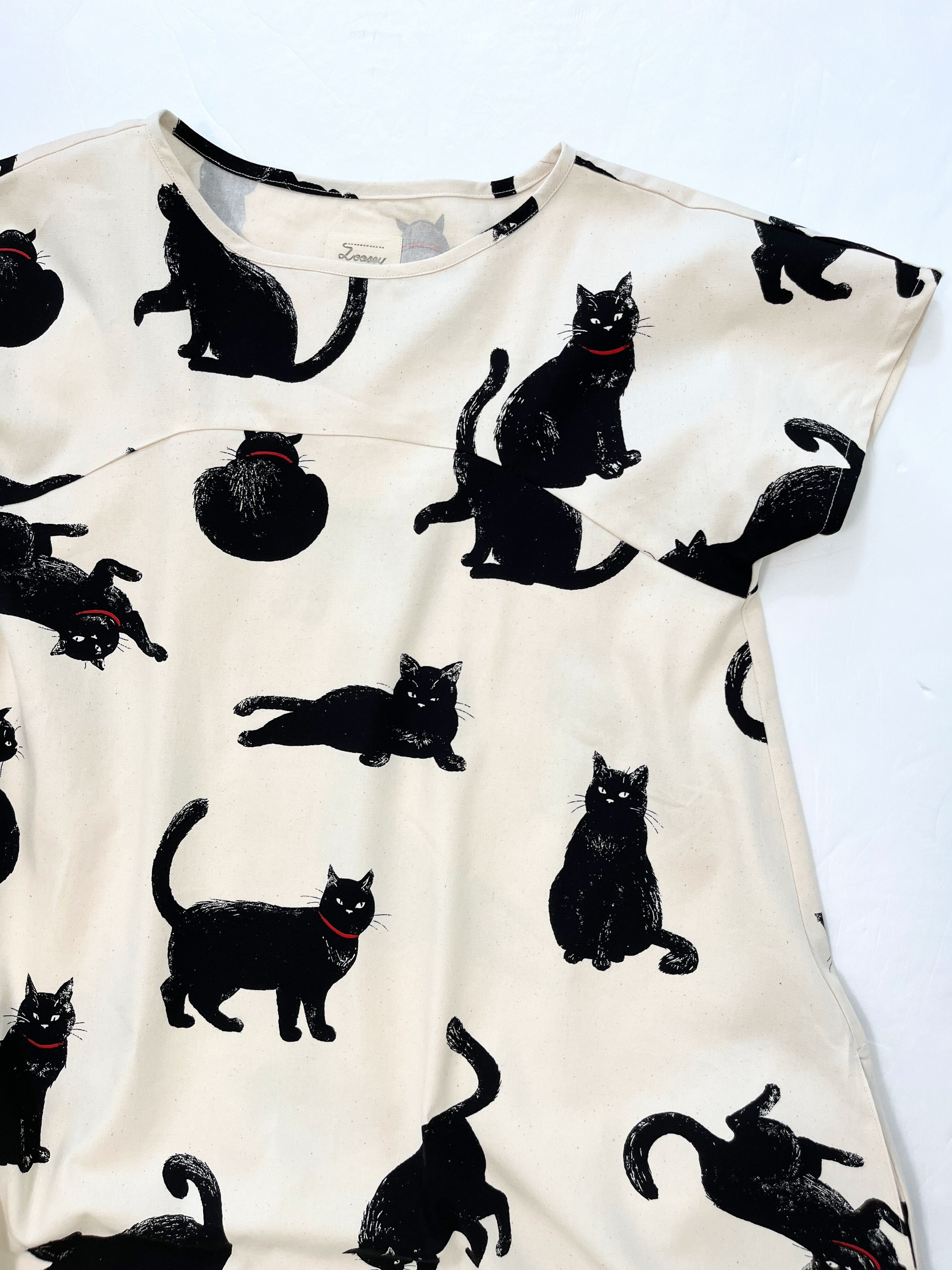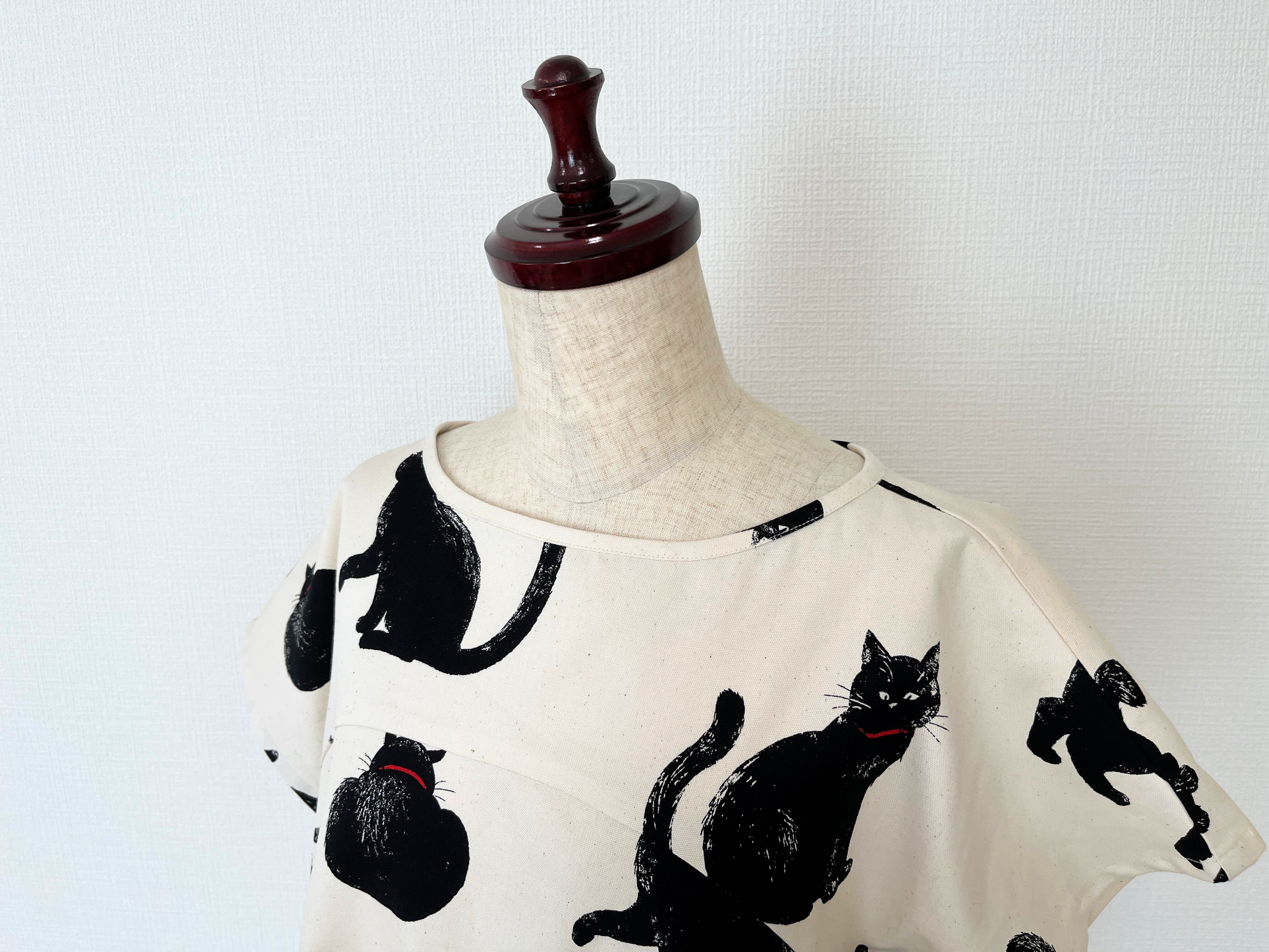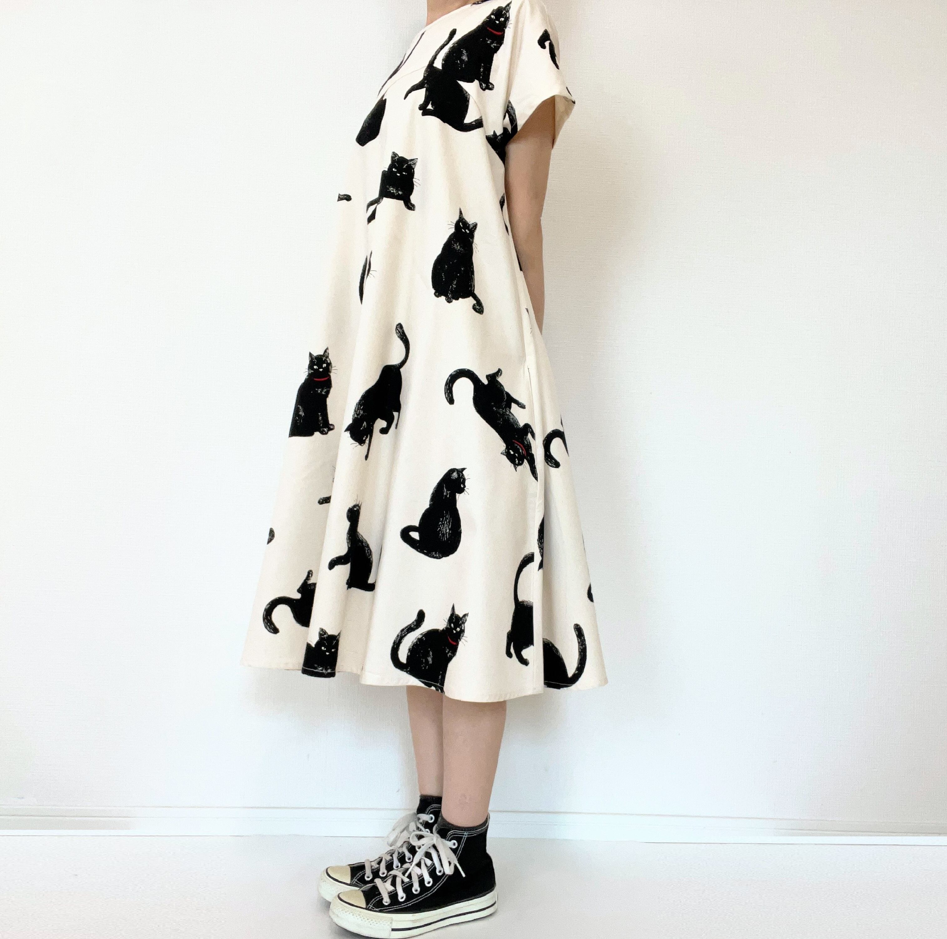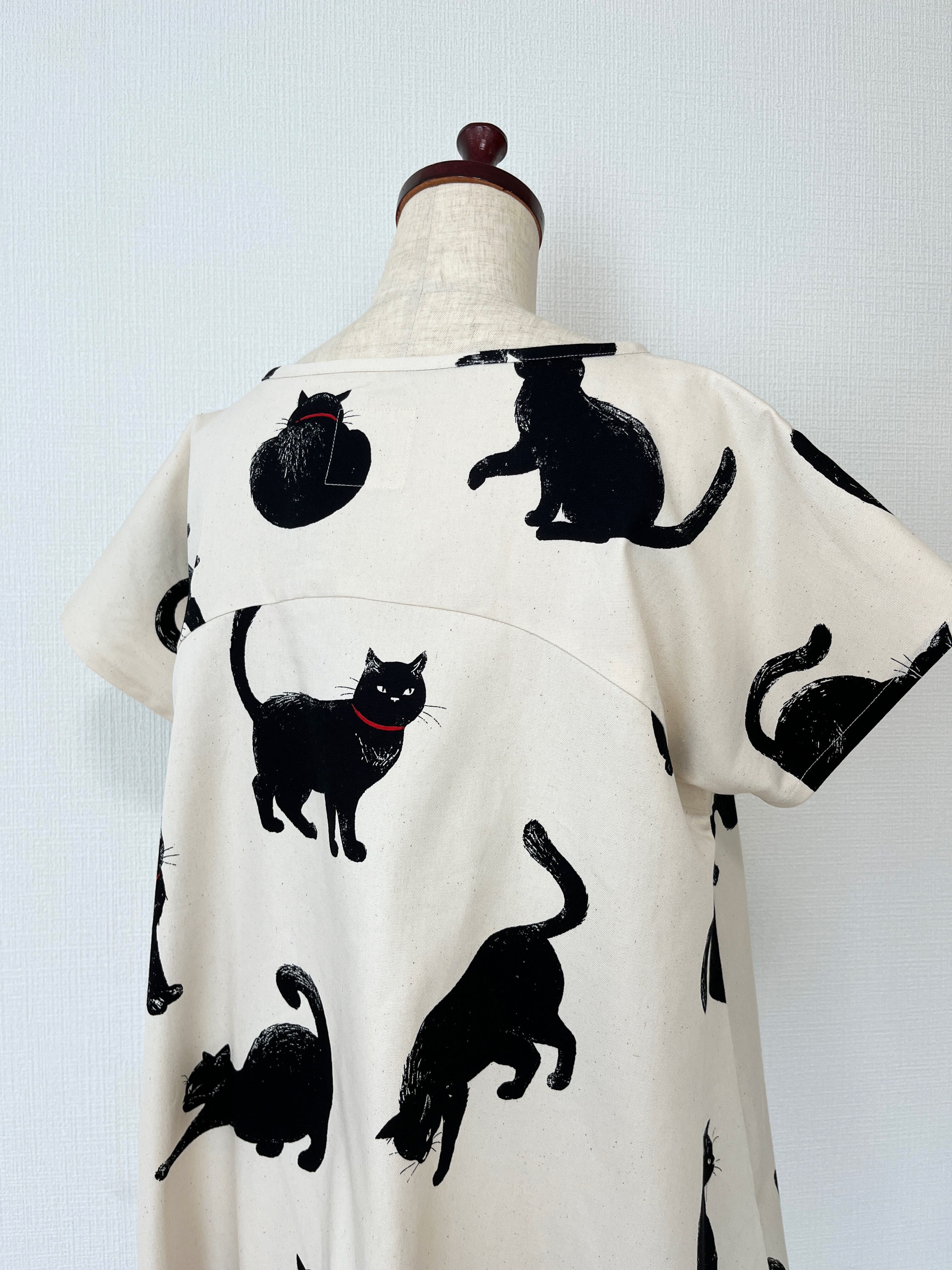 こなまいきな黒猫のワンピース*国産コットン 綿100%*ポケット付き*半袖