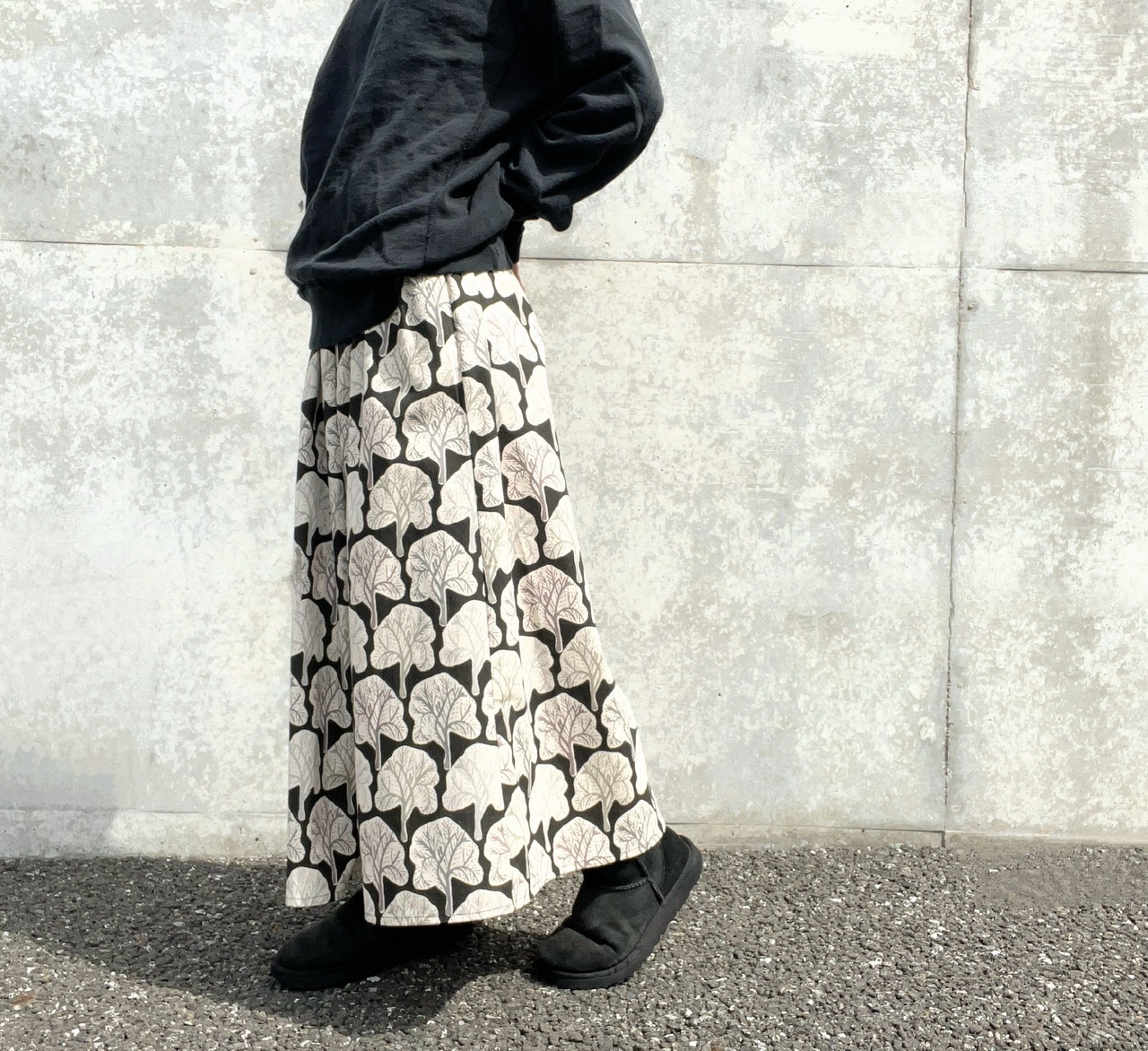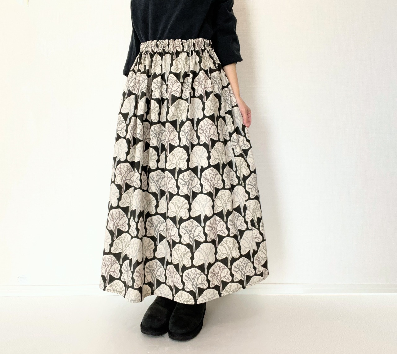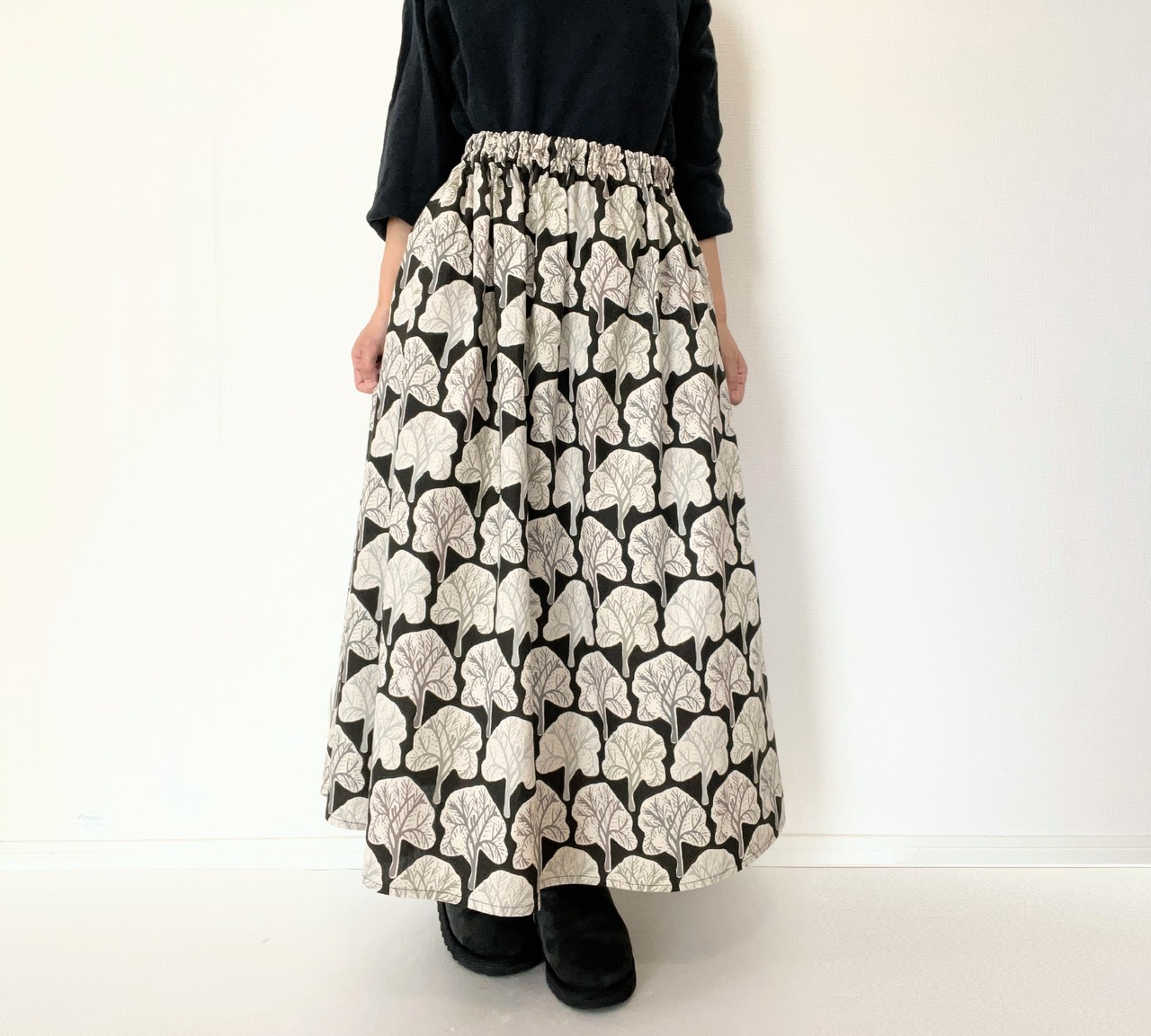 北欧の森*ツリー柄ロングスカート*ポケット付*ウエストゴム*ナチュラル綿麻コットンリネン*モノトーンブラック
