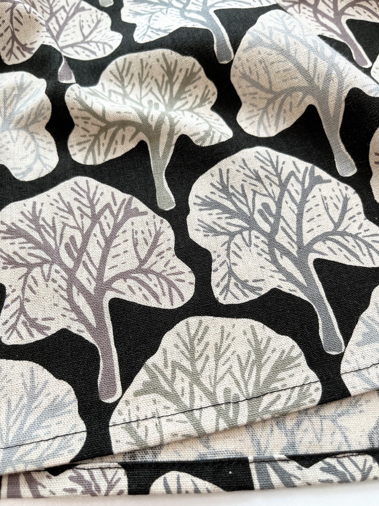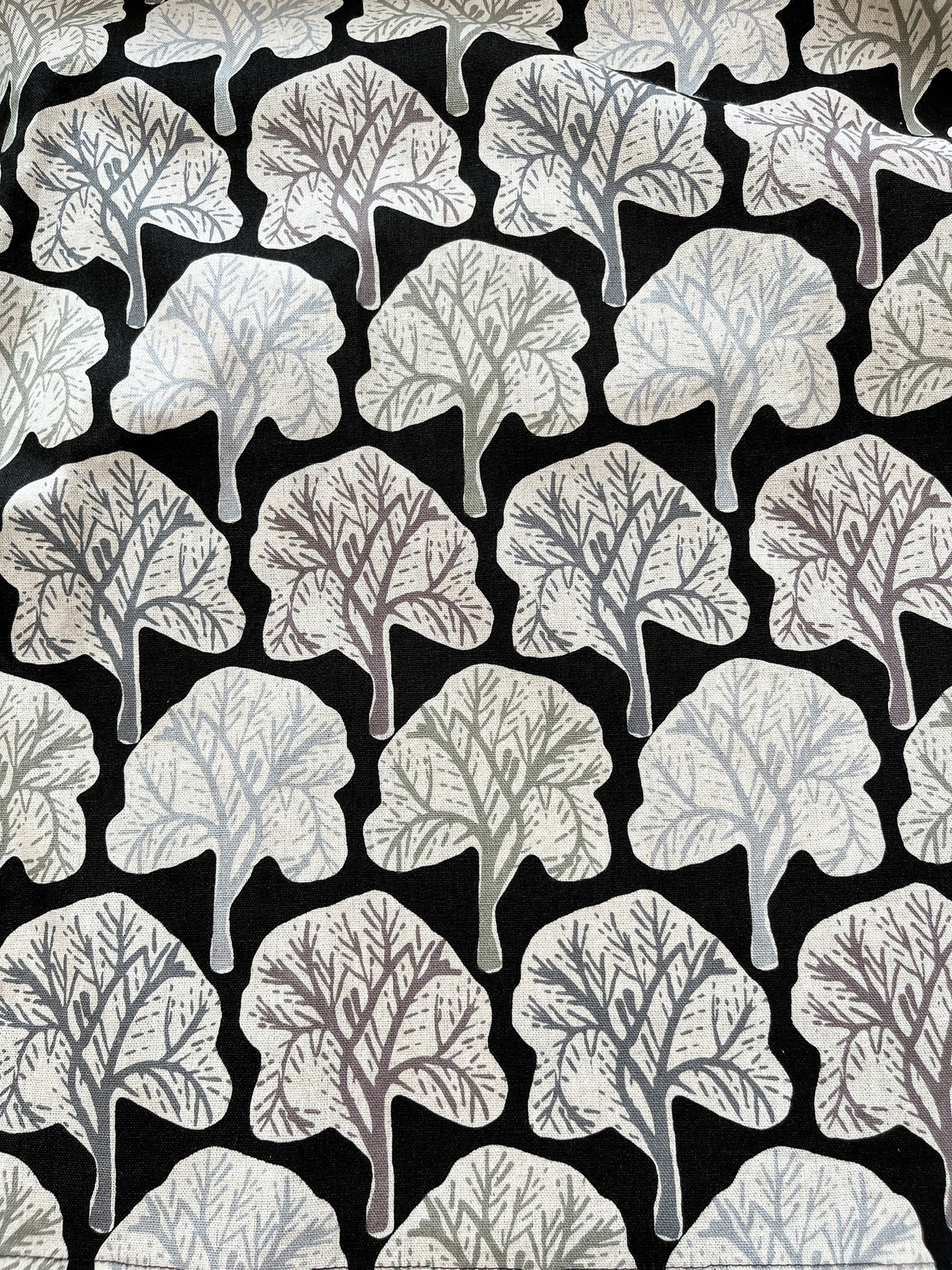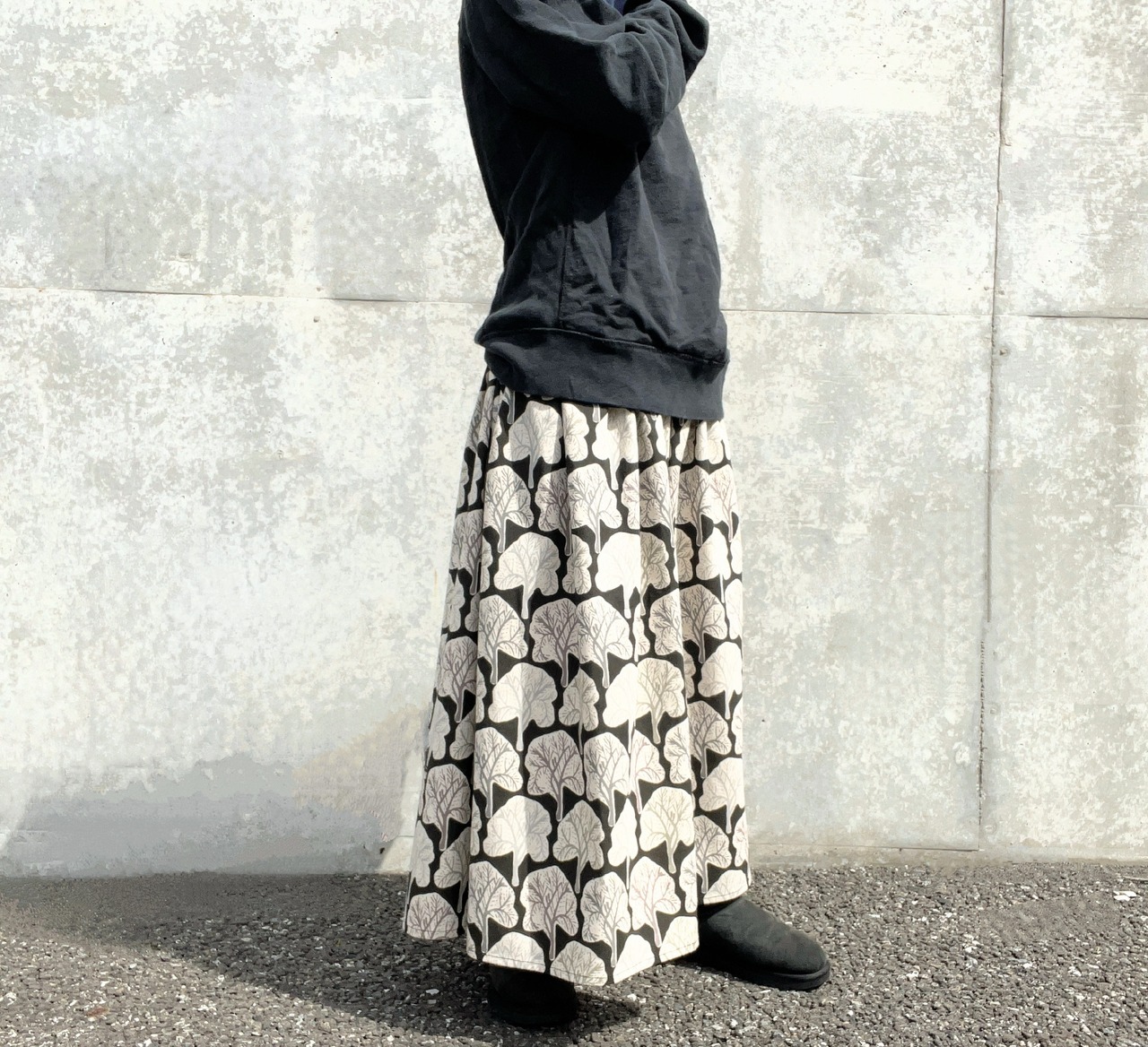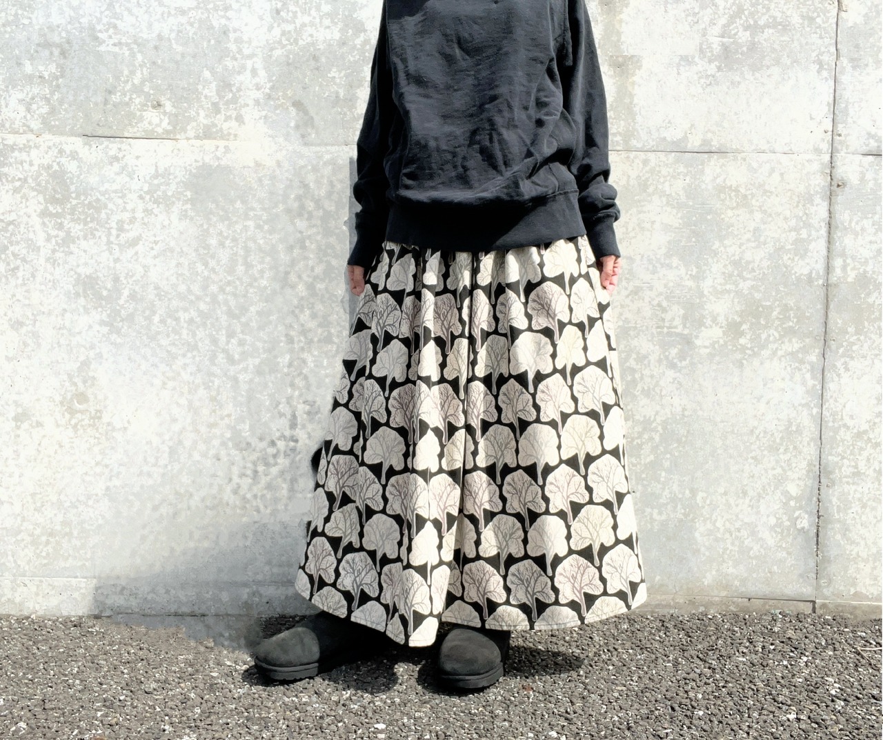 北欧の森*ツリー柄ロングスカート*ポケット付*ウエストゴム*ナチュラル綿麻コットンリネン*モノトーンブラック