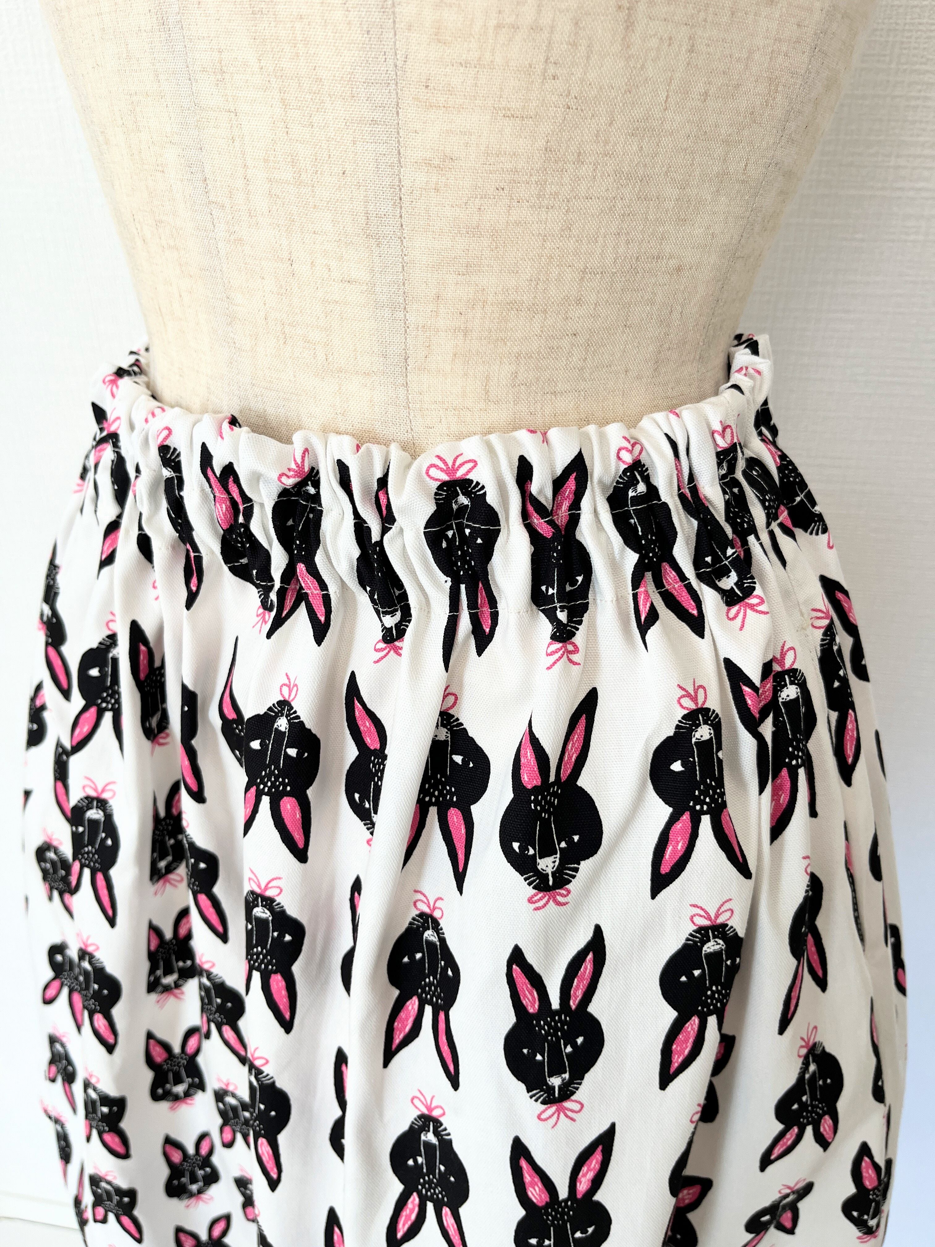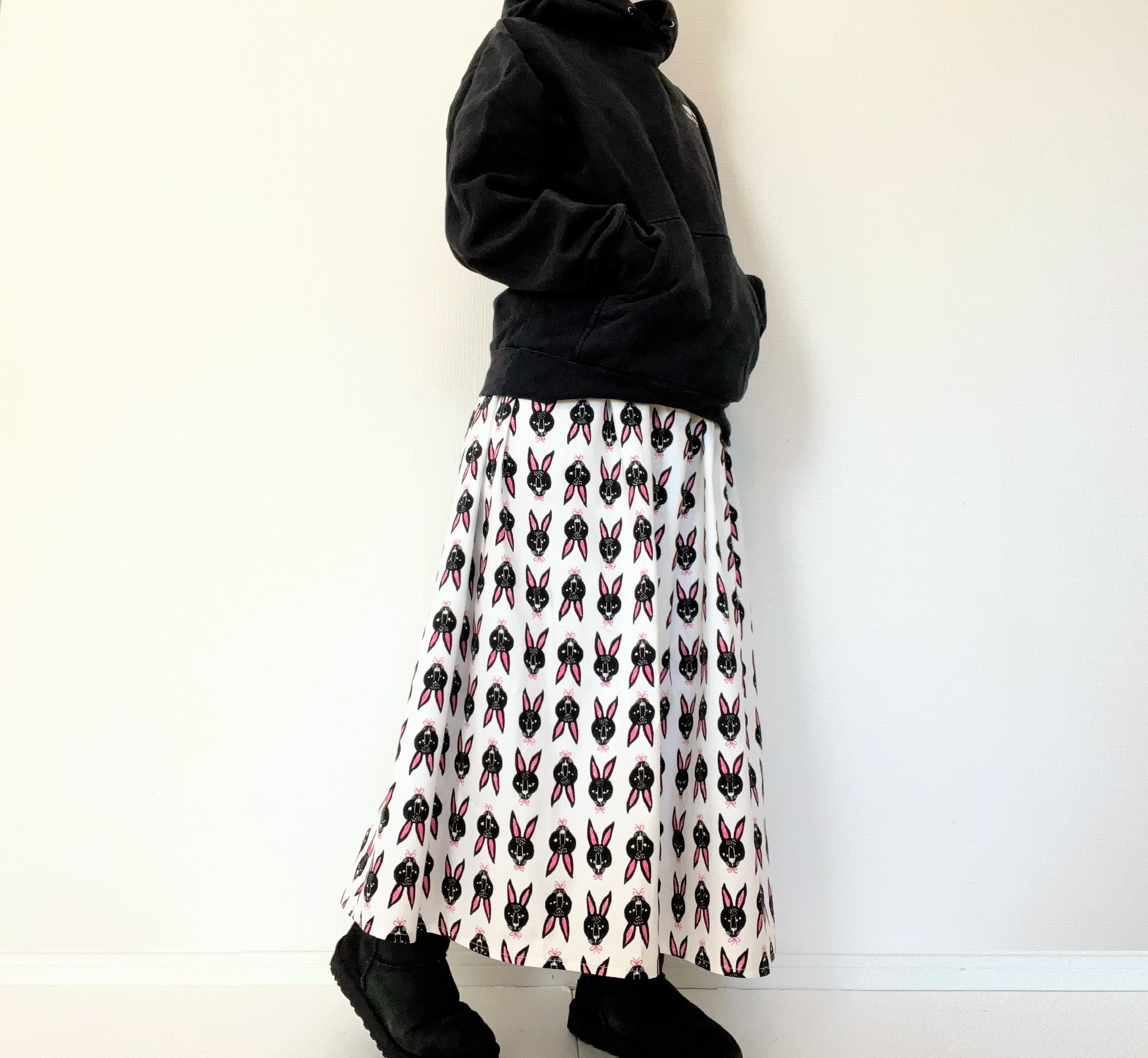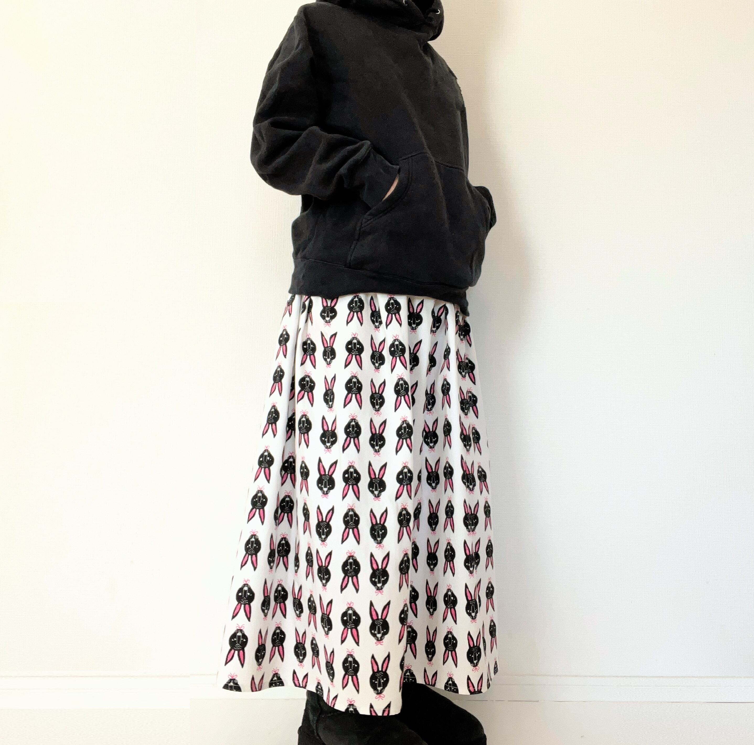 北欧*黒うさぎ柄ロングスカート*ポケット付*ウエストゴム*国産コットン100%*ホワイト×ピンク