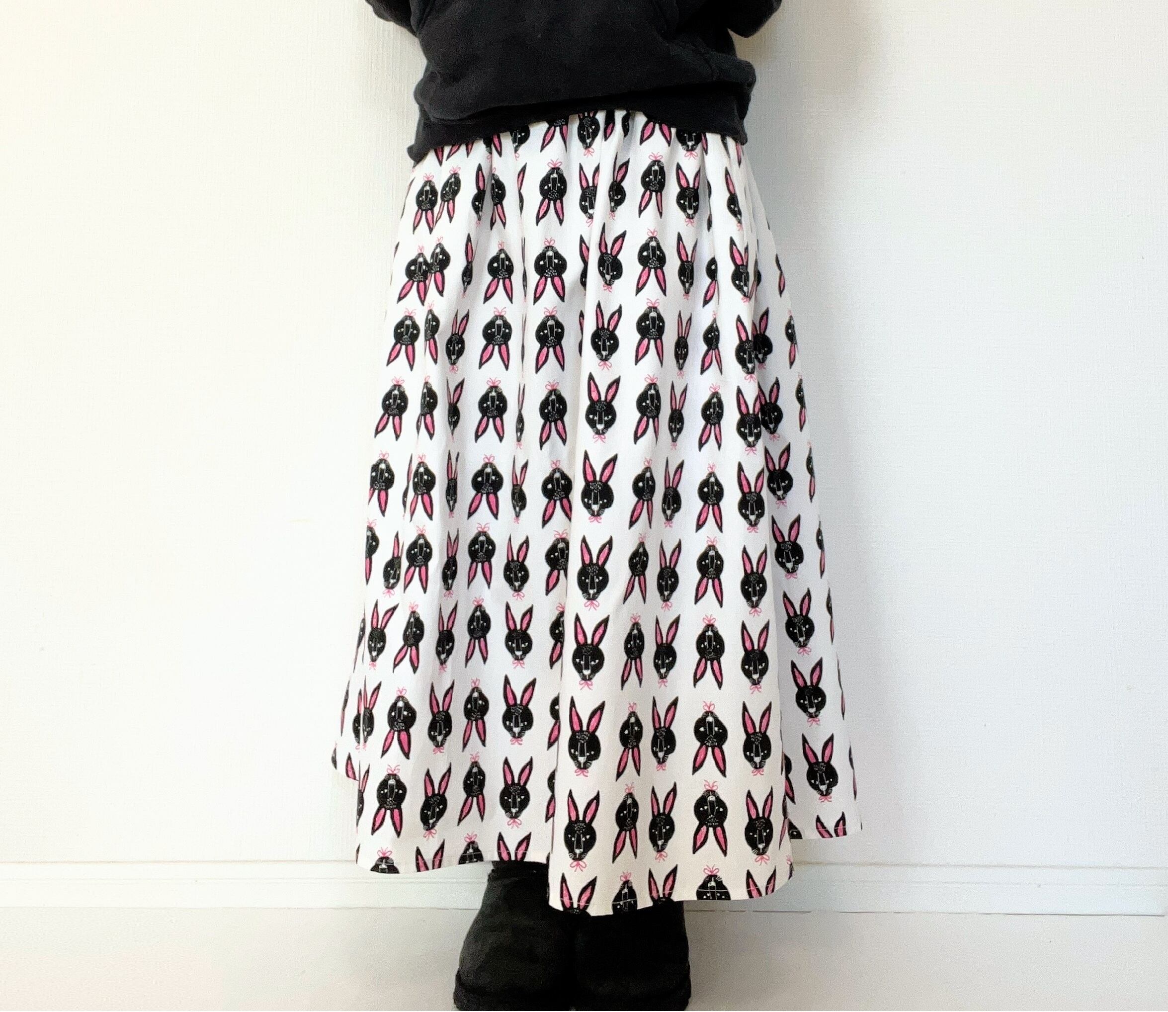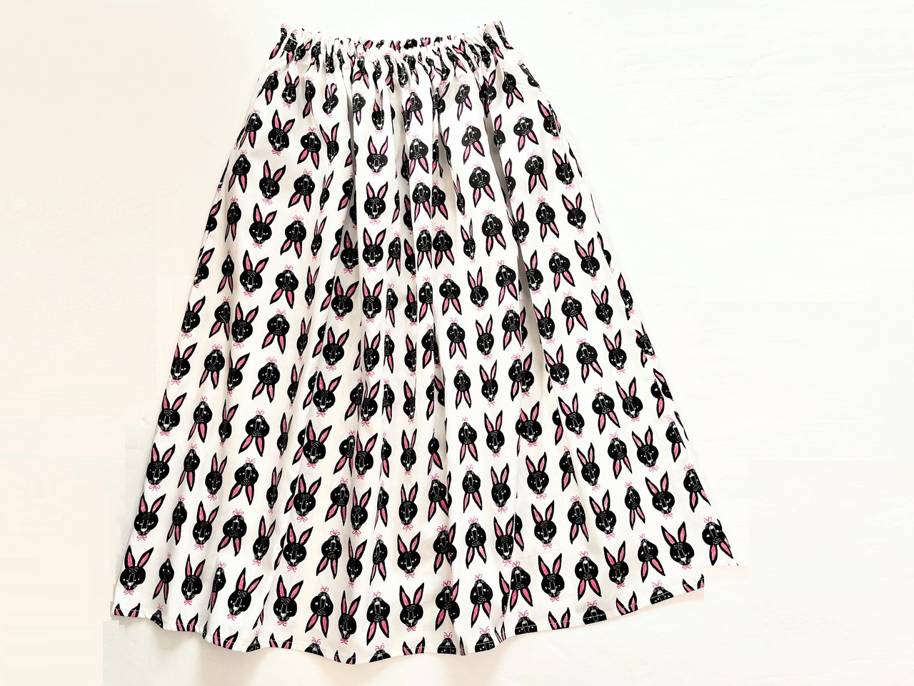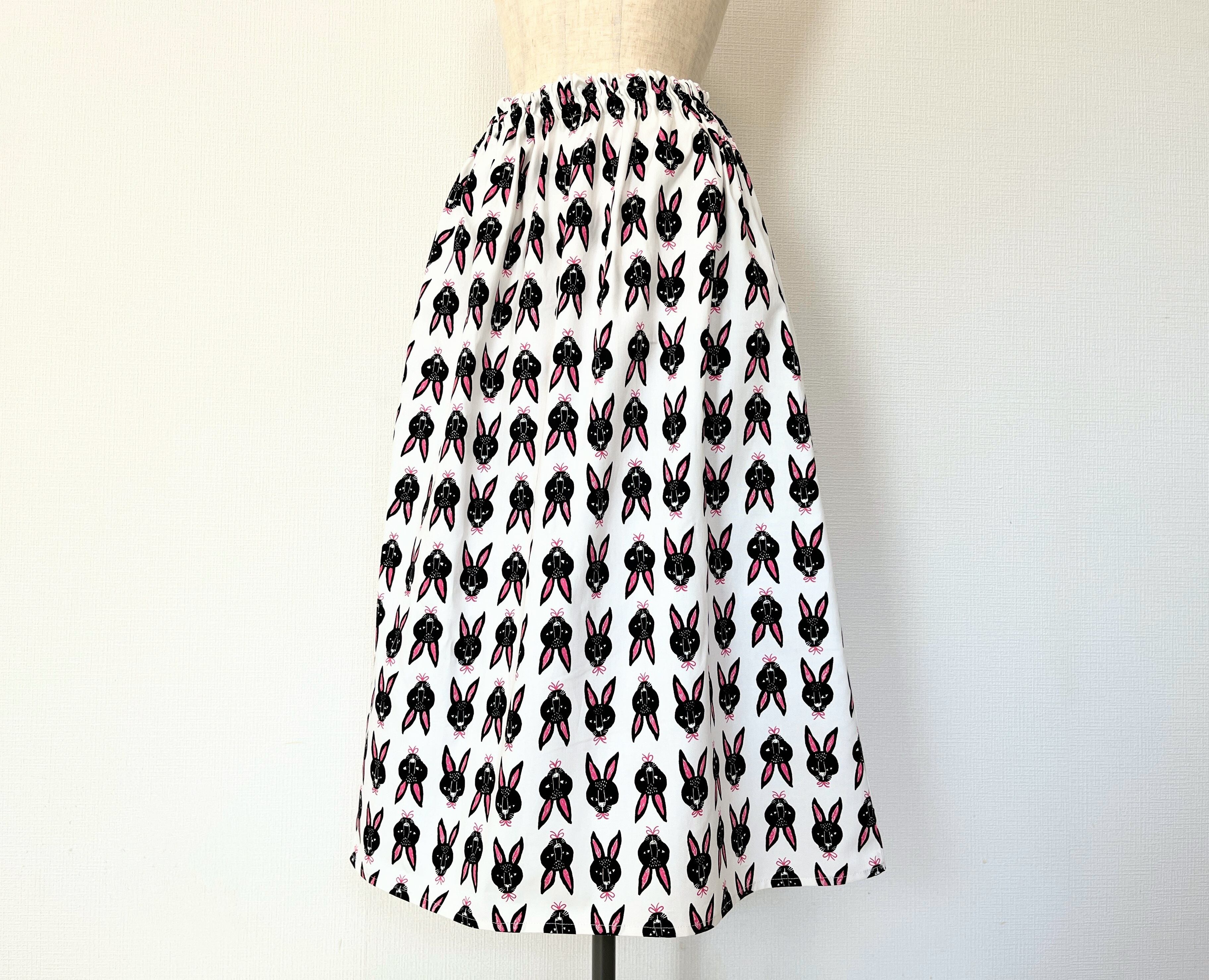 北欧*黒うさぎ柄ロングスカート*ポケット付*ウエストゴム*国産コットン100%*ホワイト×ピンク