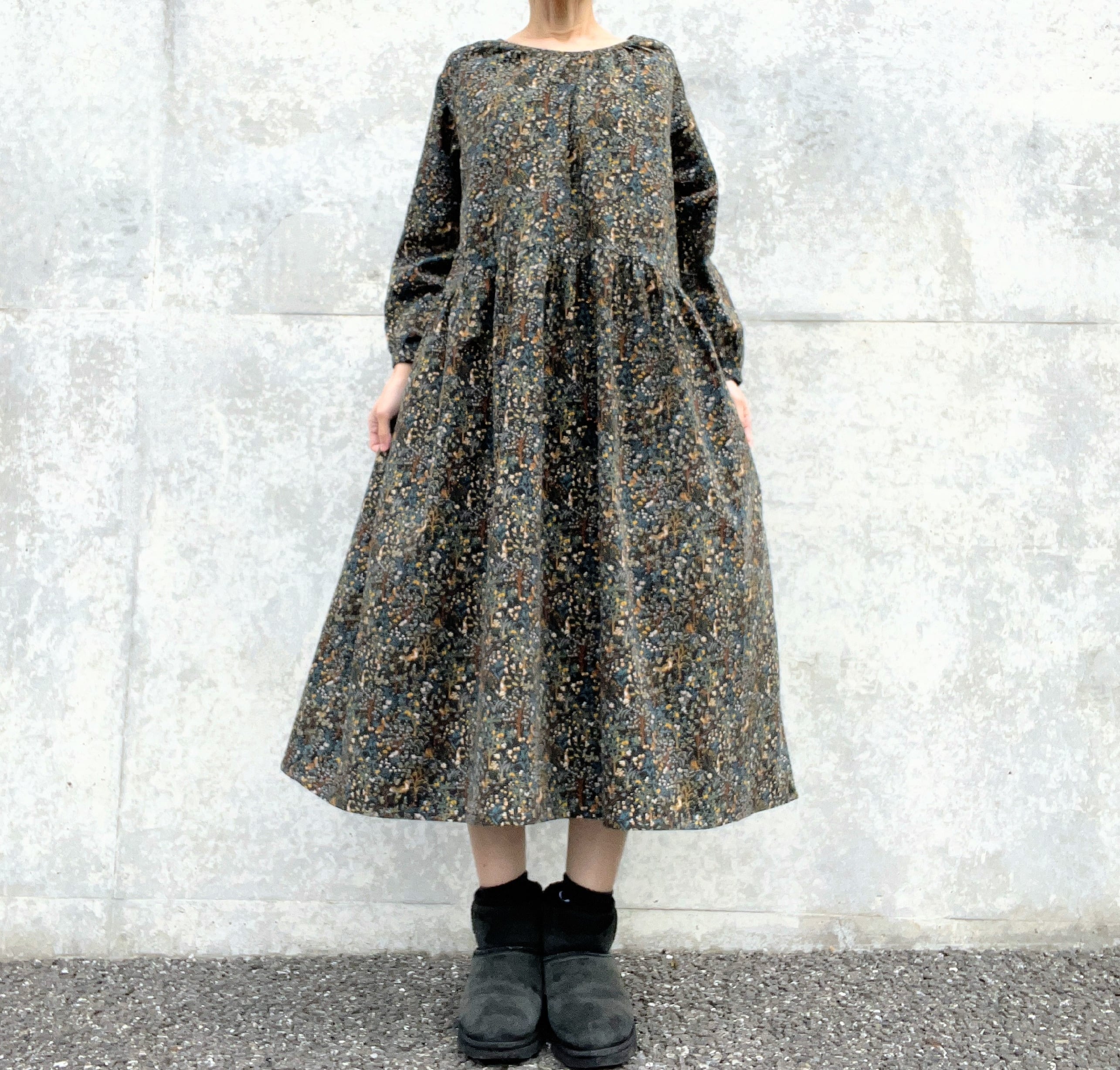 冬支度の森*あったかコーデュロイの長袖ワンピース*ポケット付*綿100%*キツネ小鳥ツリーうさぎリス草花柄