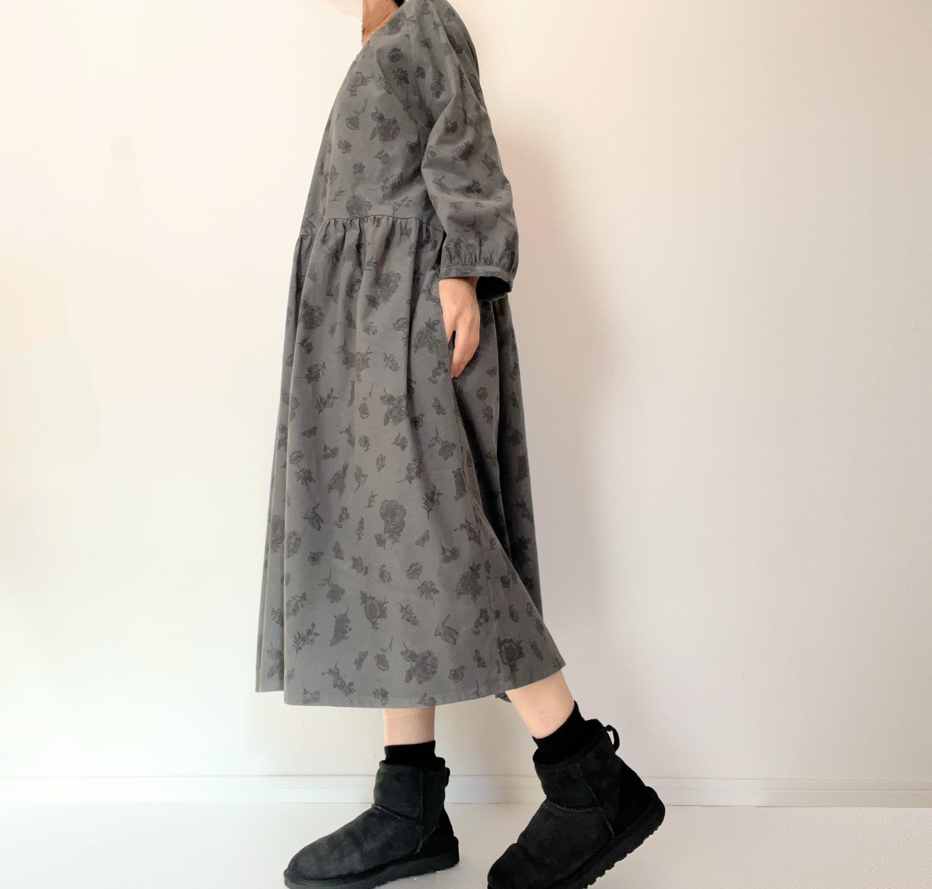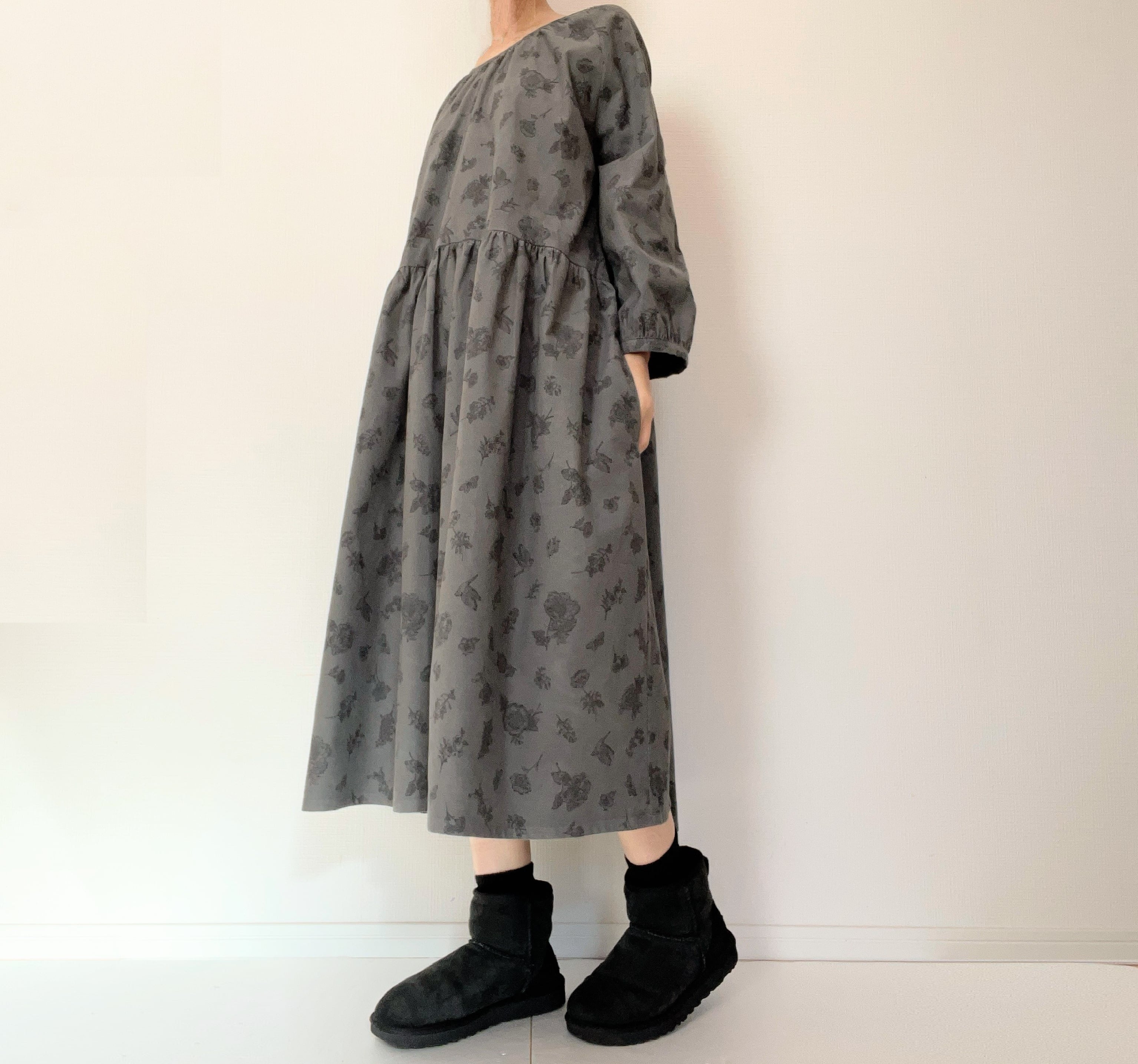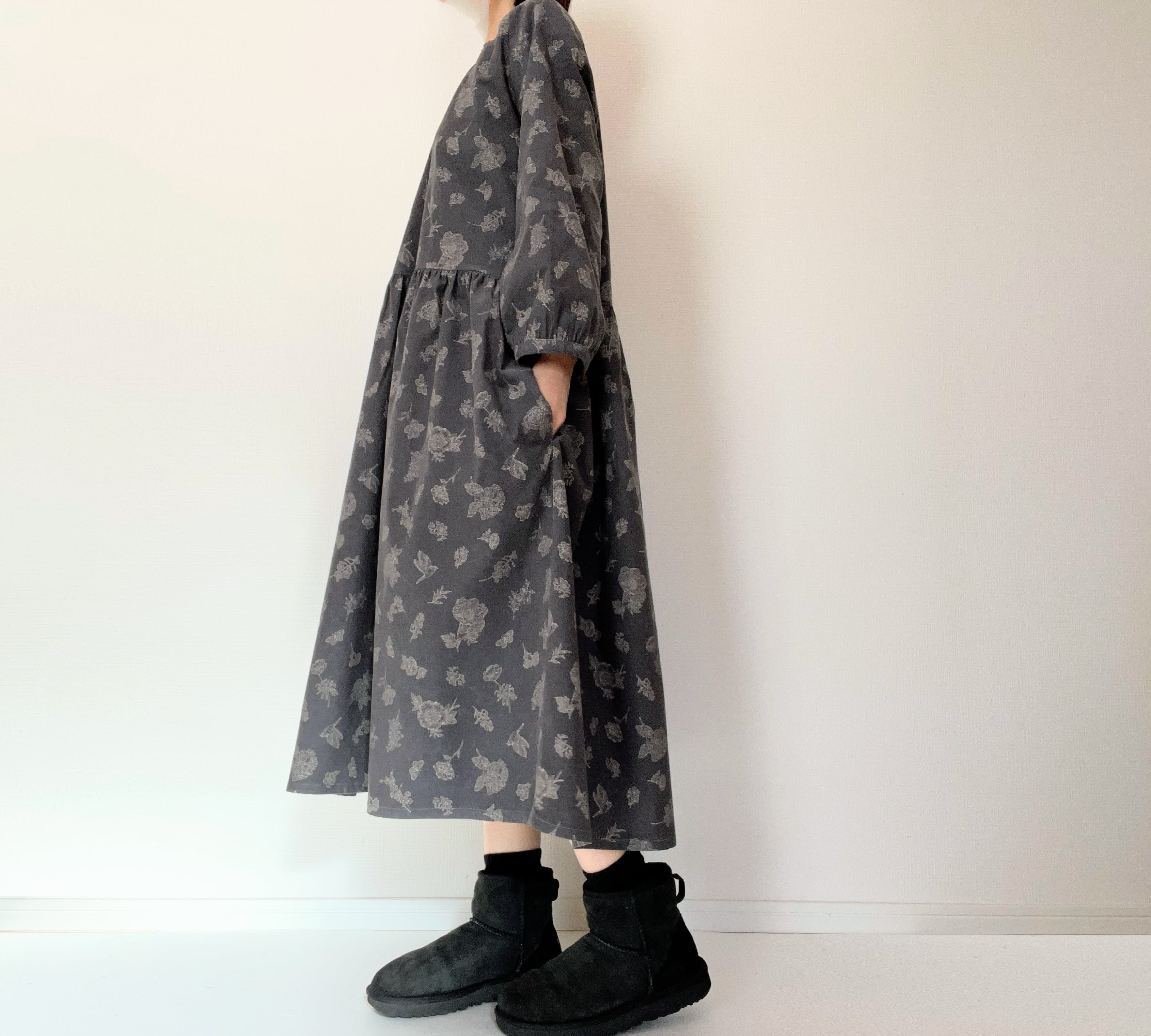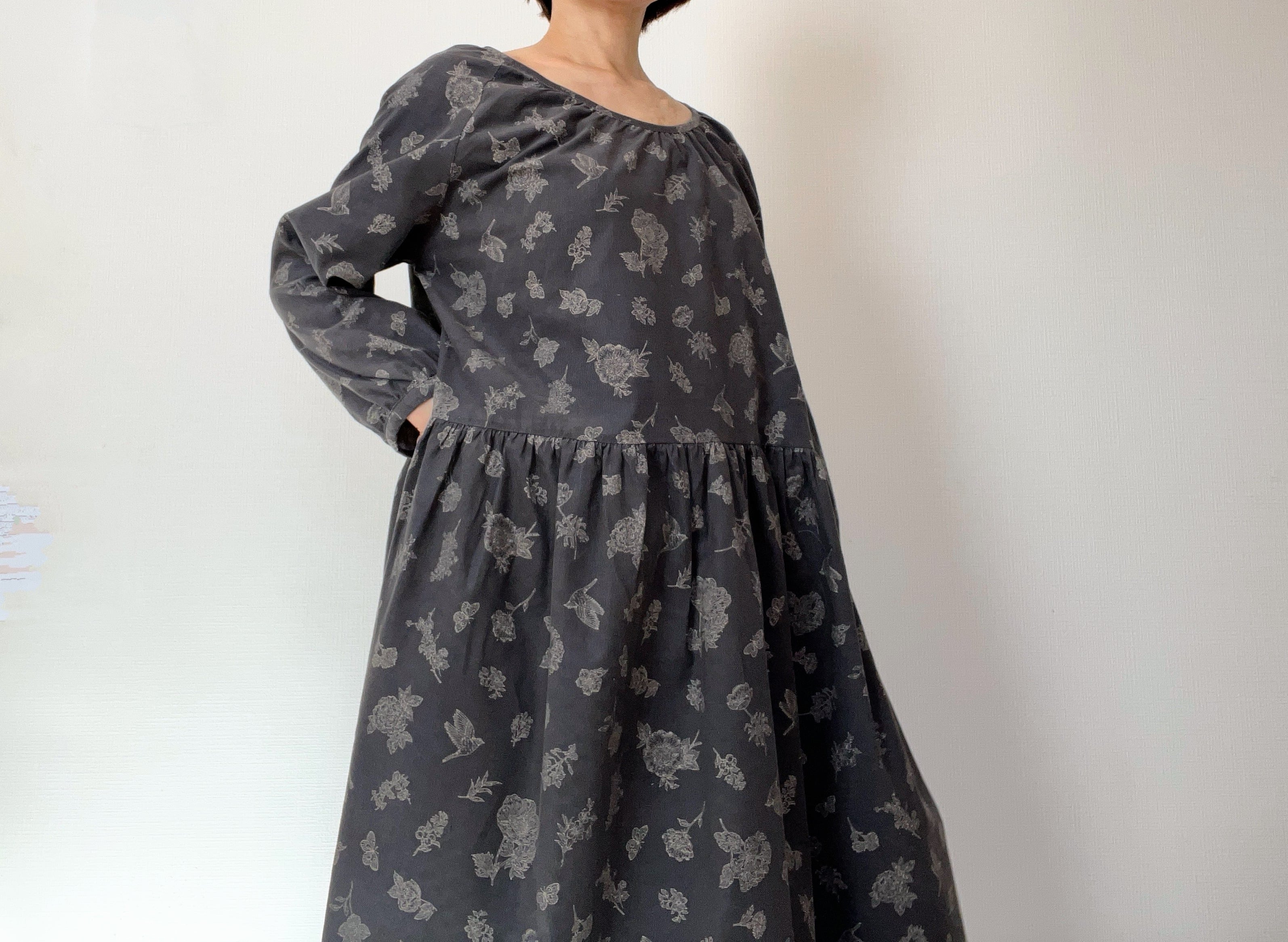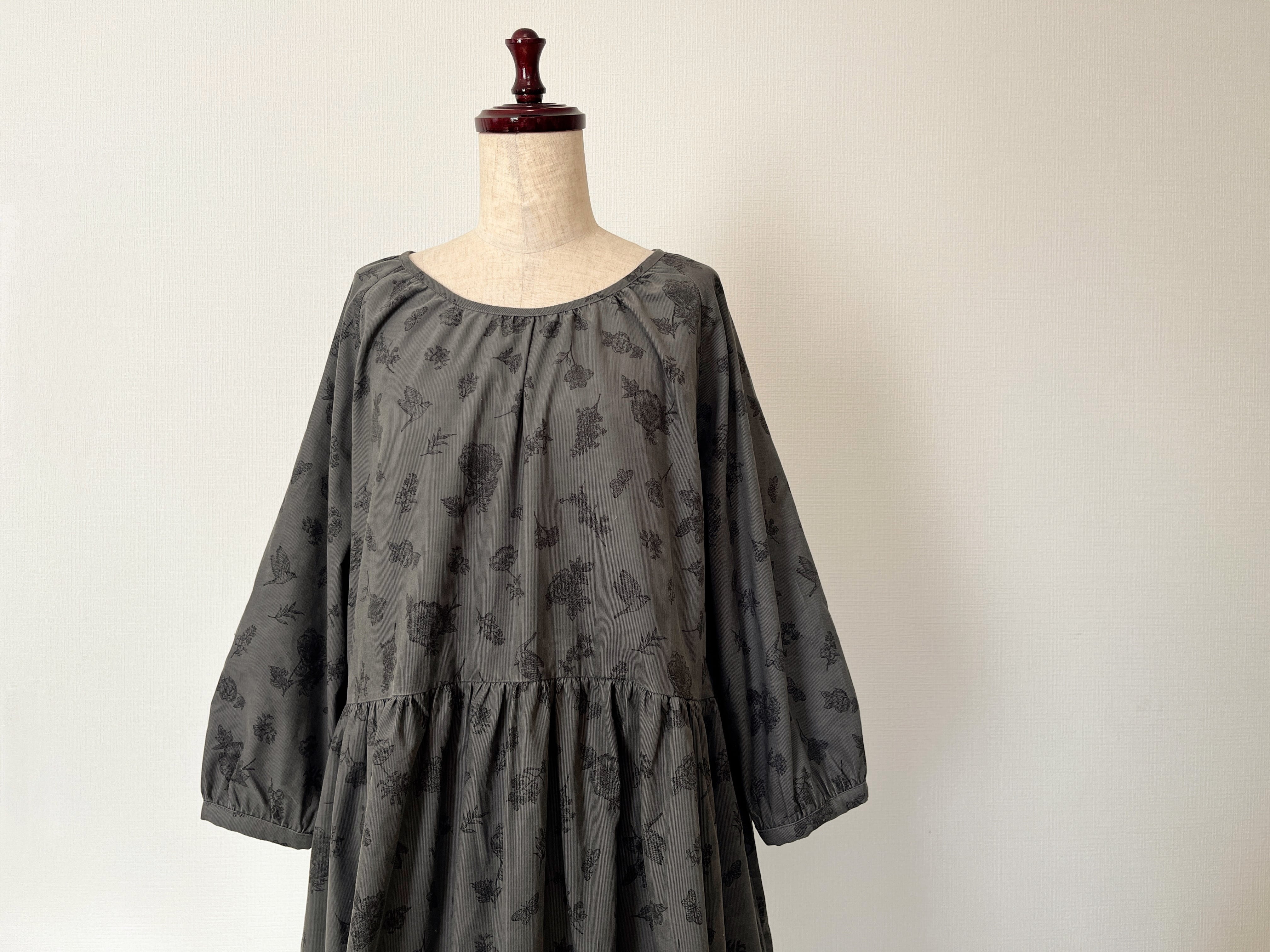 クラシカルな小鳥と草花柄*あったかコーデュロイ*大人のナチュラル長袖ワンピース*ポケット付*綿100%