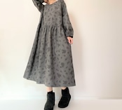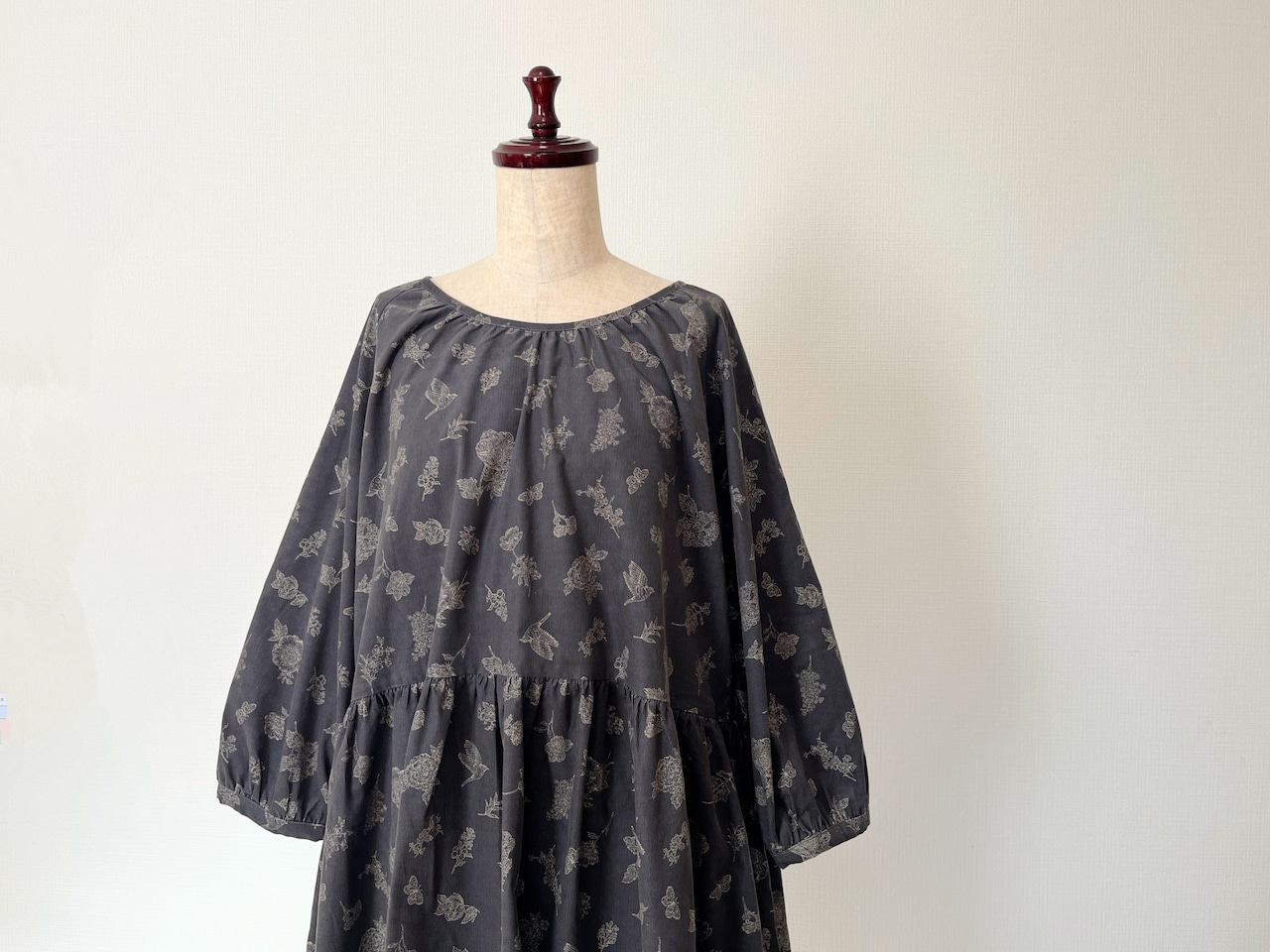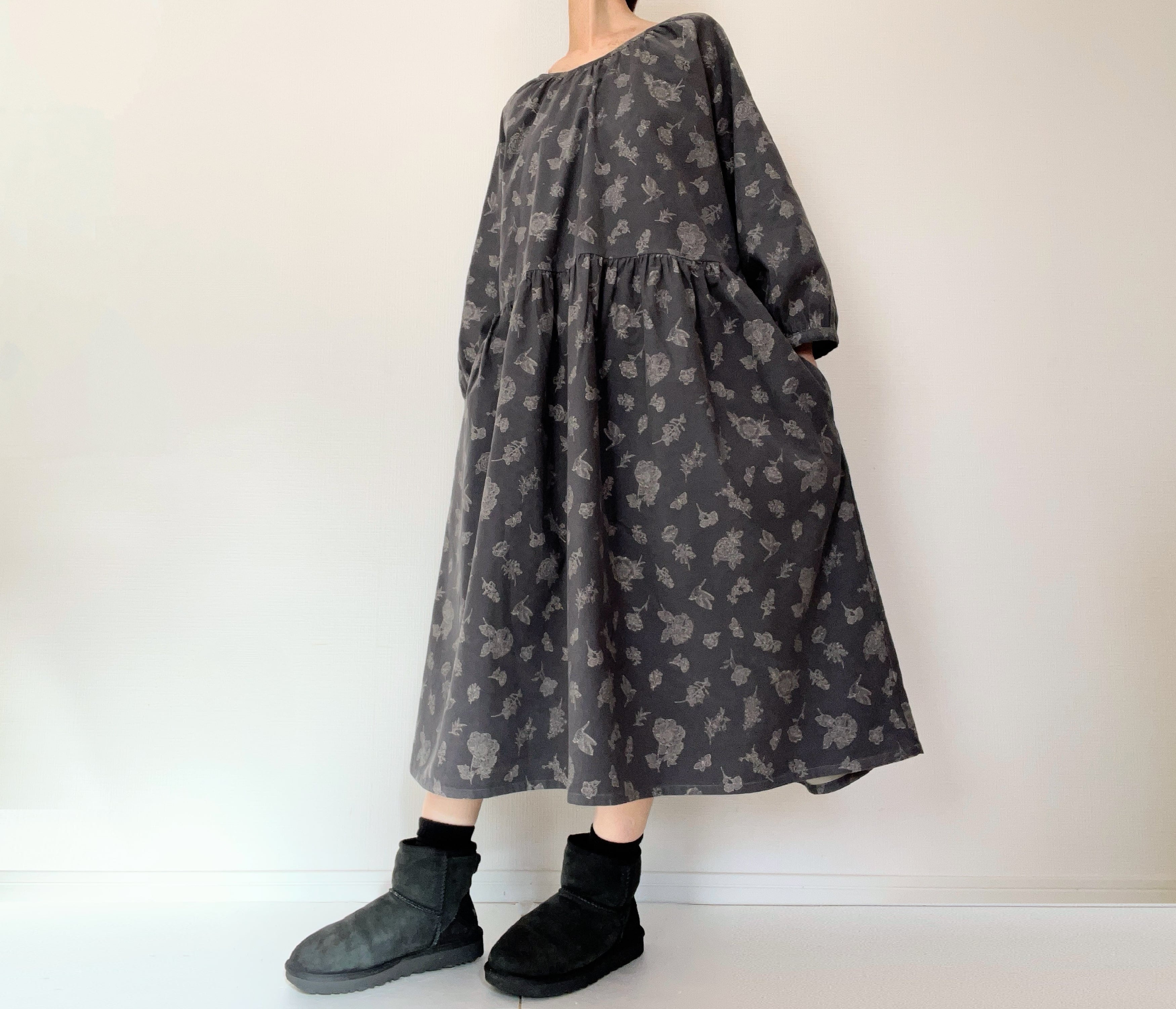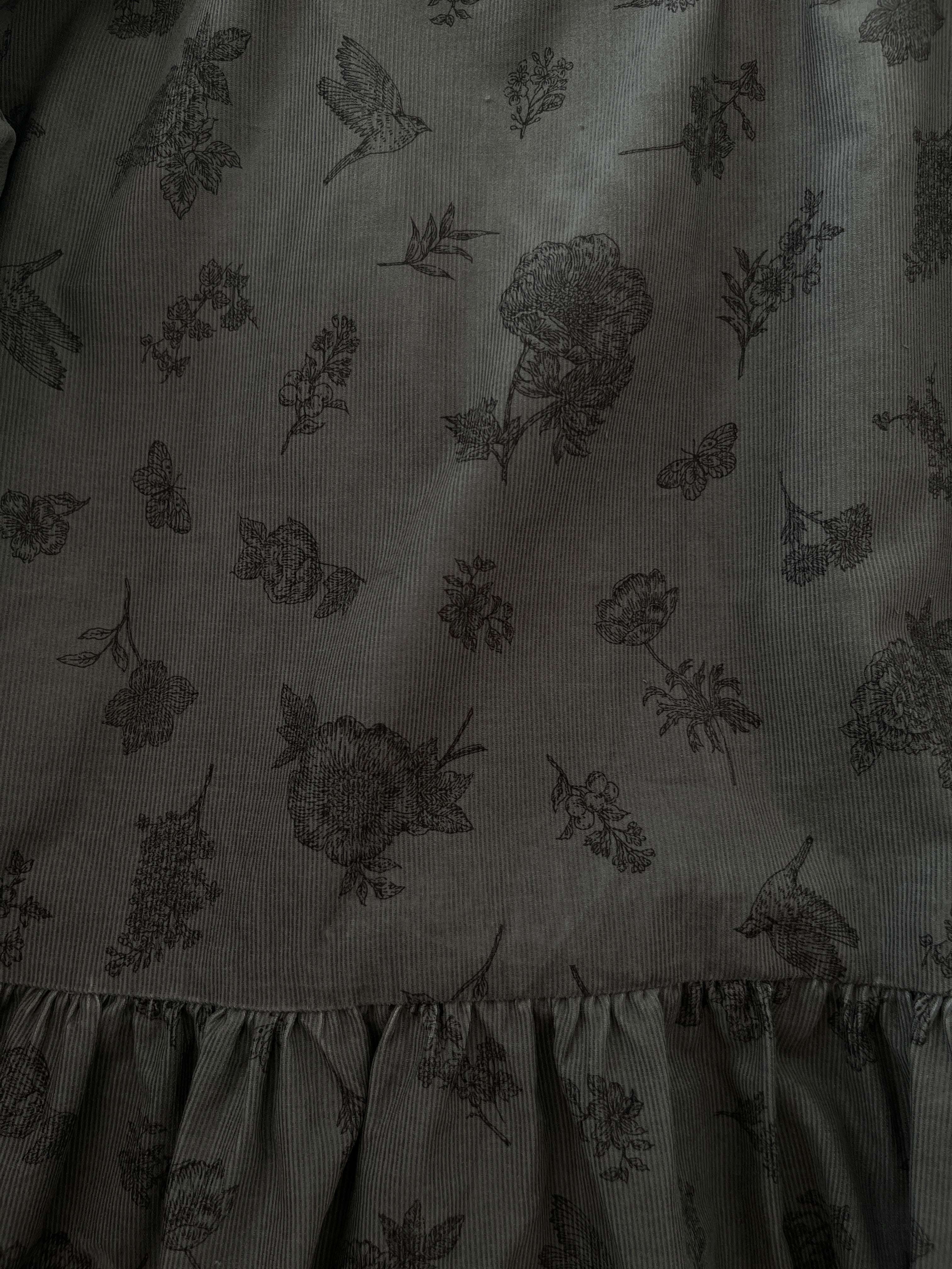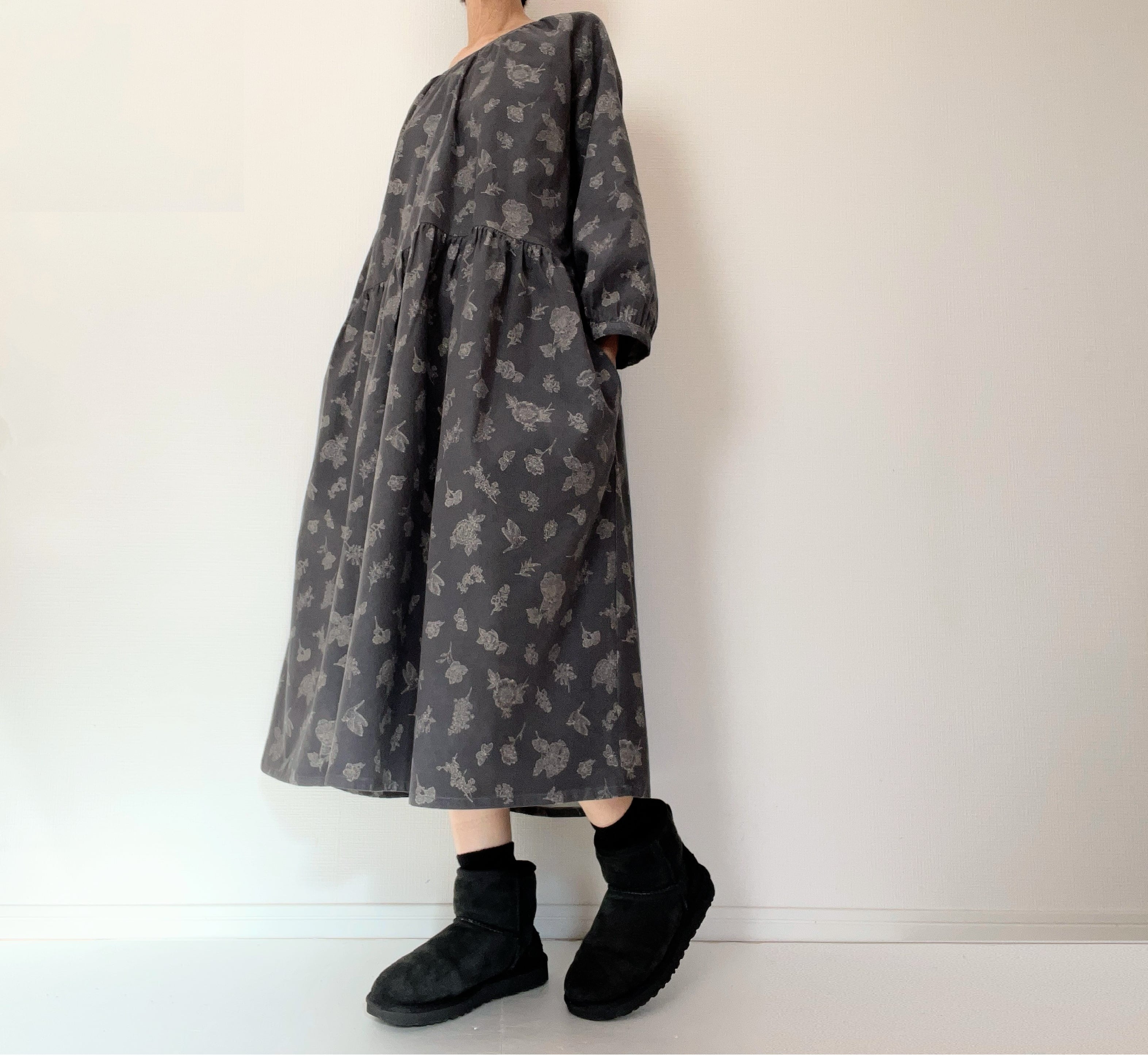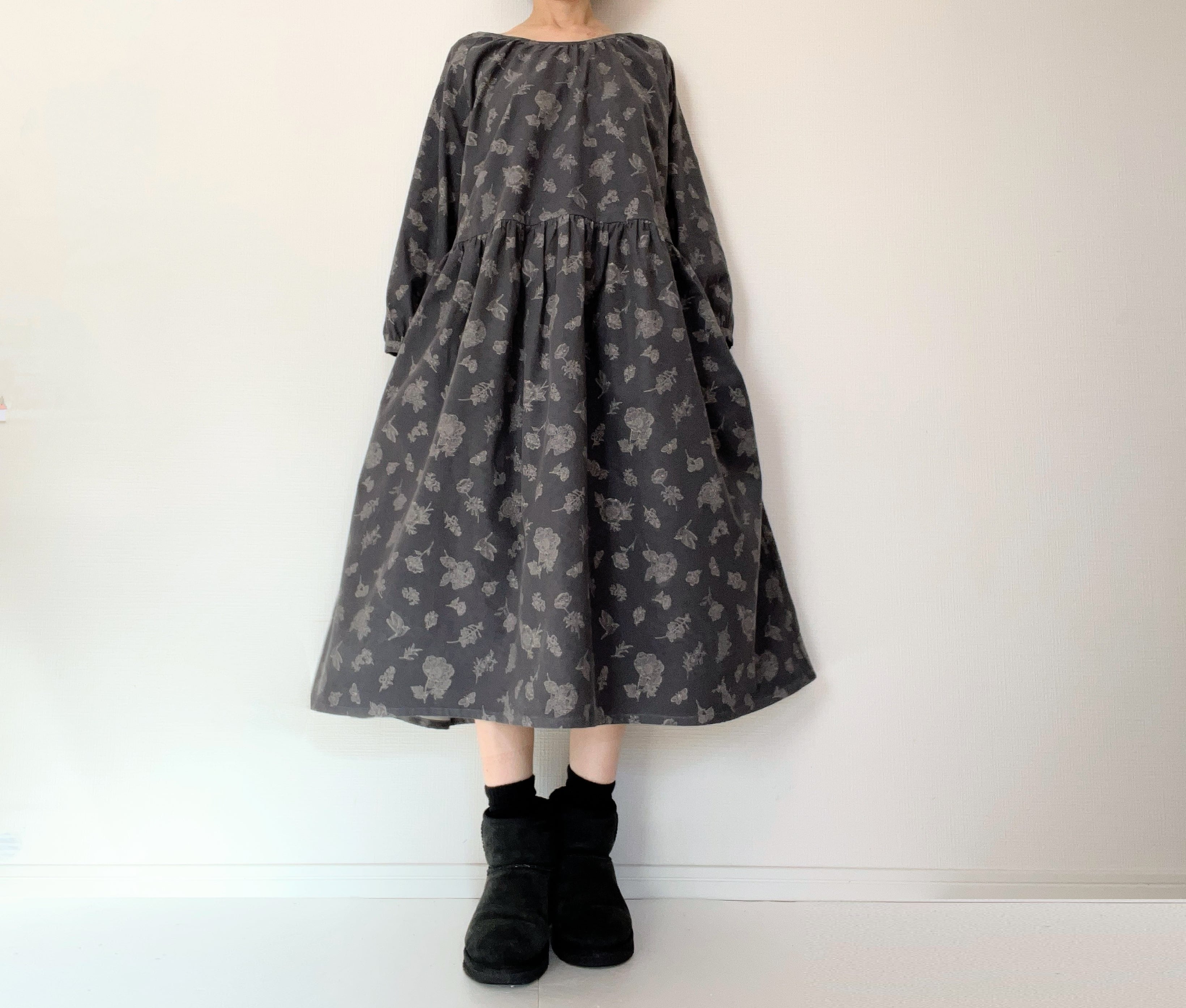 クラシカルな小鳥と草花柄*あったかコーデュロイ*大人のナチュラル長袖ワンピース*ポケット付*綿100%
