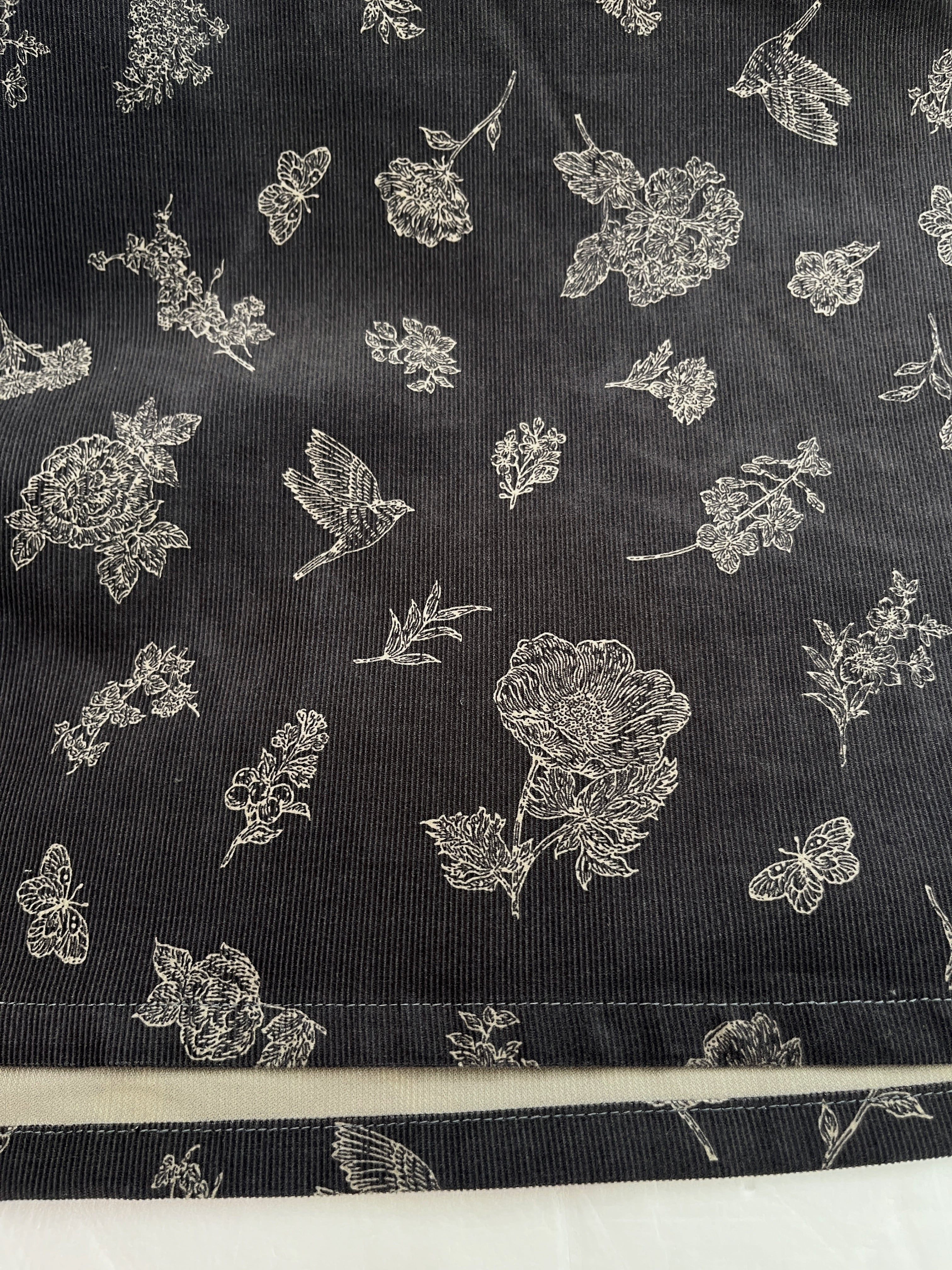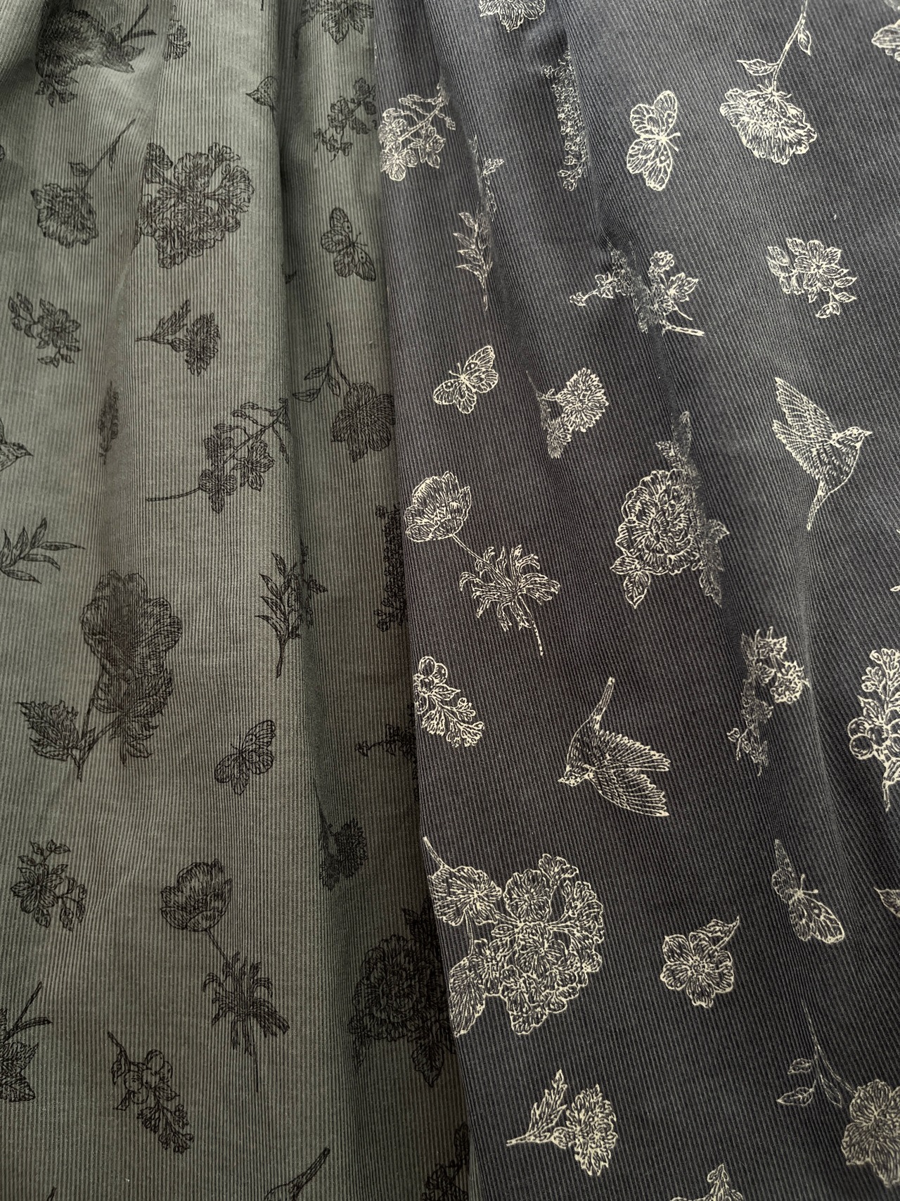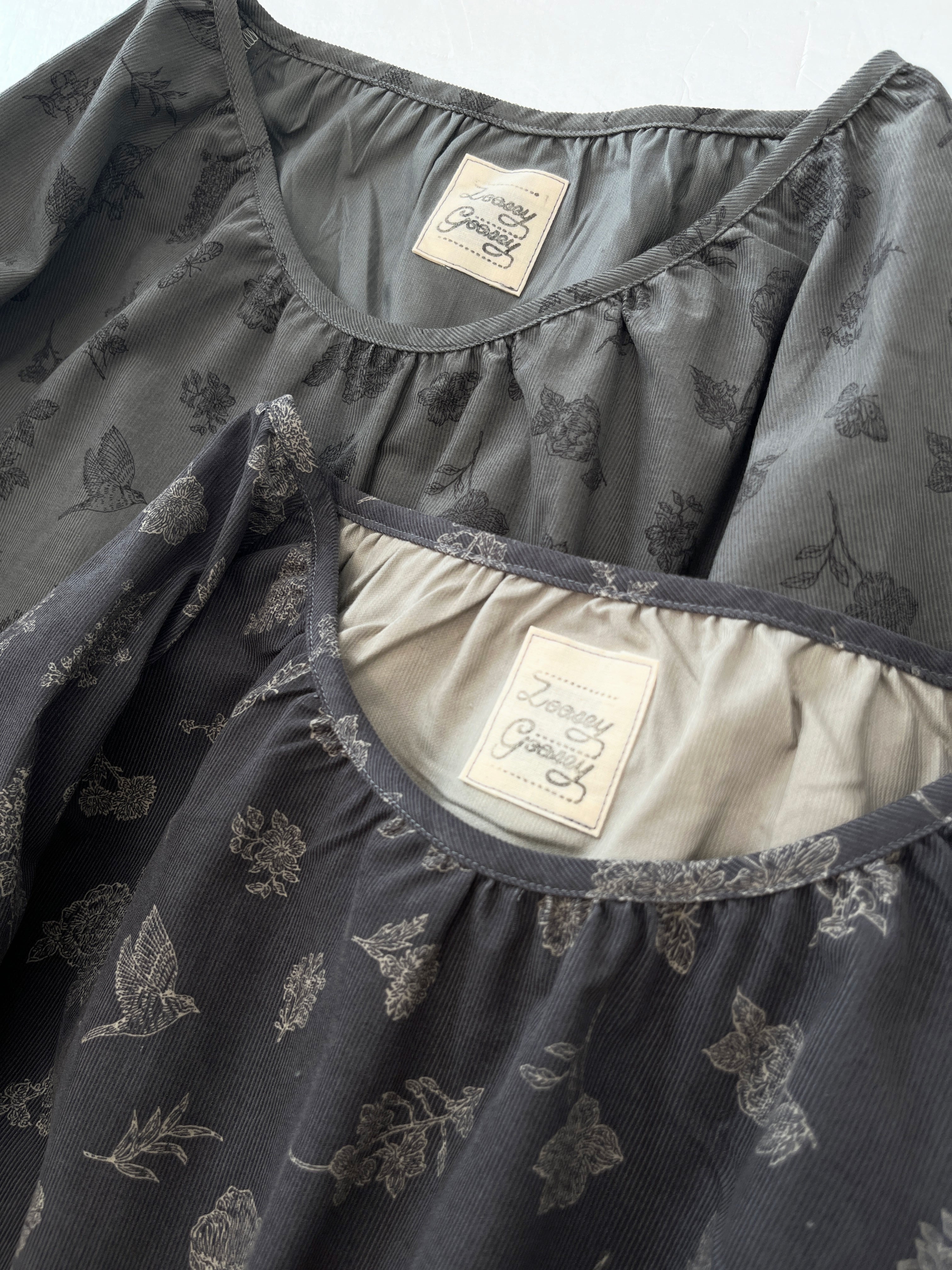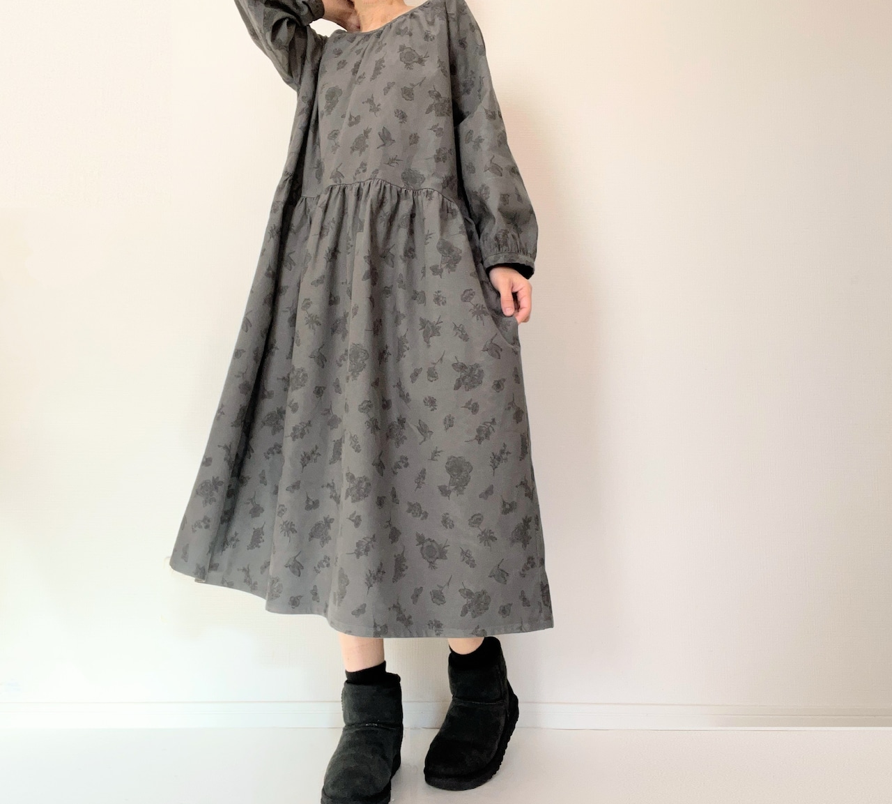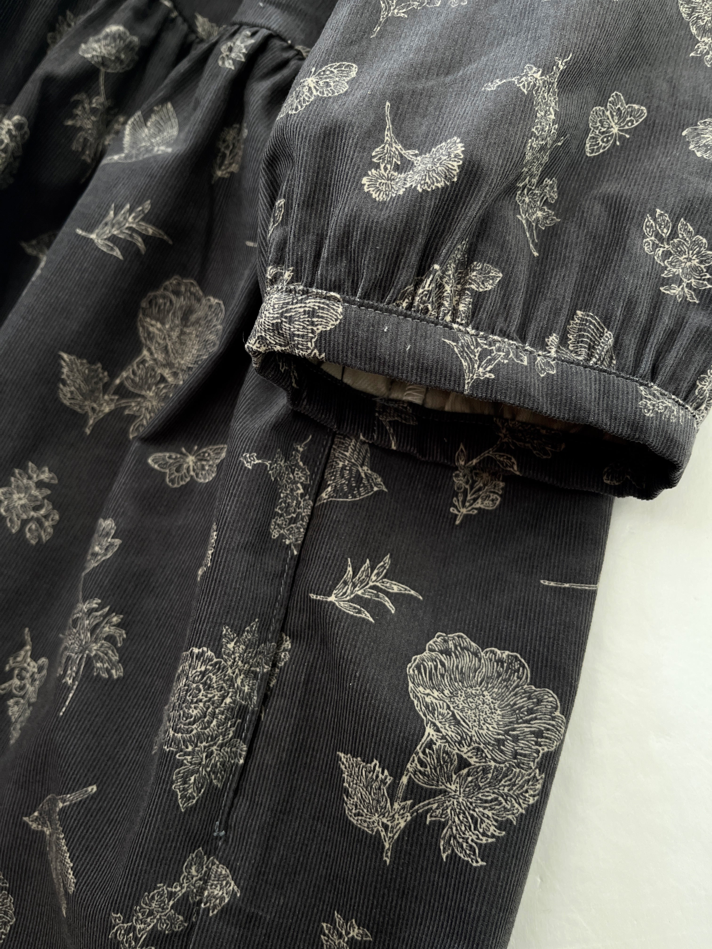 クラシカルな小鳥と草花柄*あったかコーデュロイ*大人のナチュラル長袖ワンピース*ポケット付*綿100%