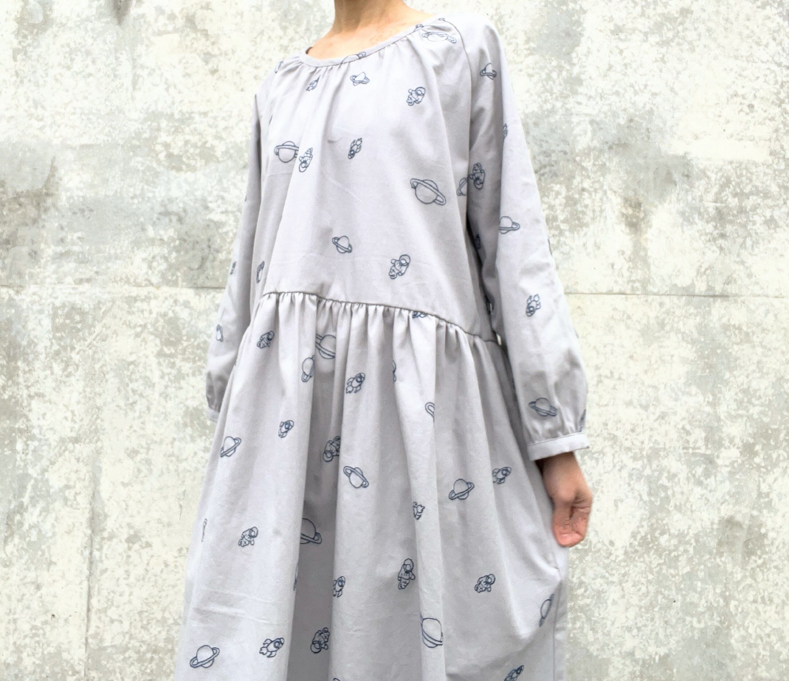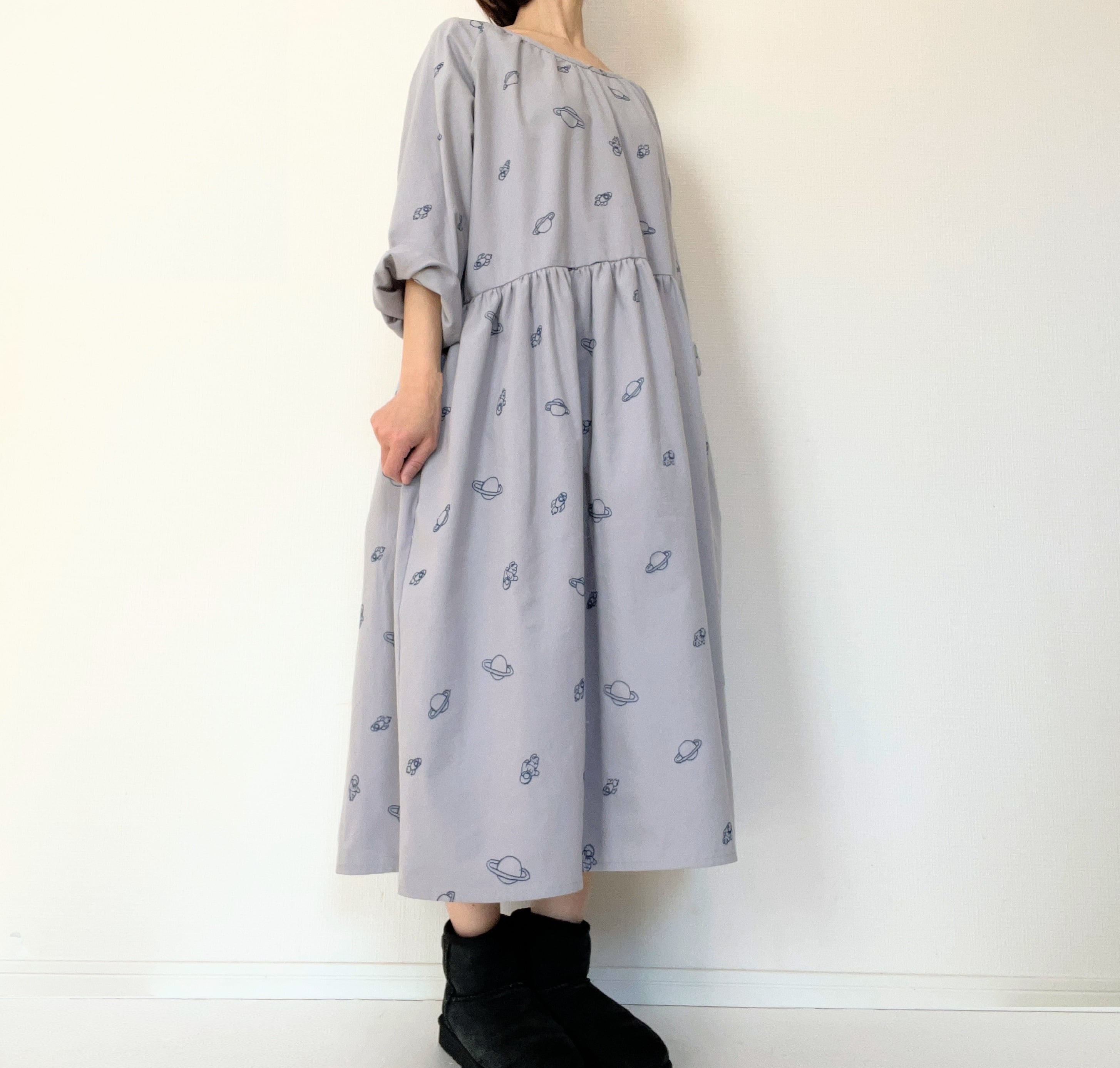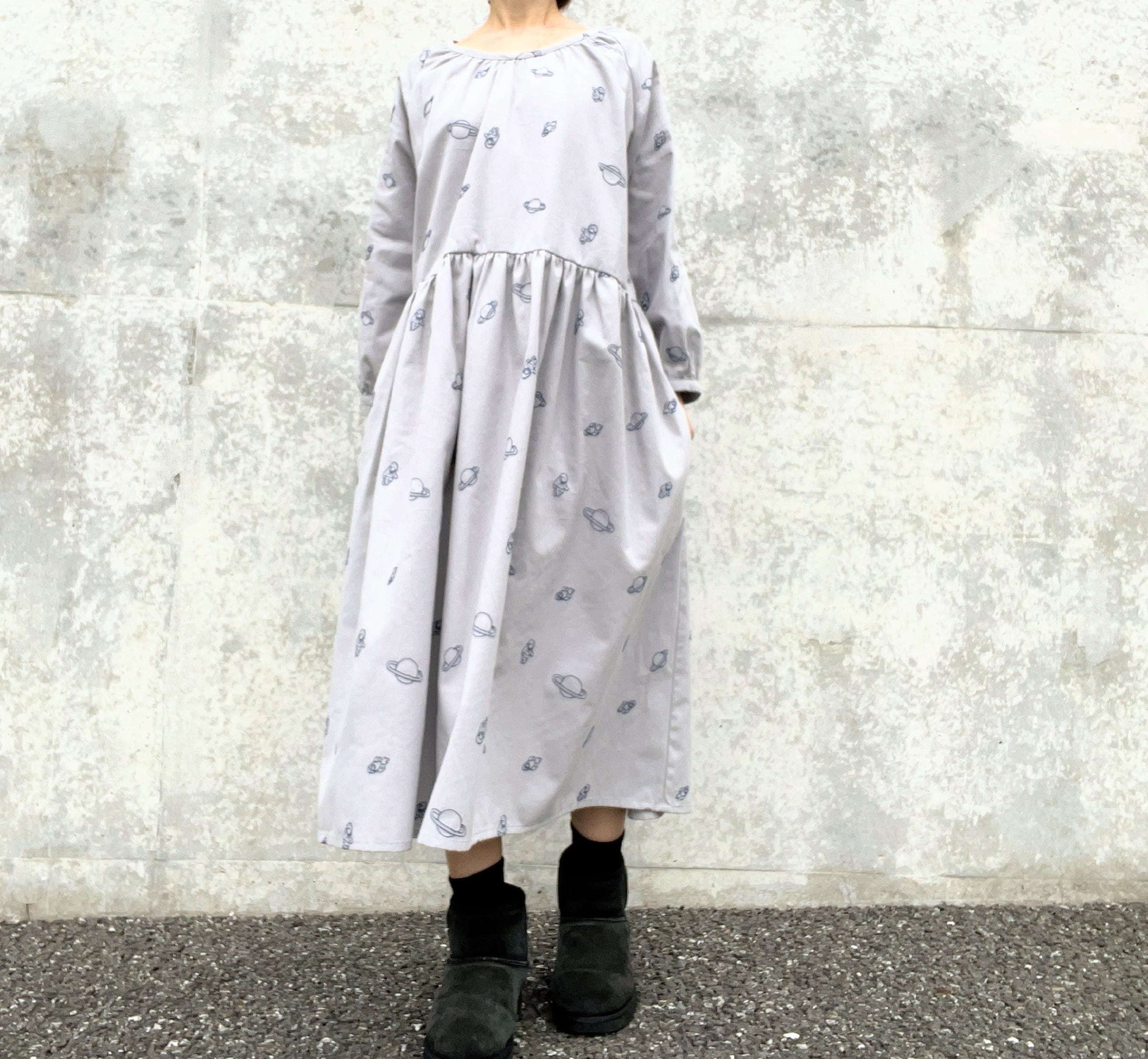 宇宙のひみつワンピース*総刺繍*大人のナチュラルスタイル*土星 宇宙柄*国産綿100%*ポケット付*スモーキーグレー