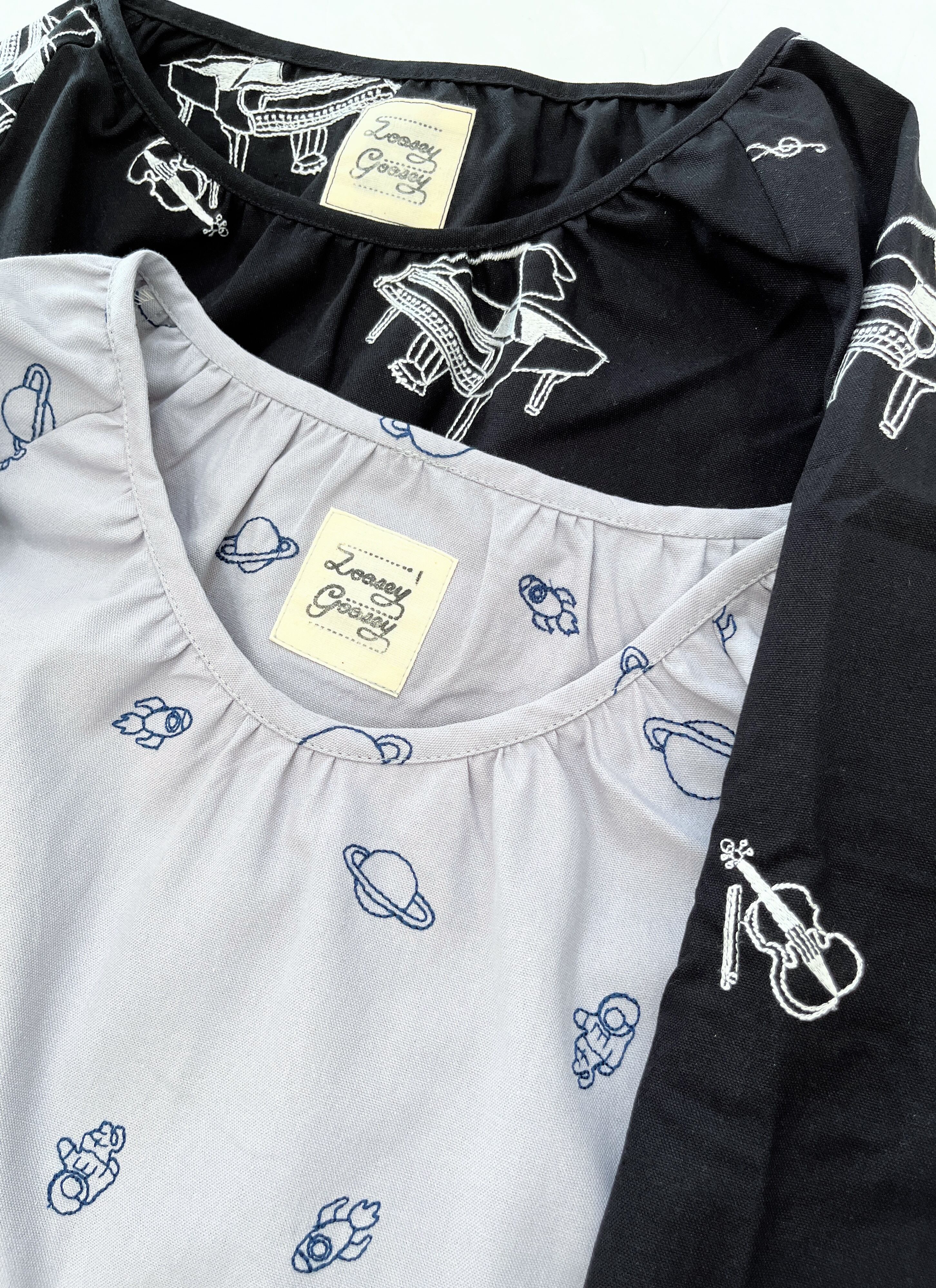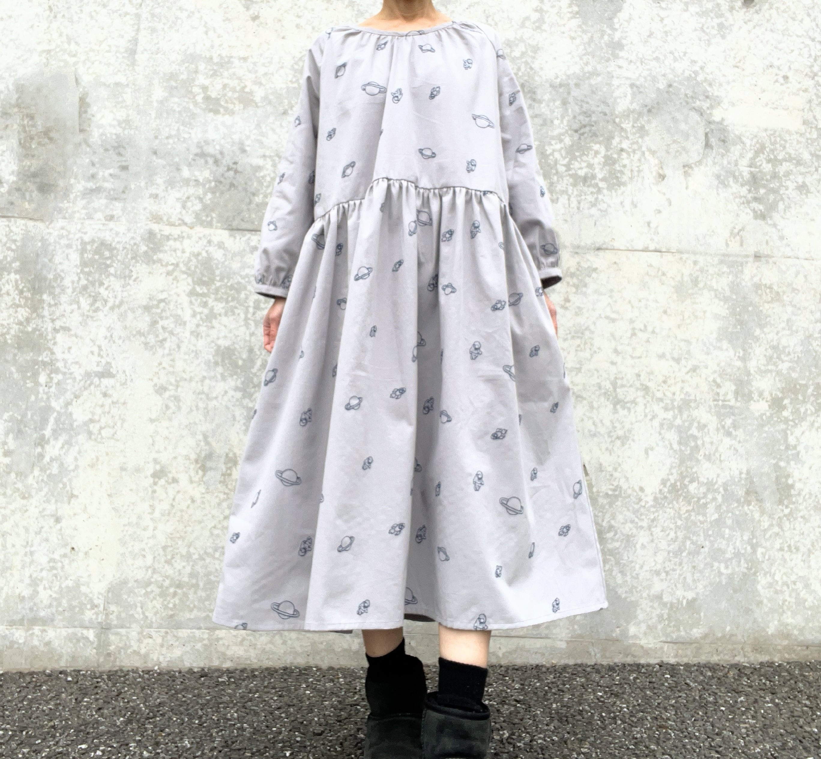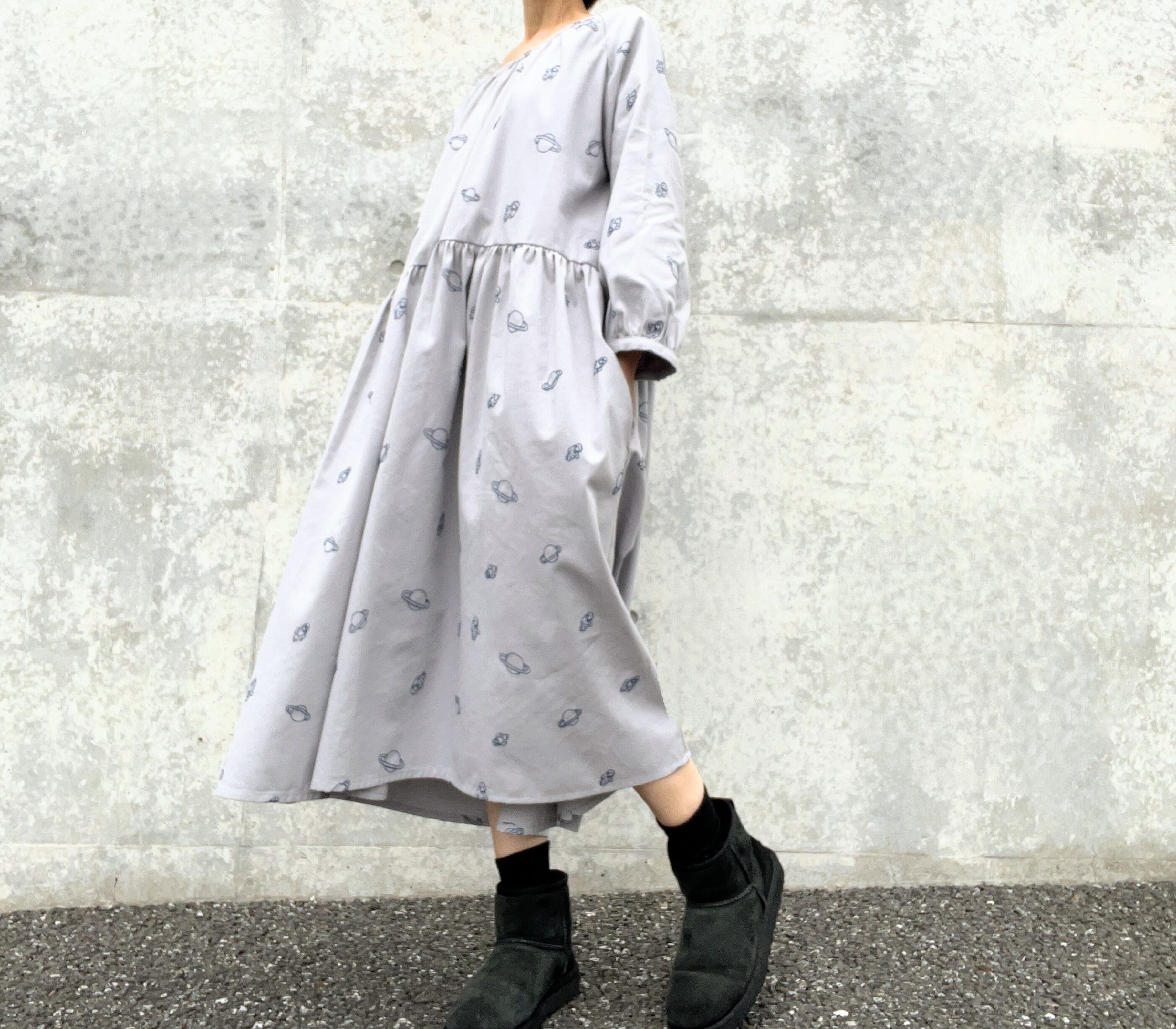 宇宙のひみつワンピース*総刺繍*大人のナチュラルスタイル*土星 宇宙柄*国産綿100%*ポケット付*スモーキーグレー