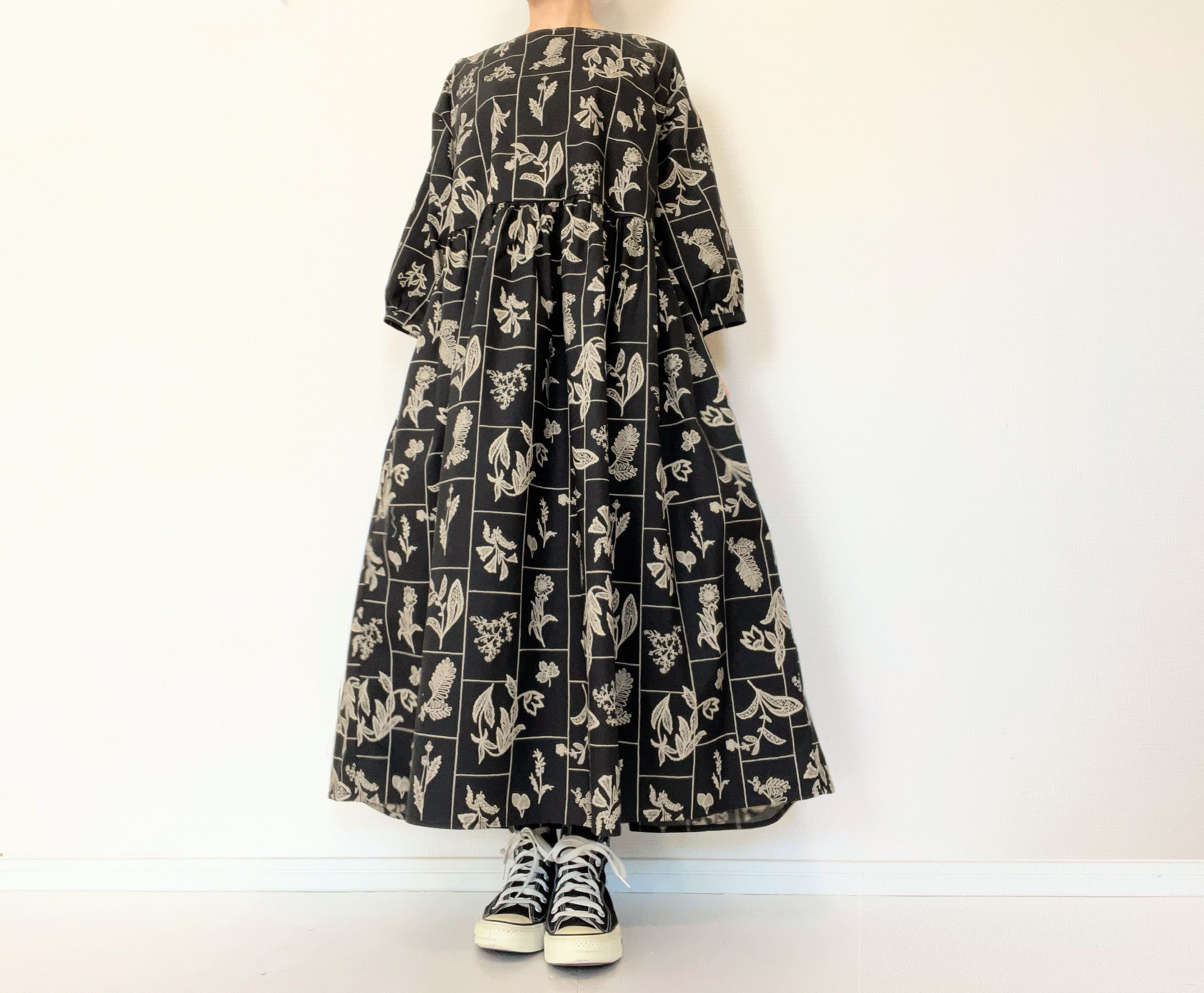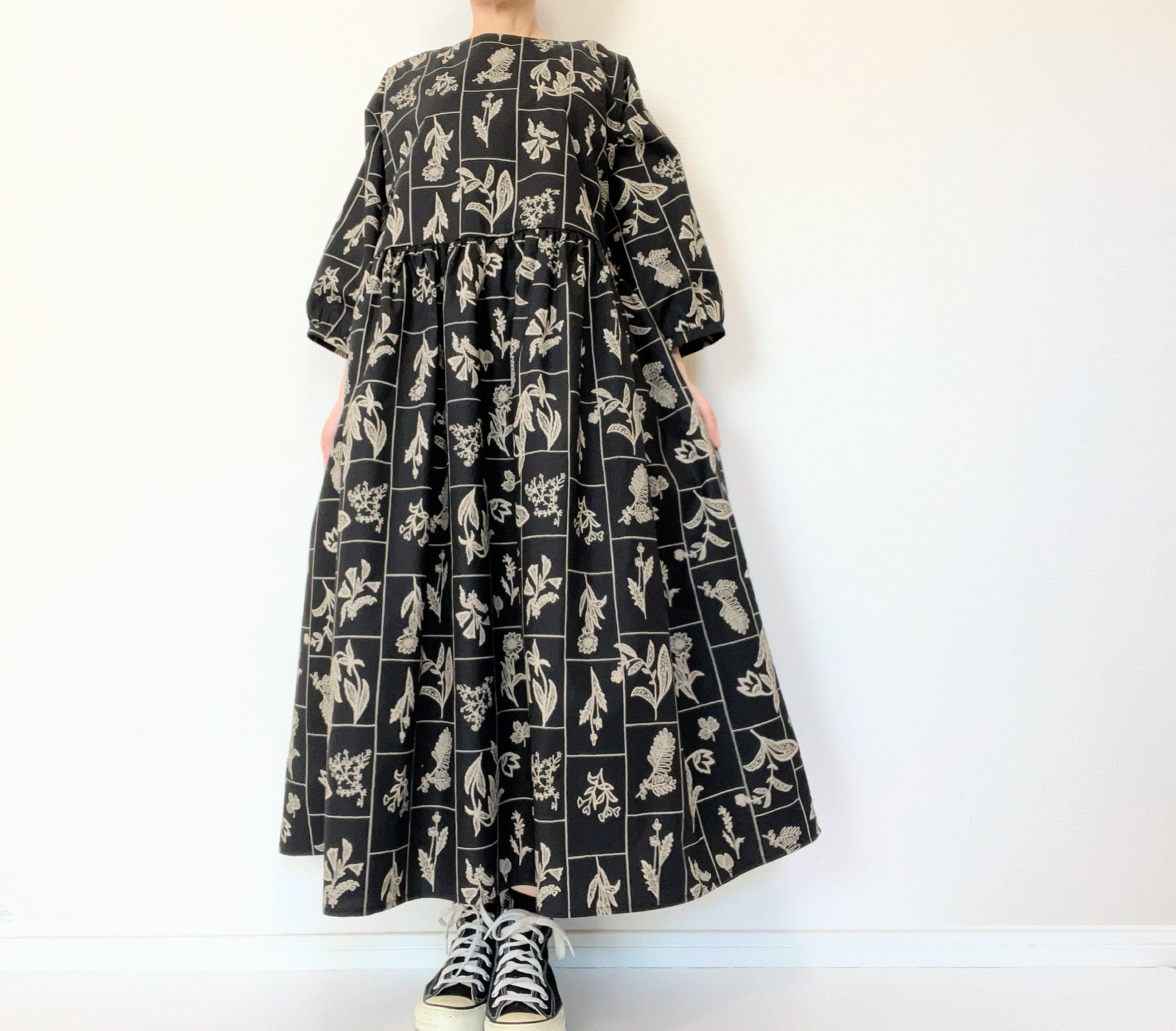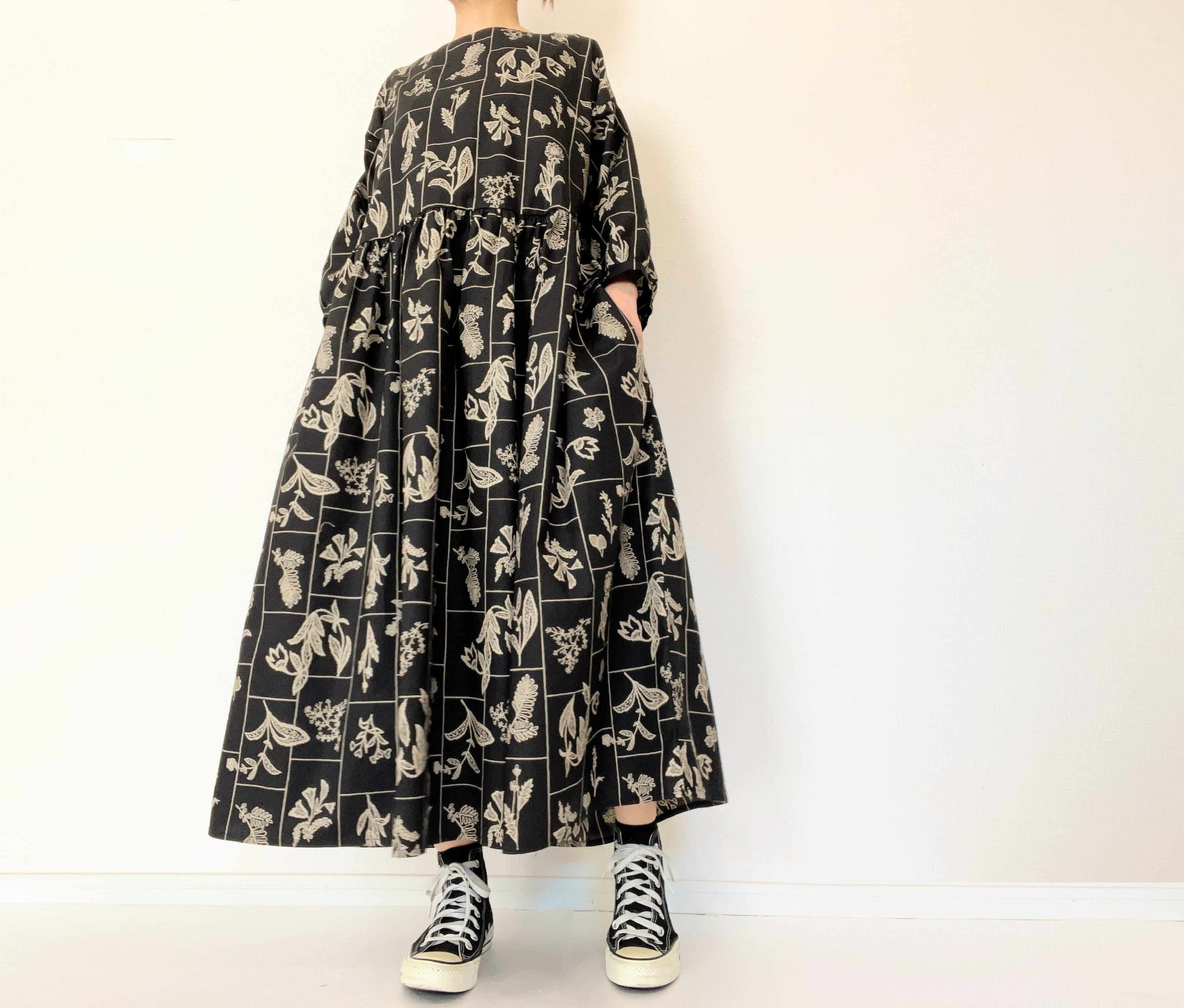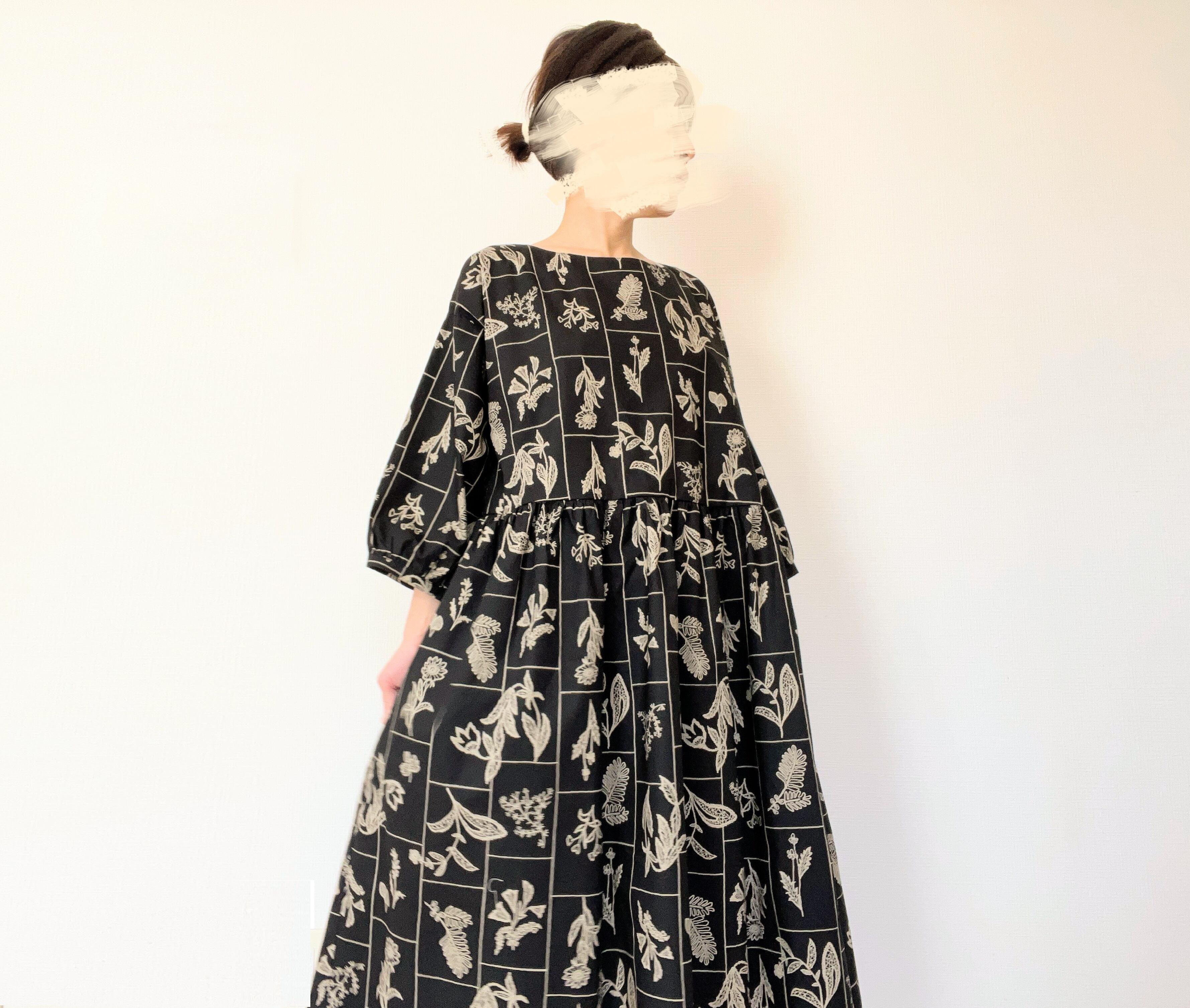 【送料無料】春のブラックワンピース*野の花柄*刺繍調の植物標本*七分袖ゆったりロング丈*国産コットン100%*ポケット付