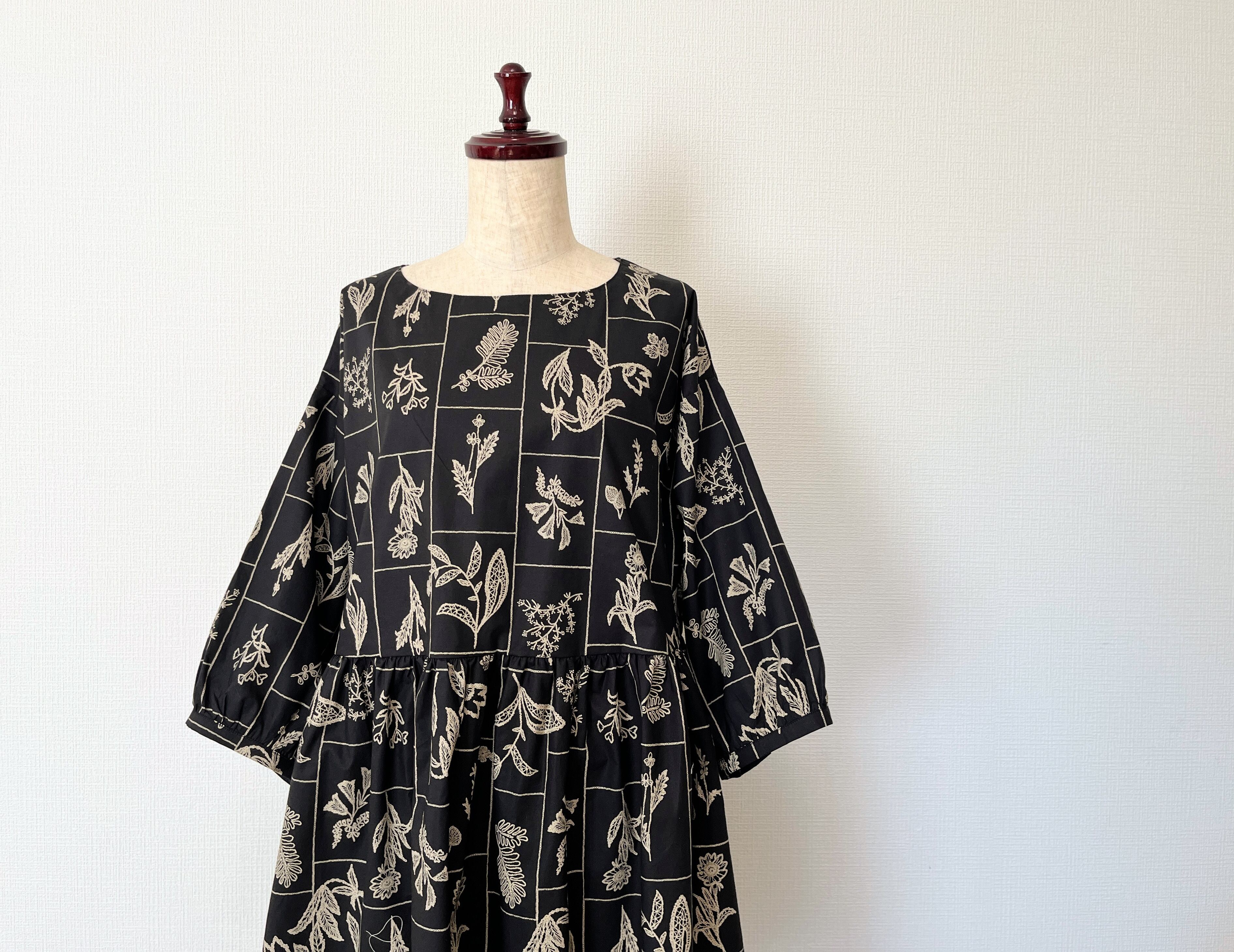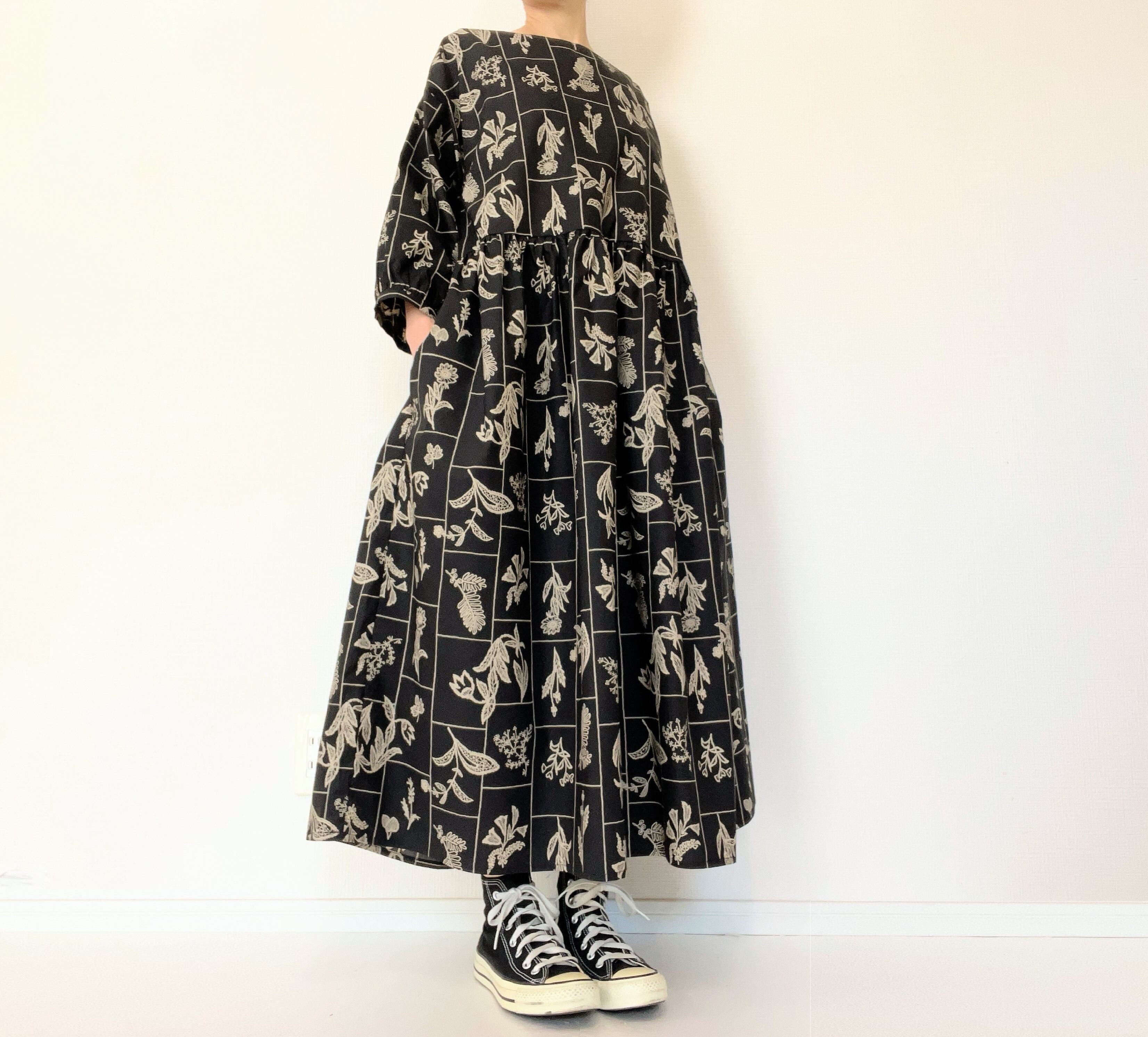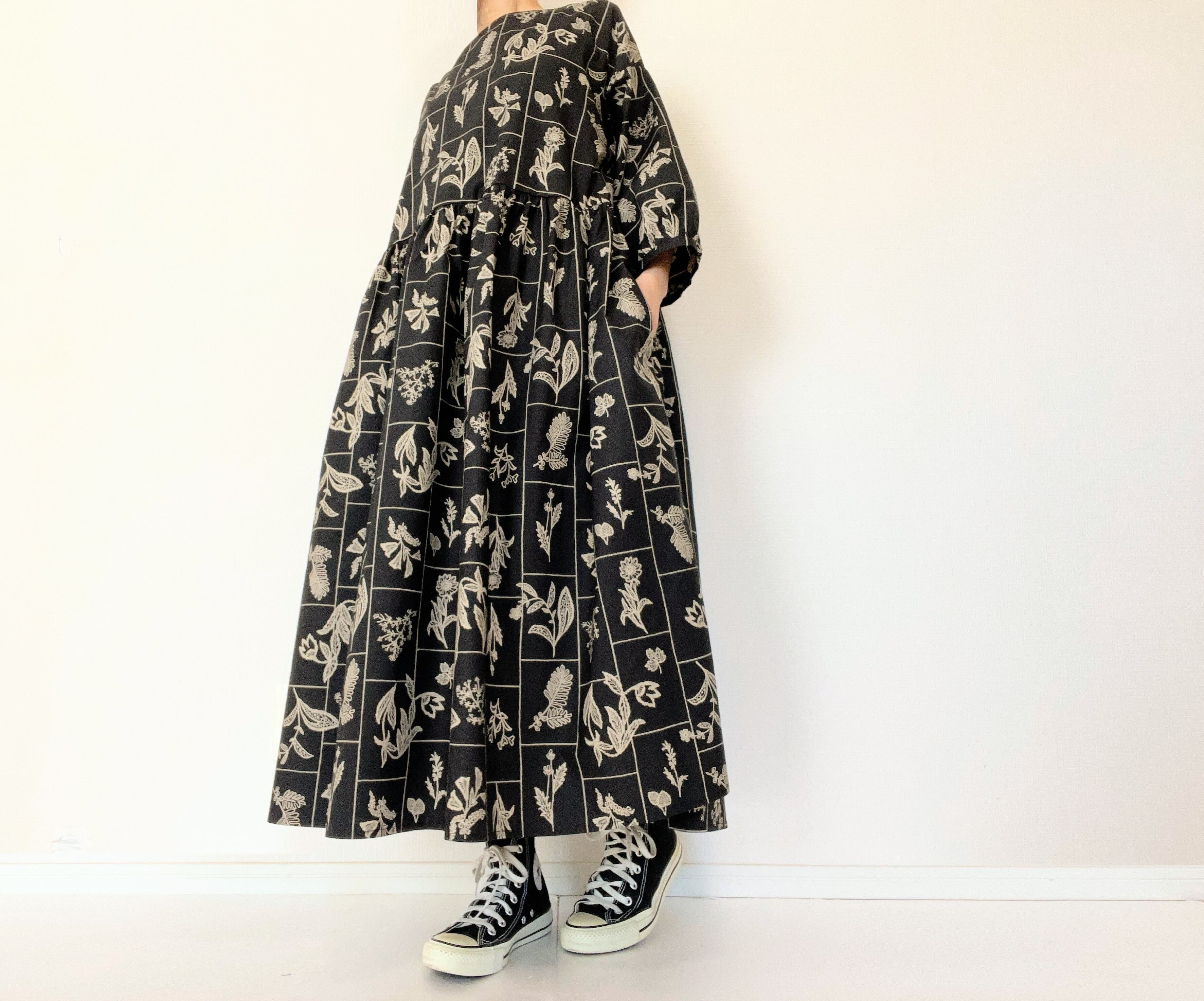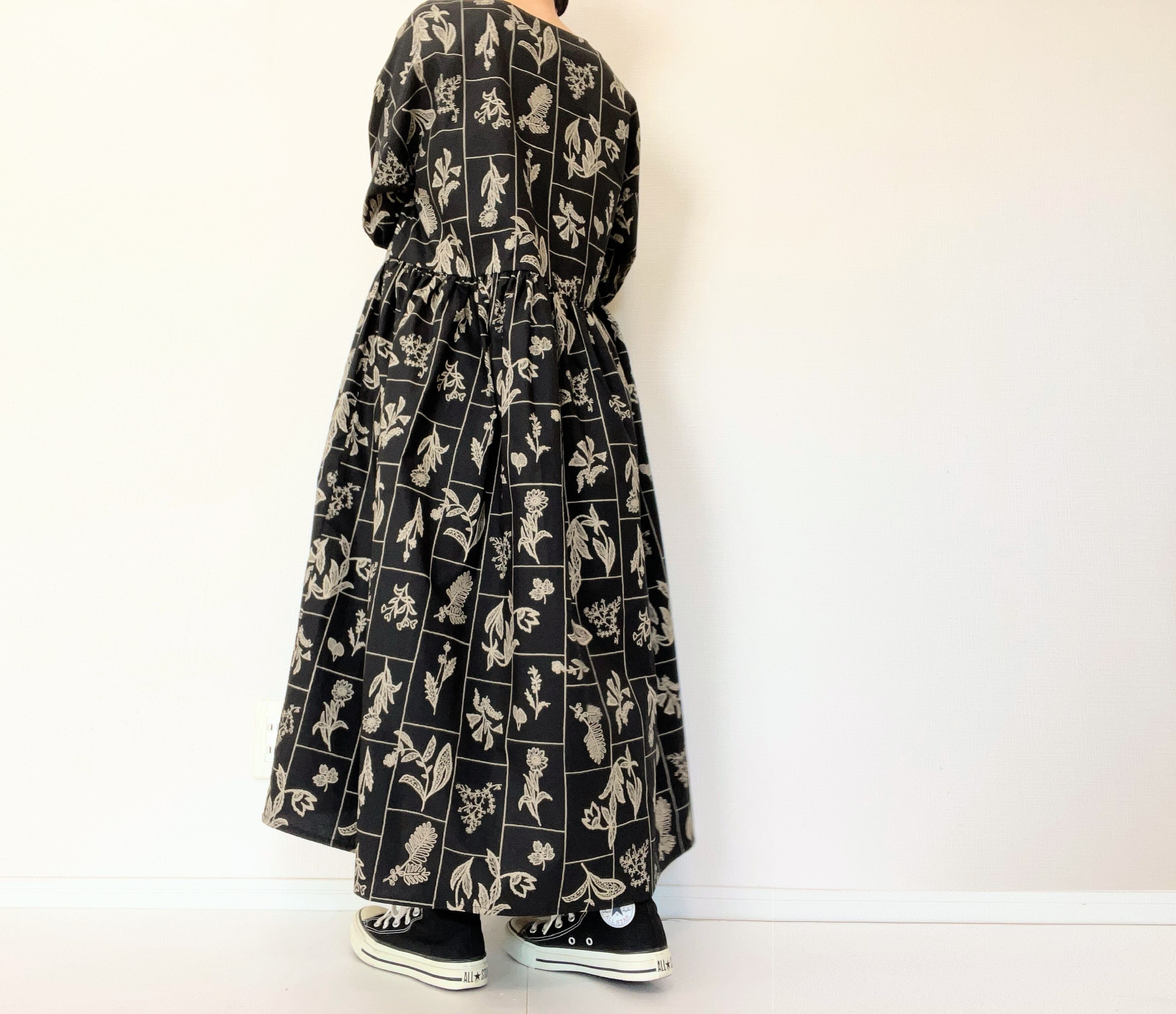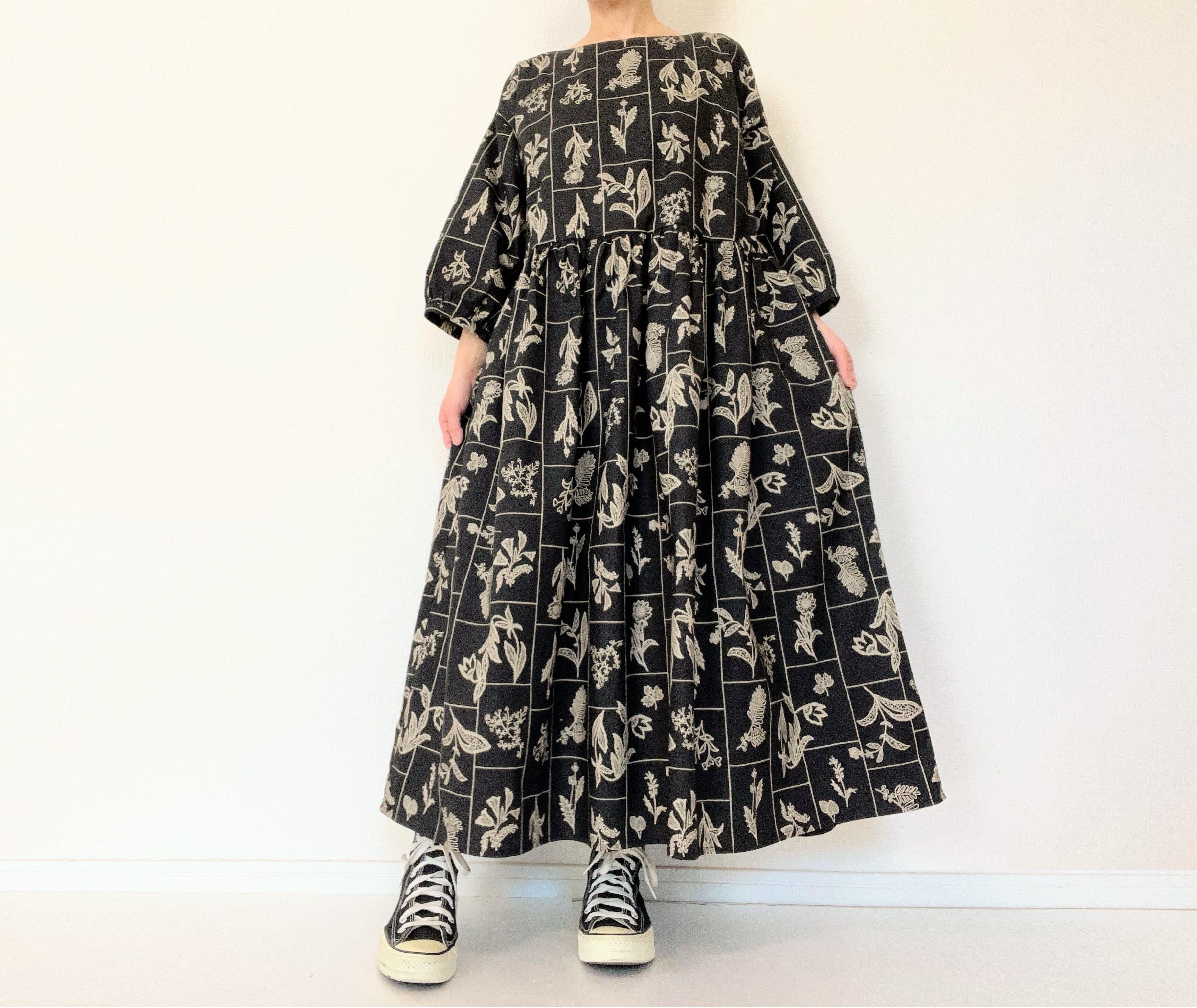 【送料無料】春のブラックワンピース*野の花柄*刺繍調の植物標本*七分袖ゆったりロング丈*国産コットン100%*ポケット付