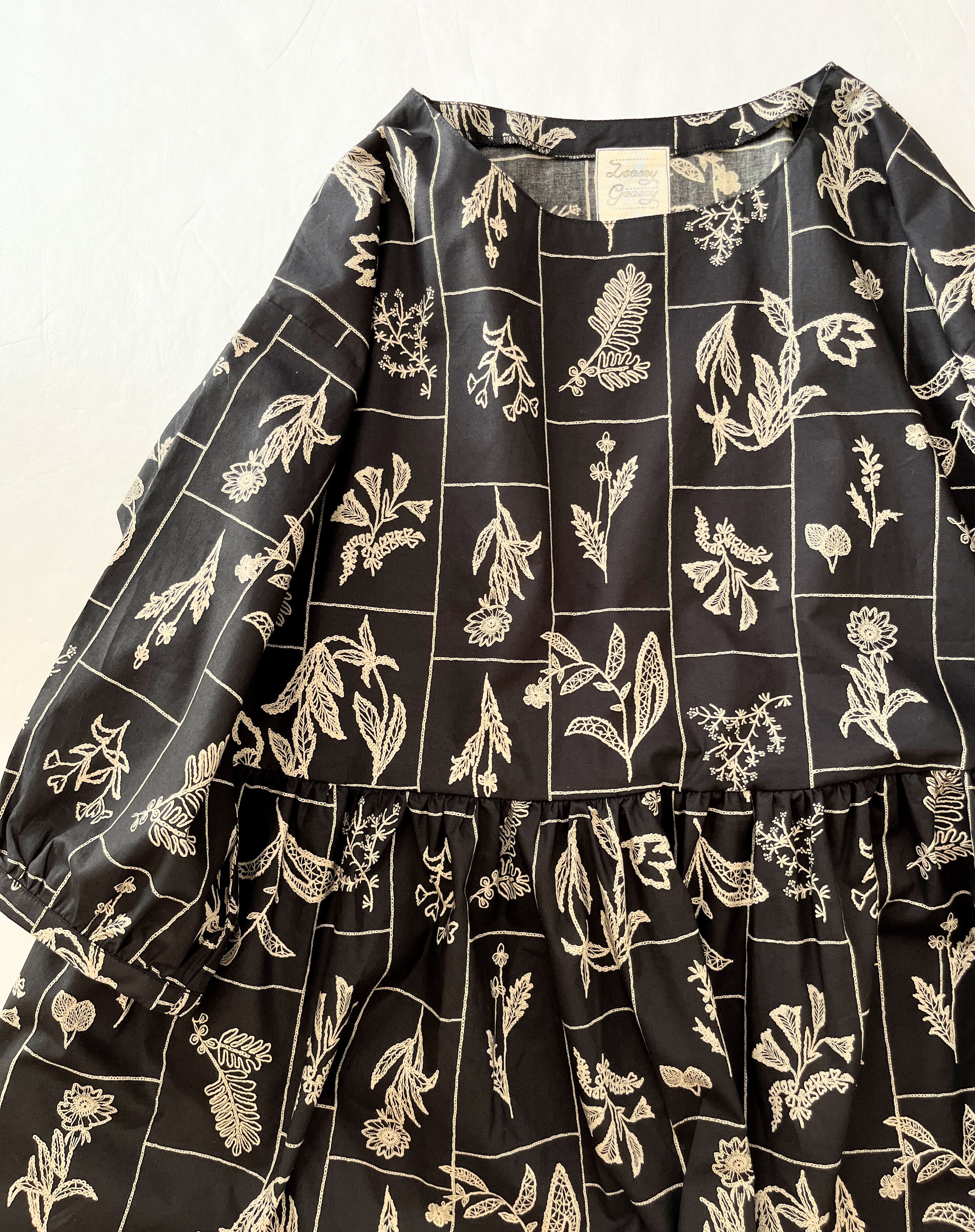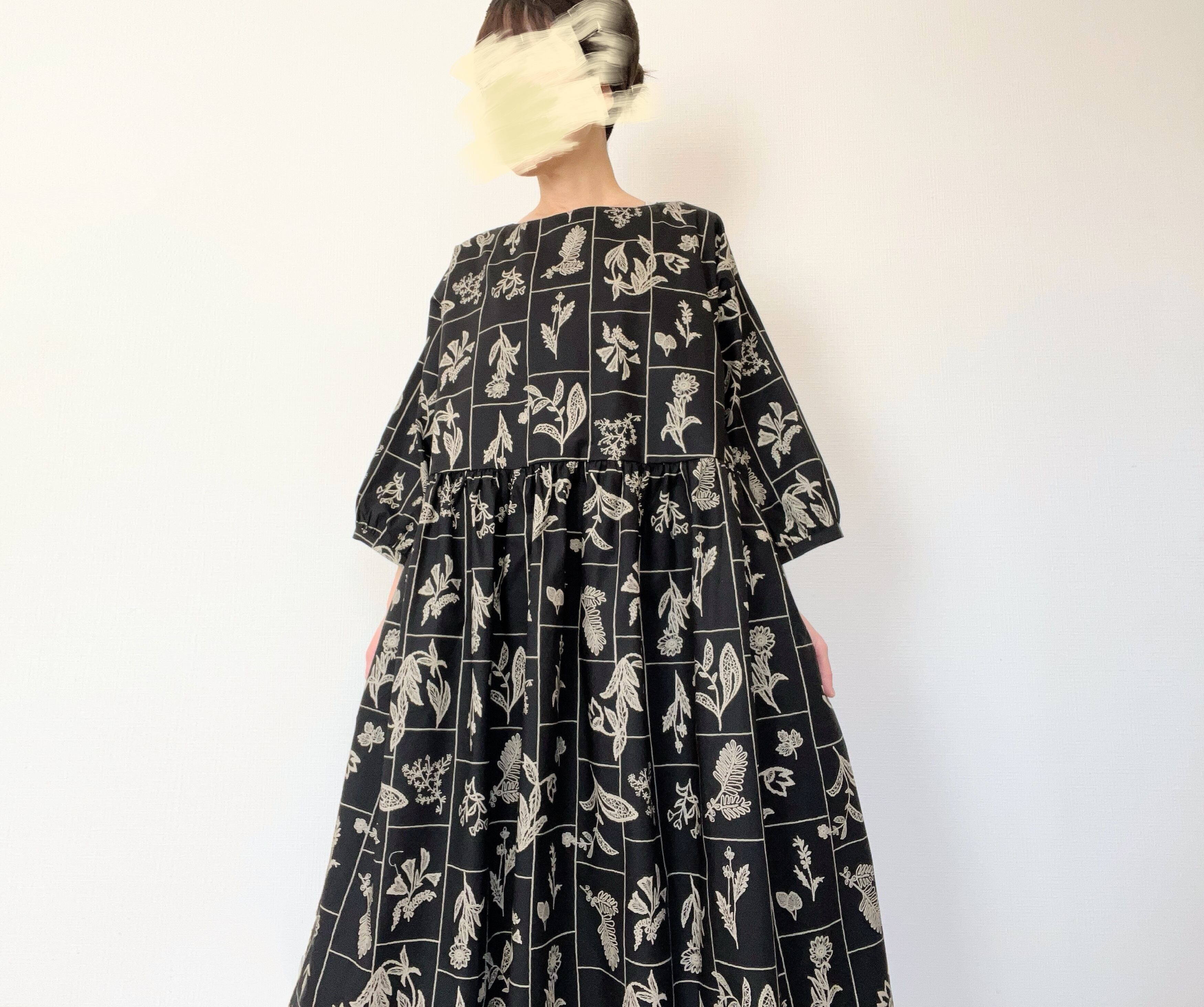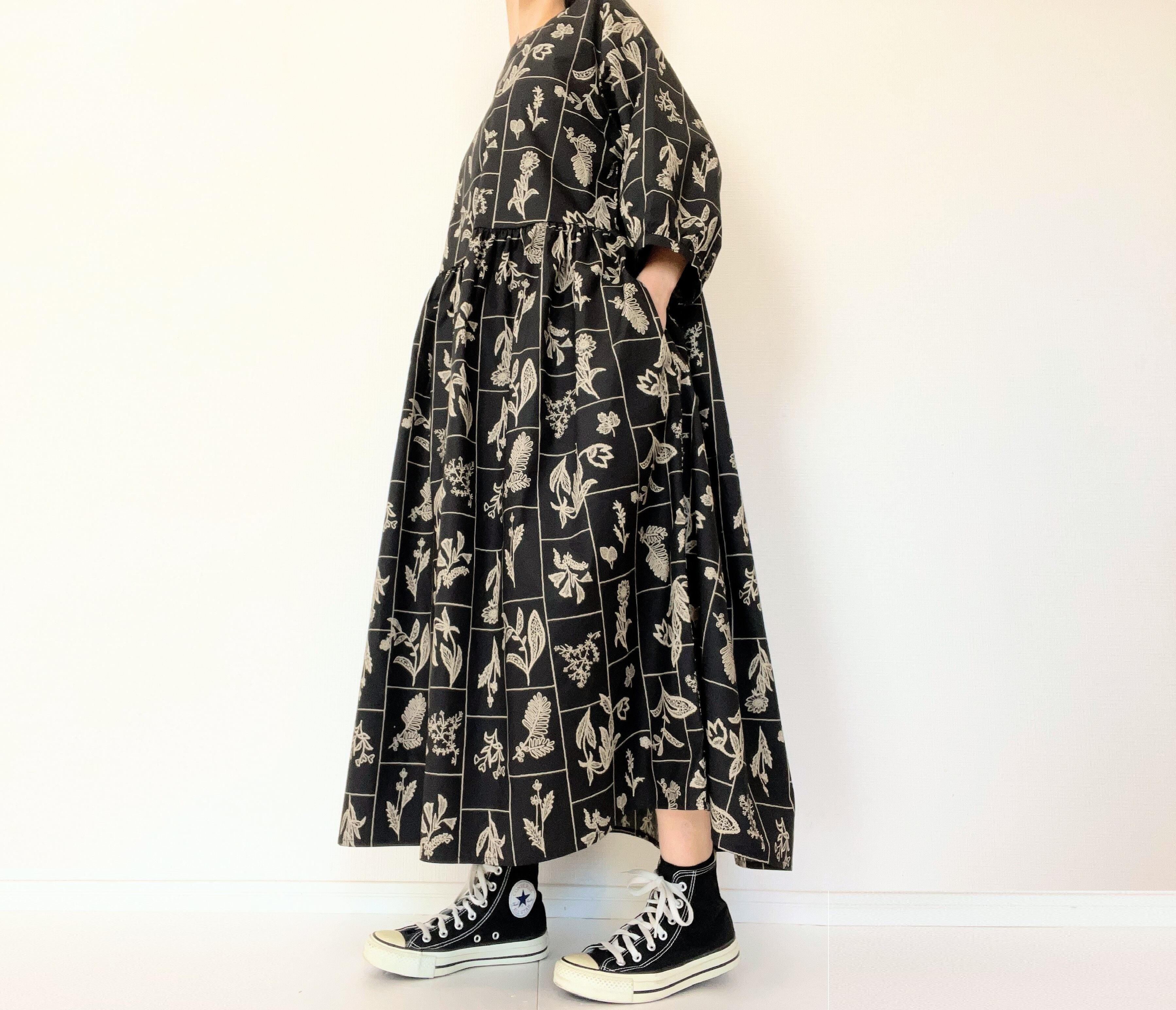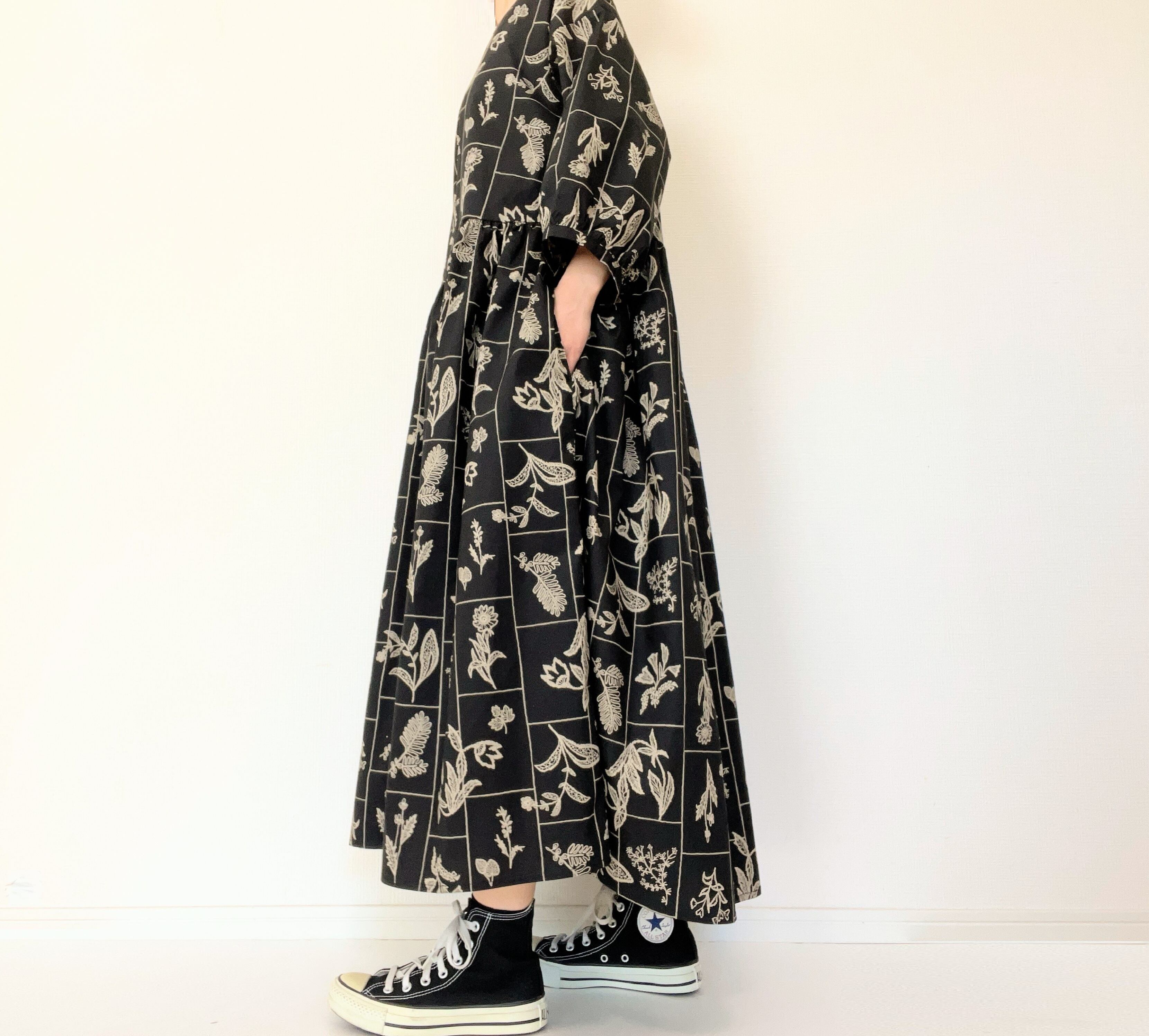 【送料無料】春のブラックワンピース*野の花柄*刺繍調の植物標本*七分袖ゆったりロング丈*国産コットン100%*ポケット付
