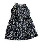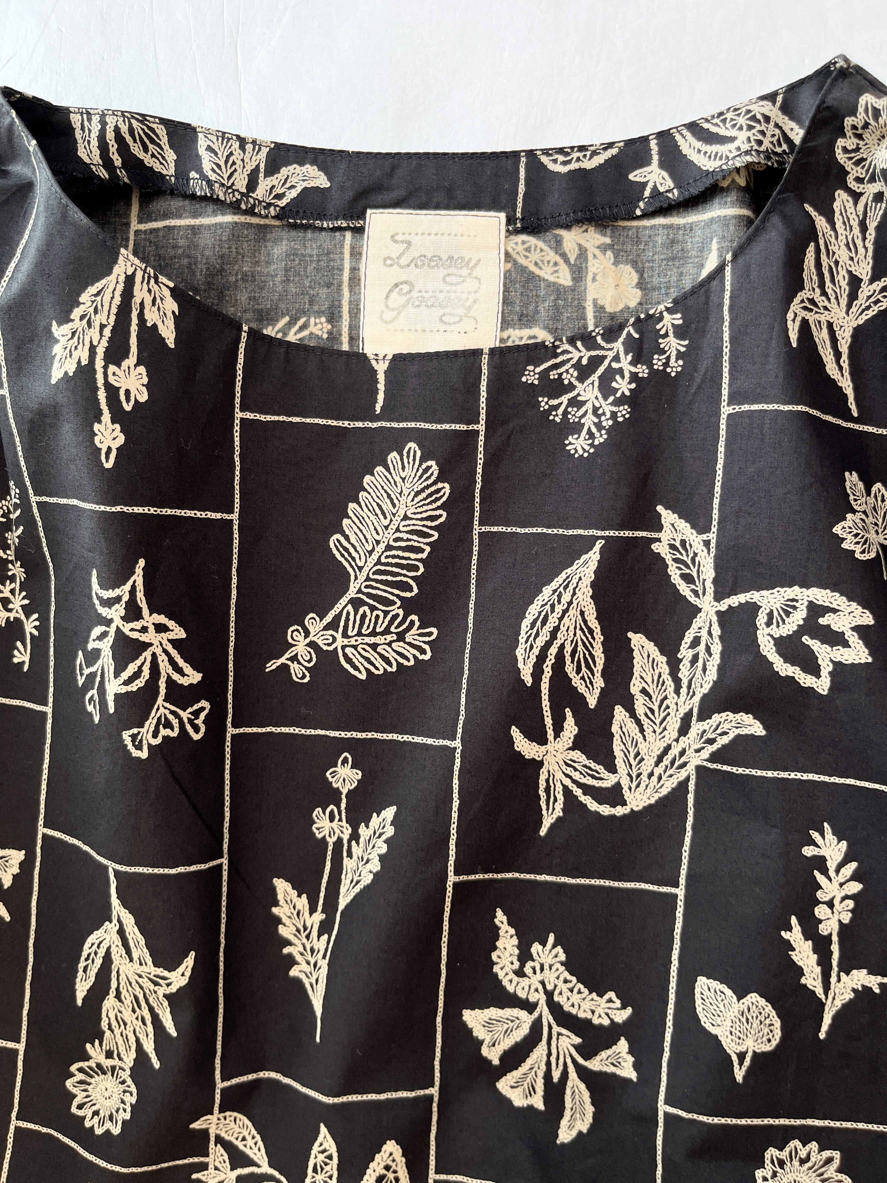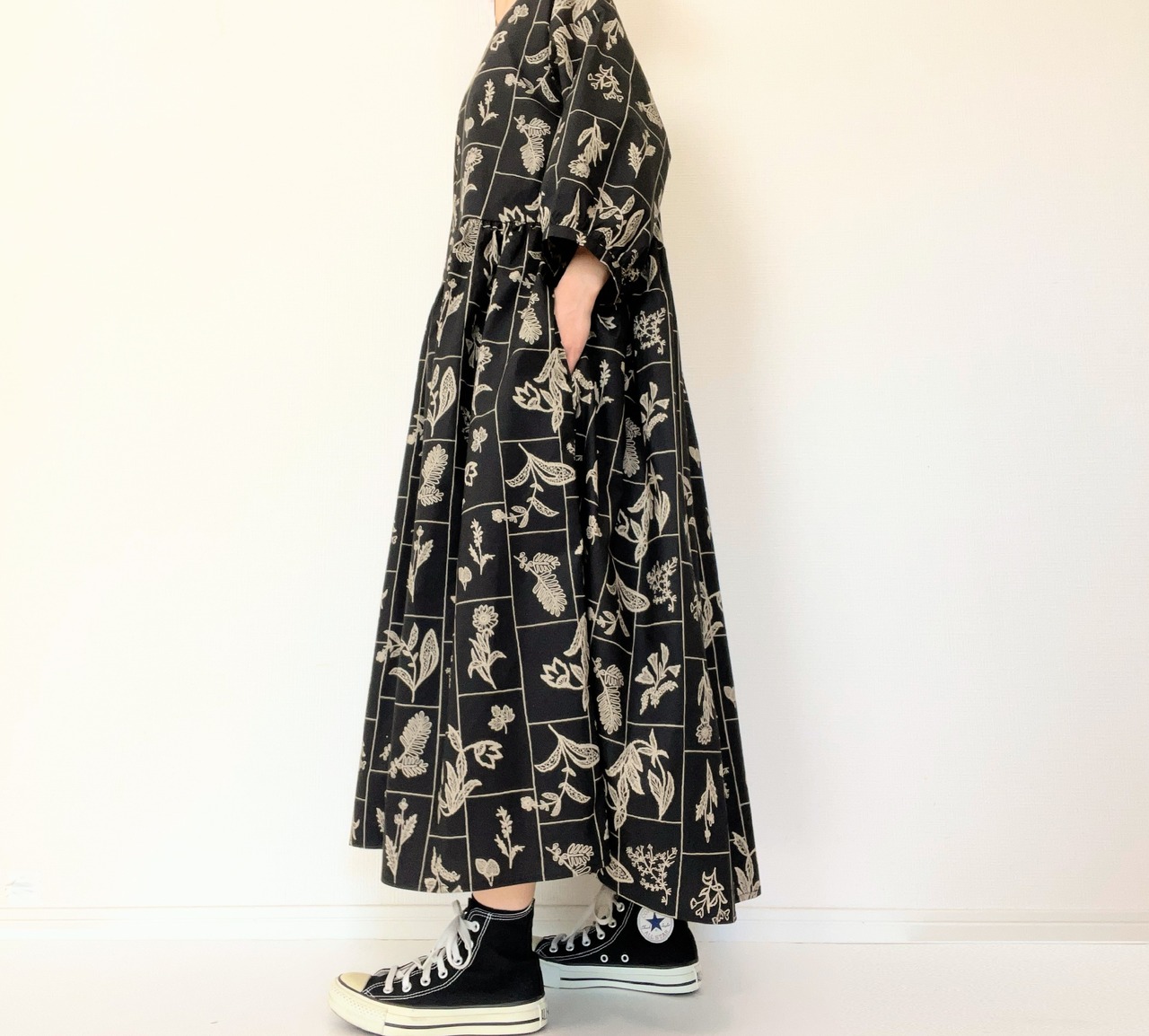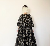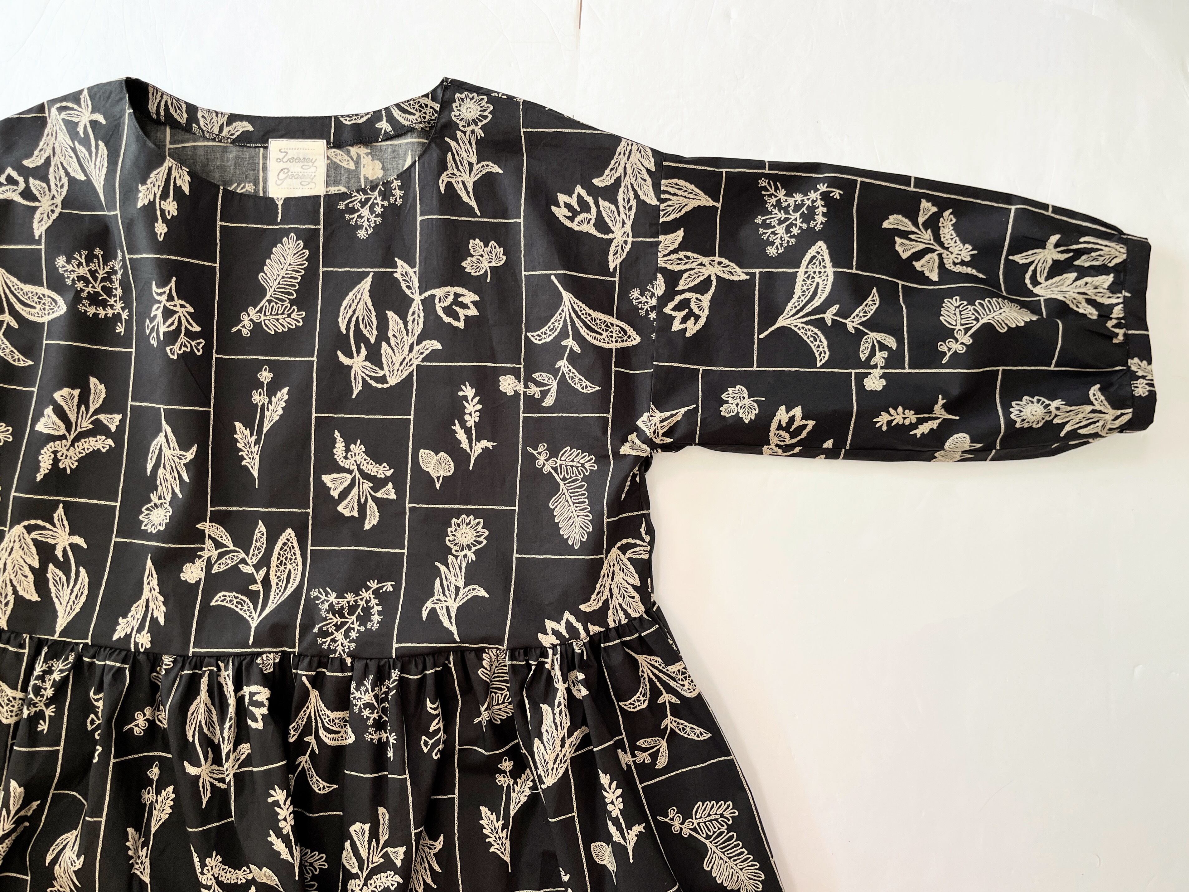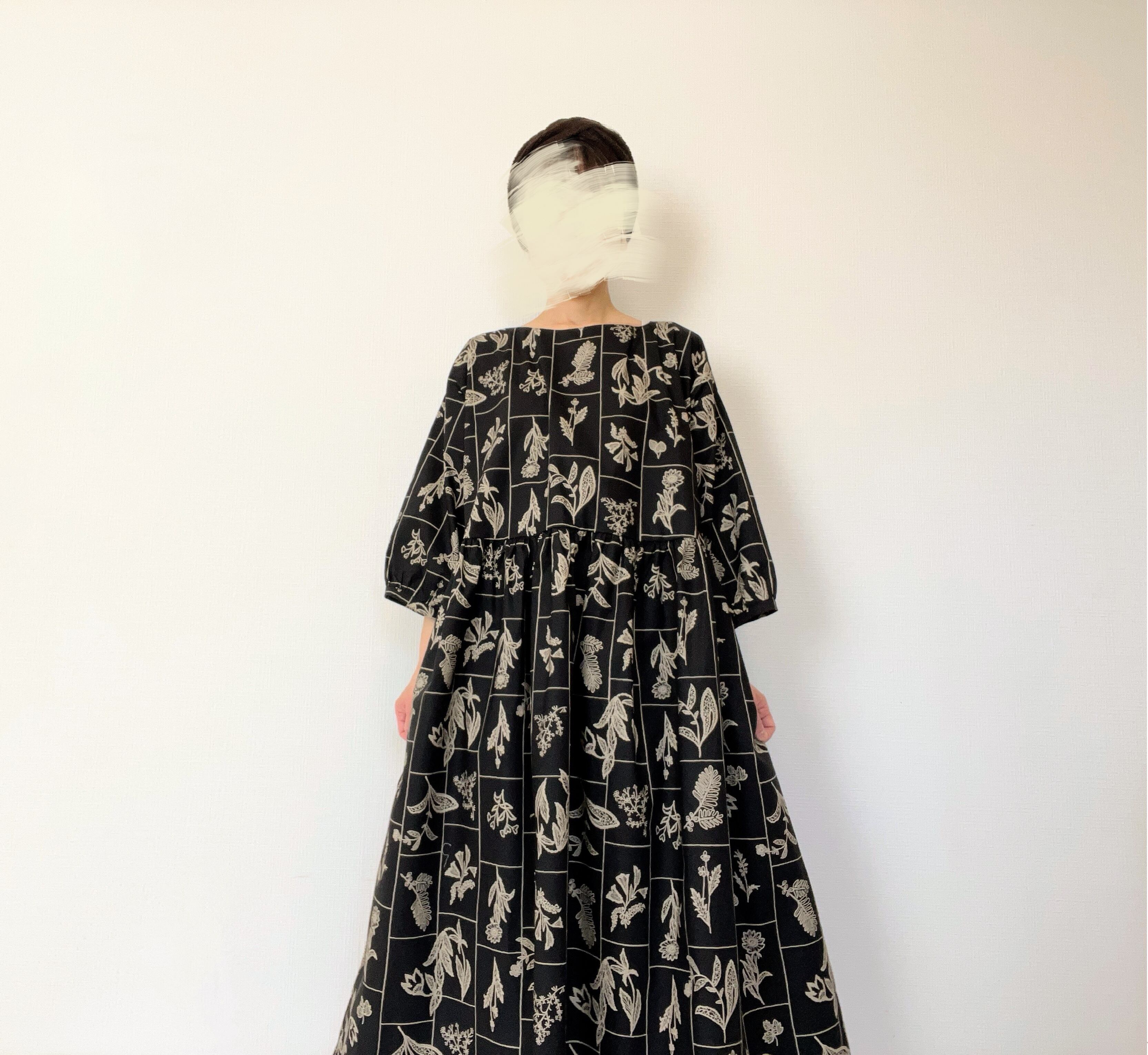 【送料無料】春のブラックワンピース*野の花柄*刺繍調の植物標本*七分袖ゆったりロング丈*国産コットン100%*ポケット付