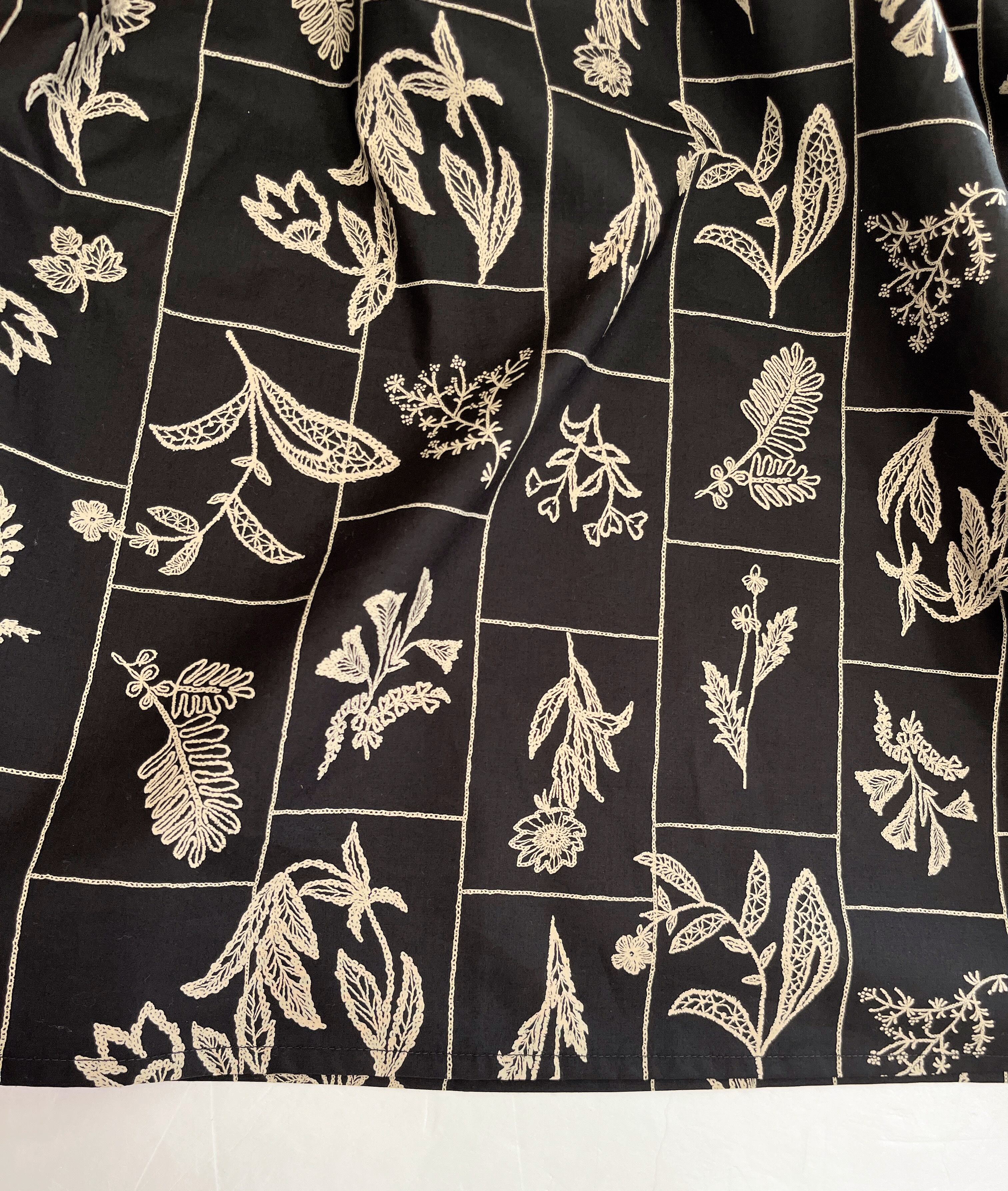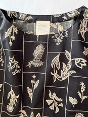 落ち着いたブラックの生地に、やさしい生成り色の草花が映え