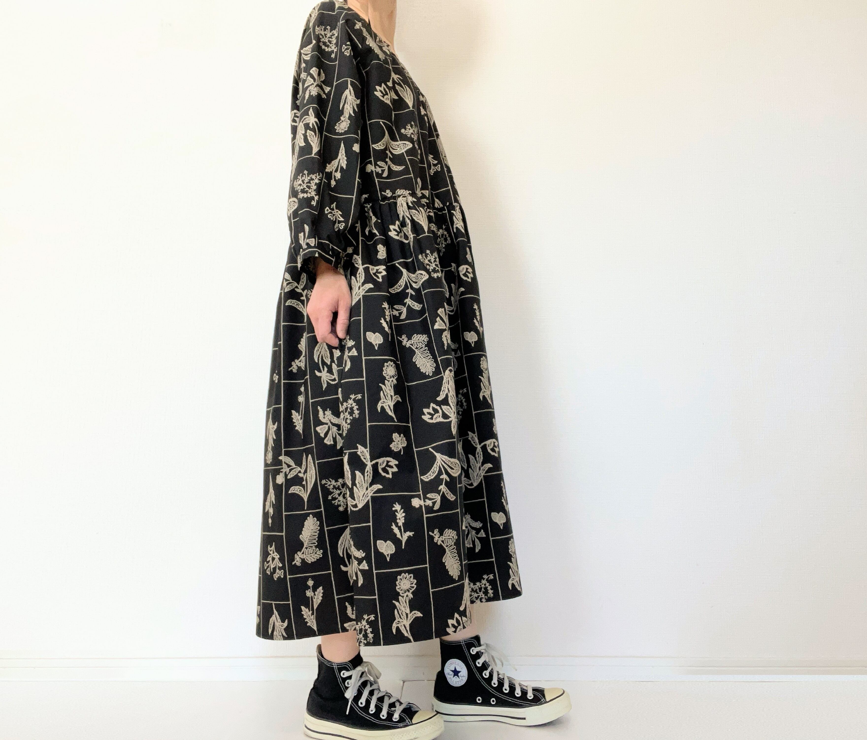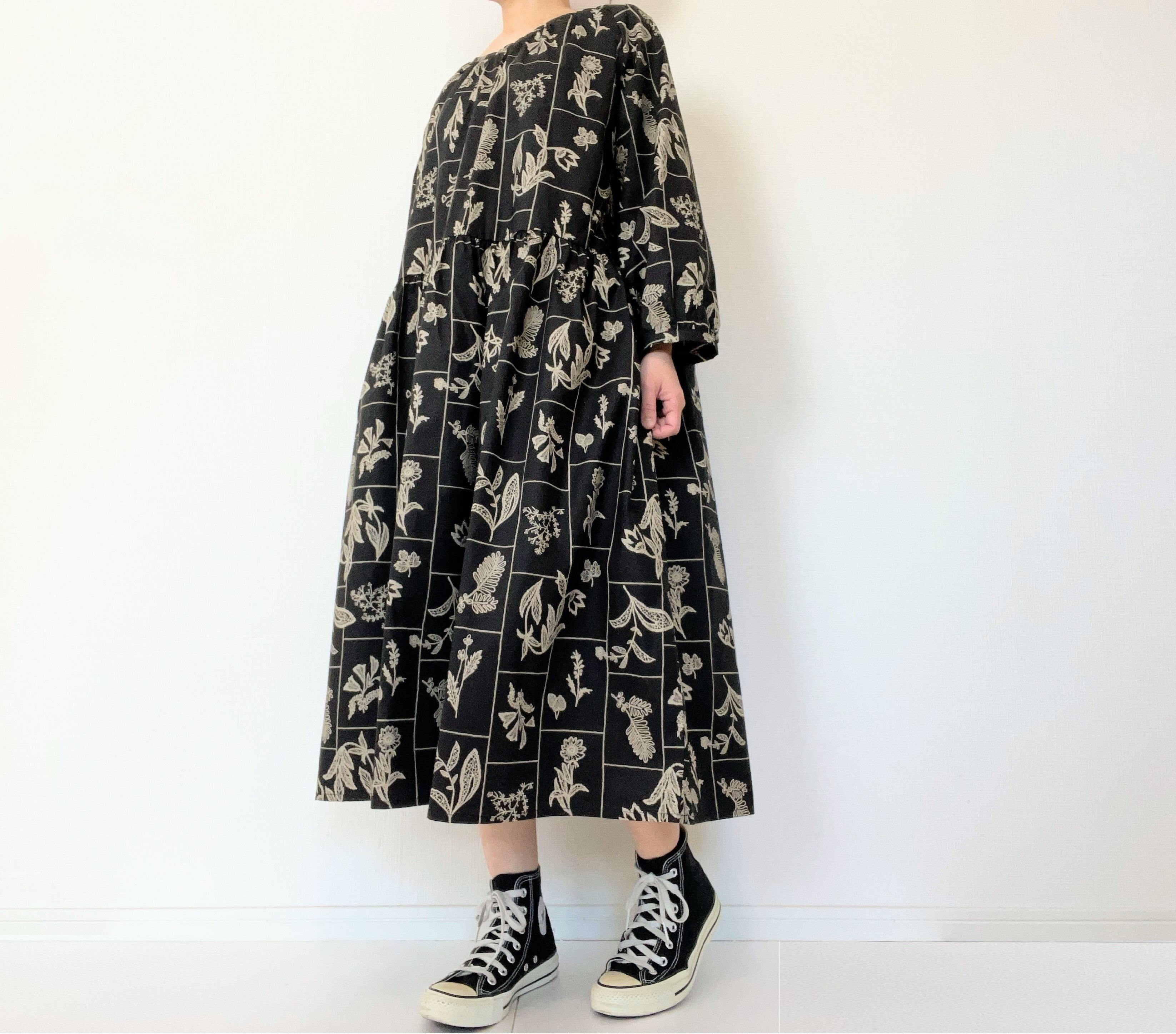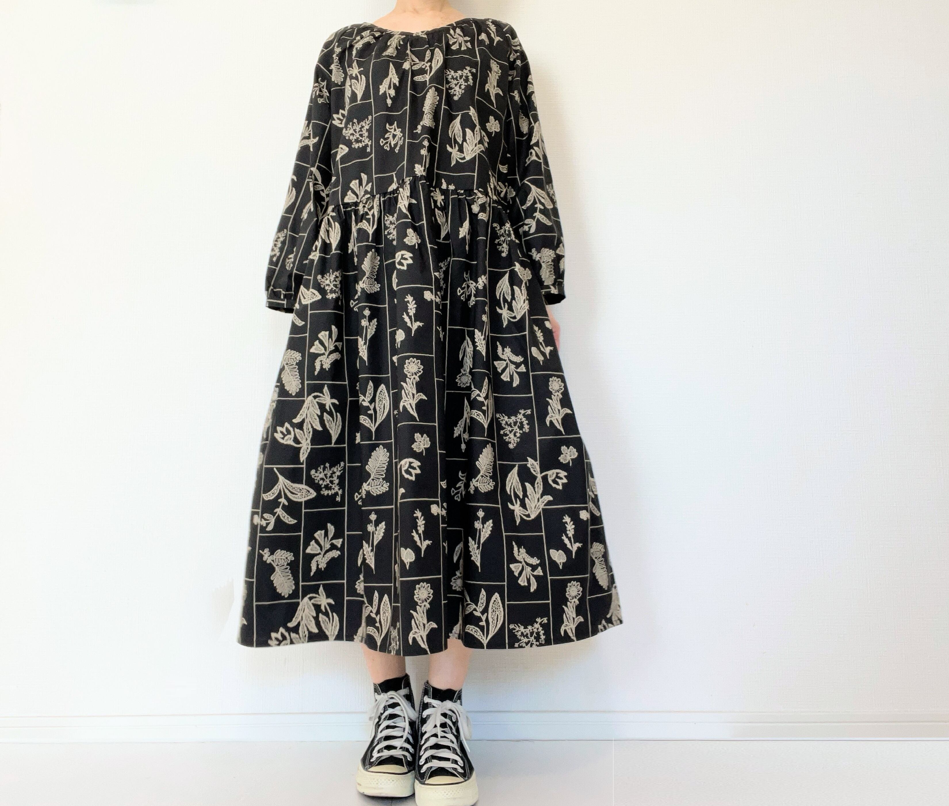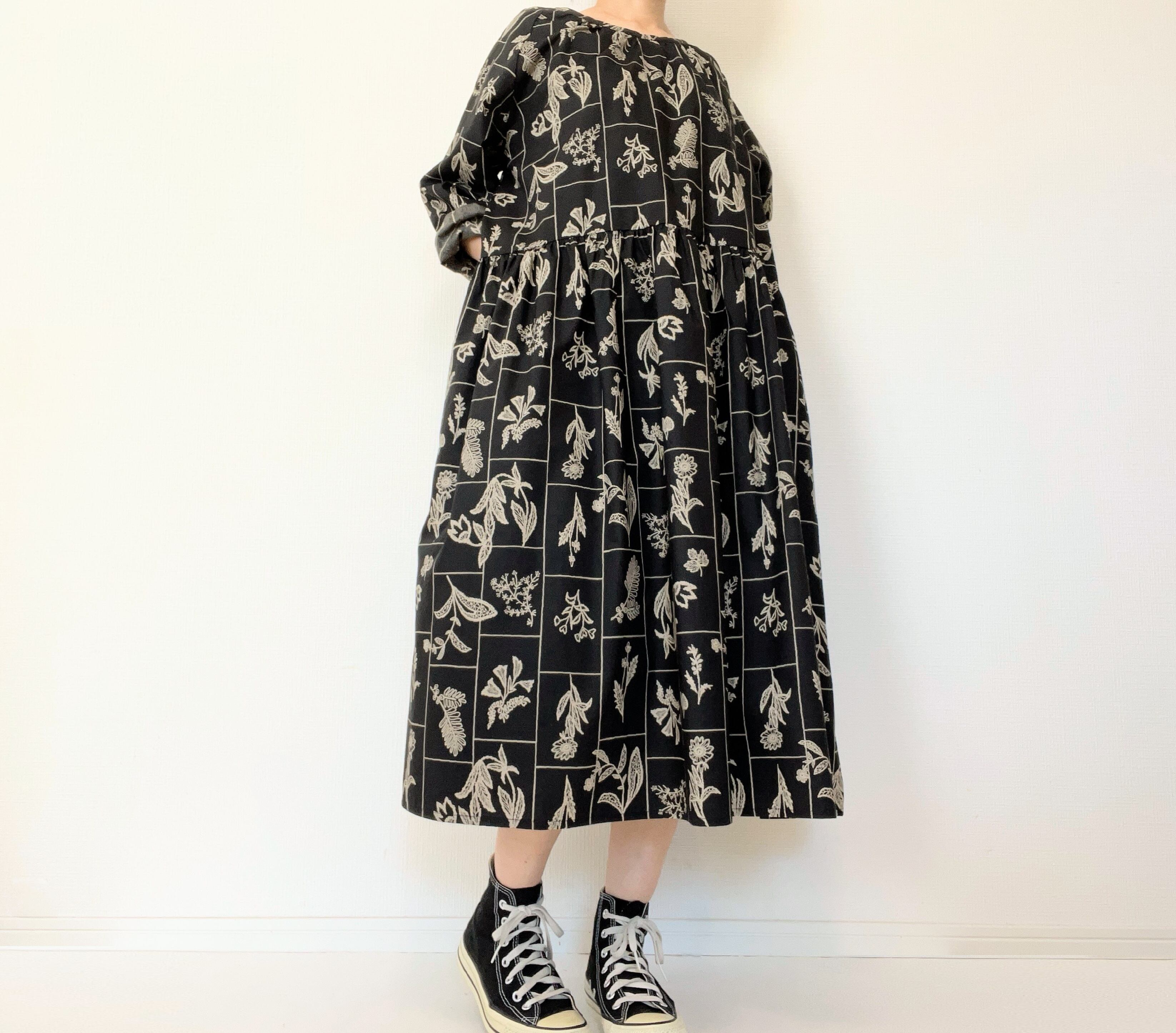 大人の花柄ブラックワンピース*刺繍調の植物標本*長袖*ゆったりリラックス大きいサイズ*国産コットン100%*ポケット付
