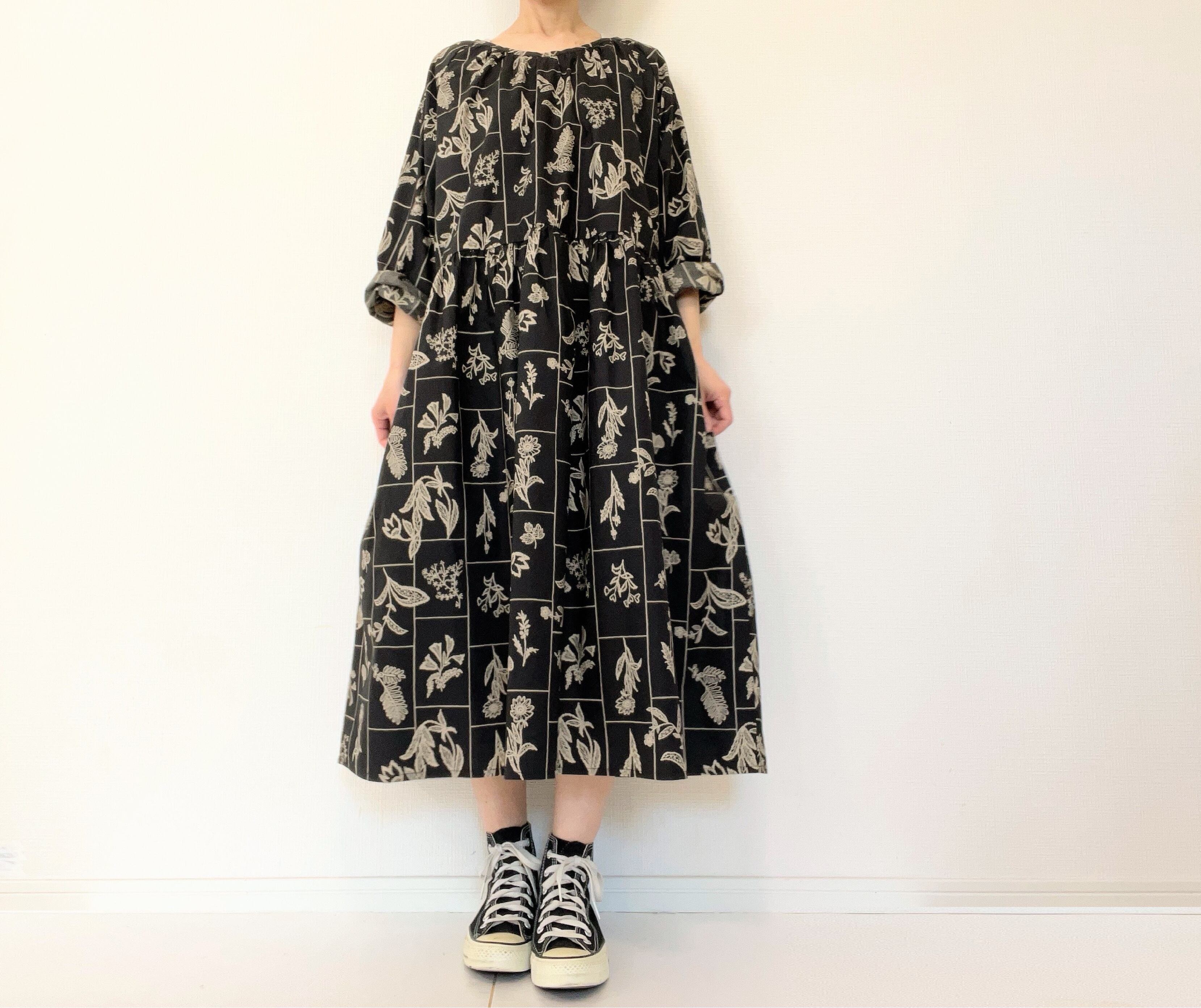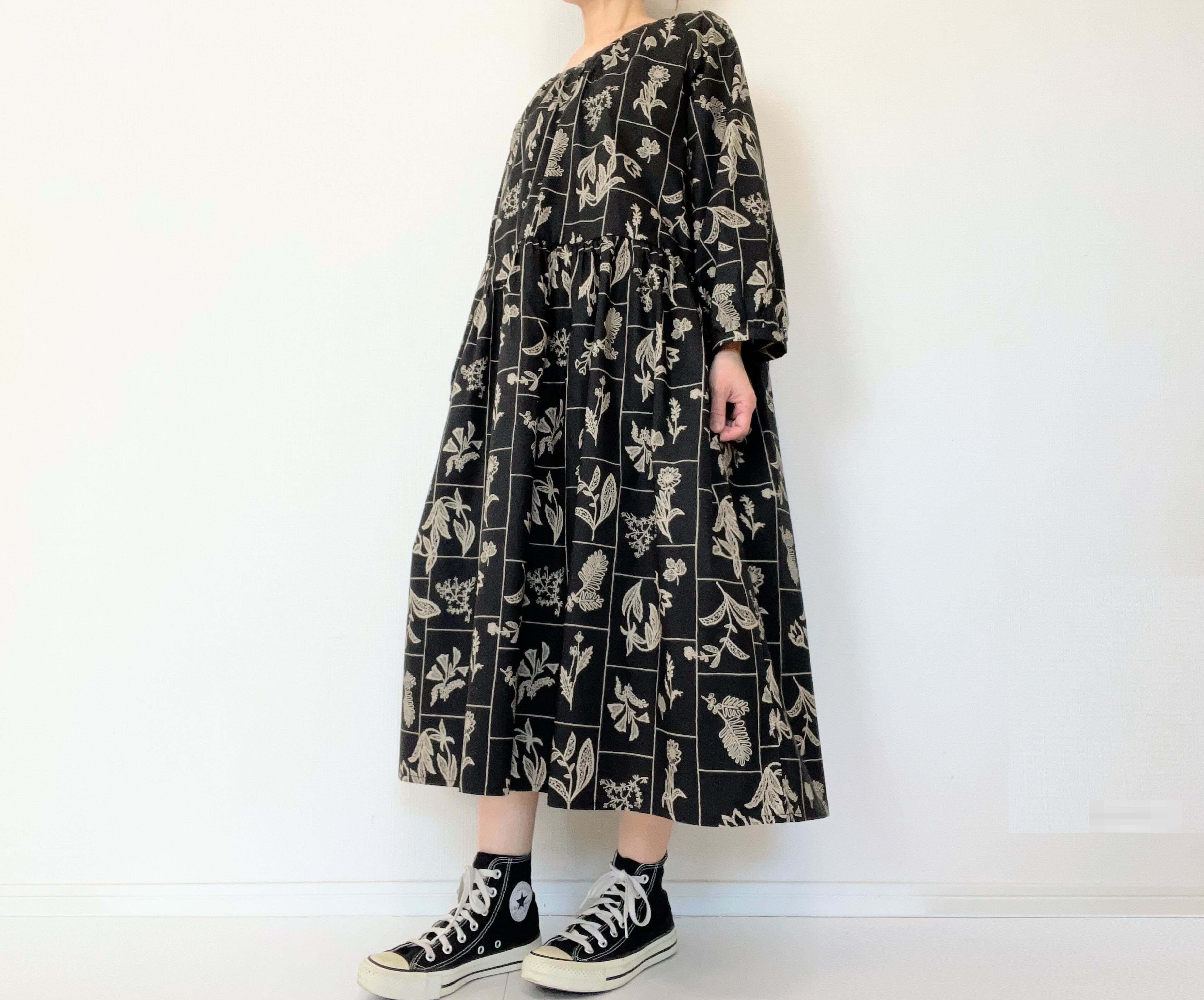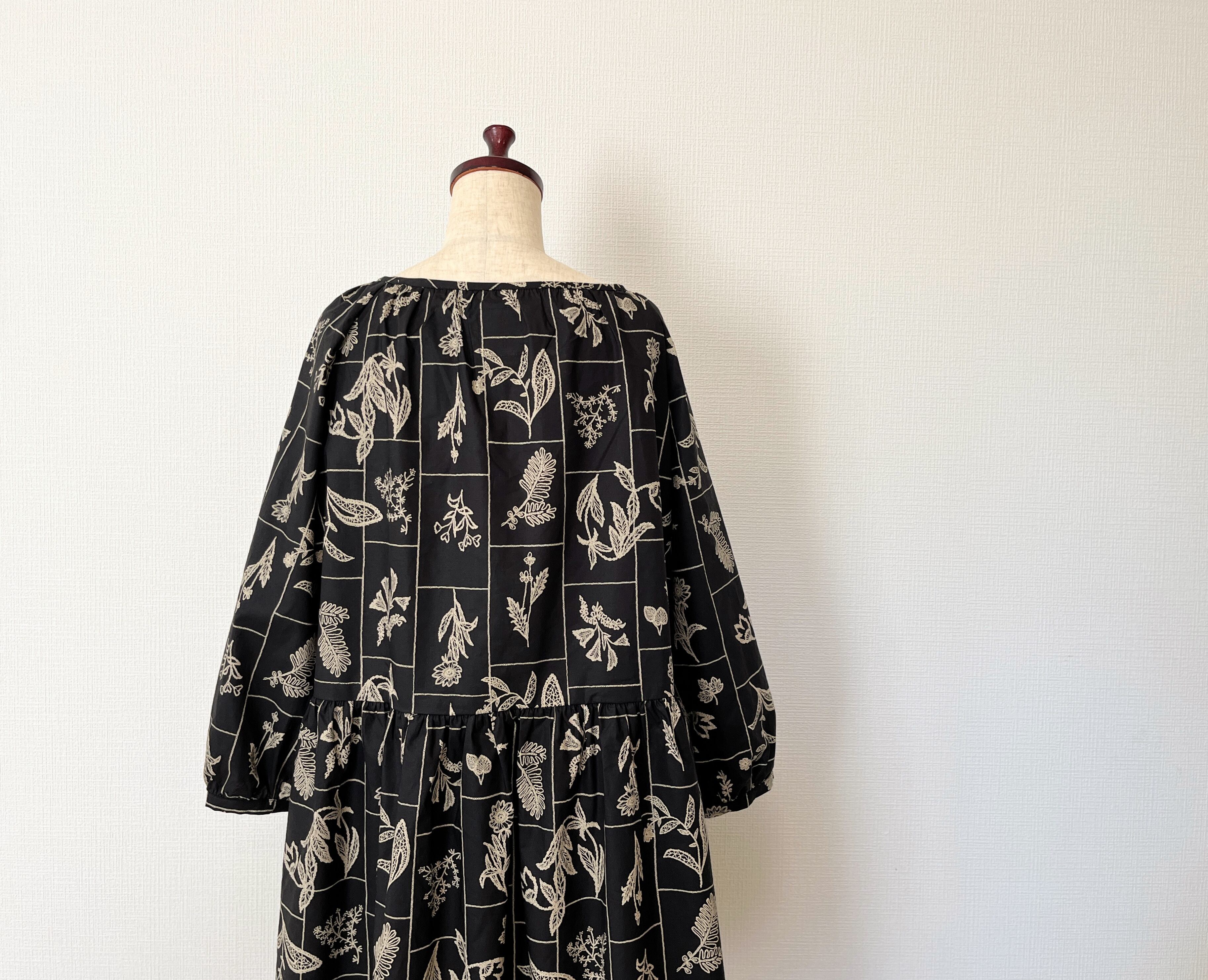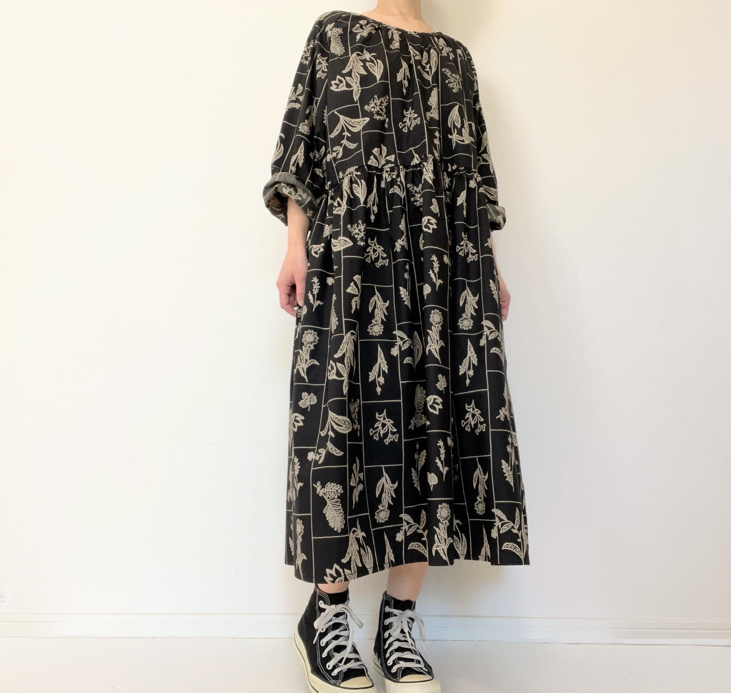 大人の花柄ブラックワンピース*刺繍調の植物標本*長袖*ゆったりリラックス大きいサイズ*国産コットン100%*ポケット付