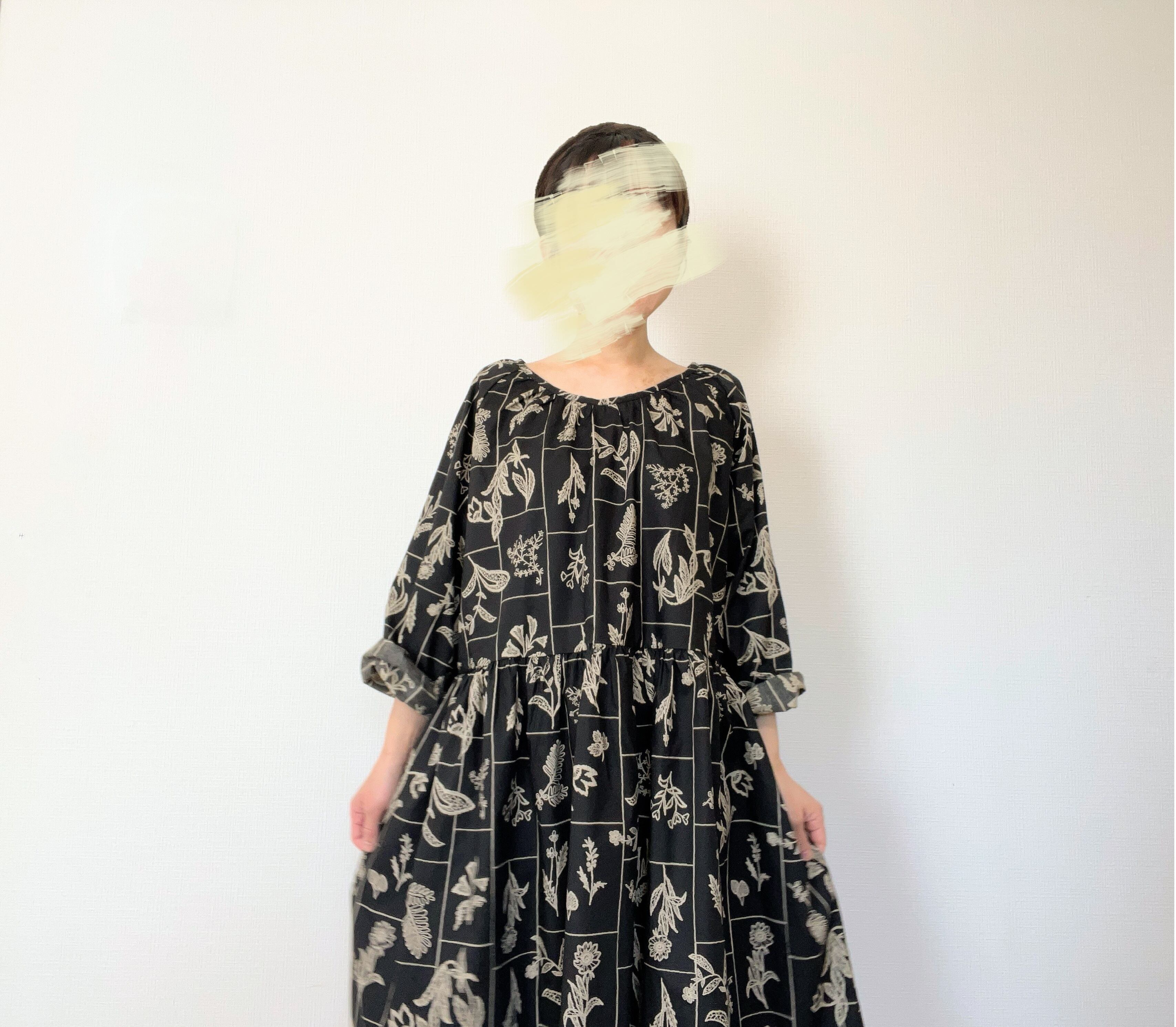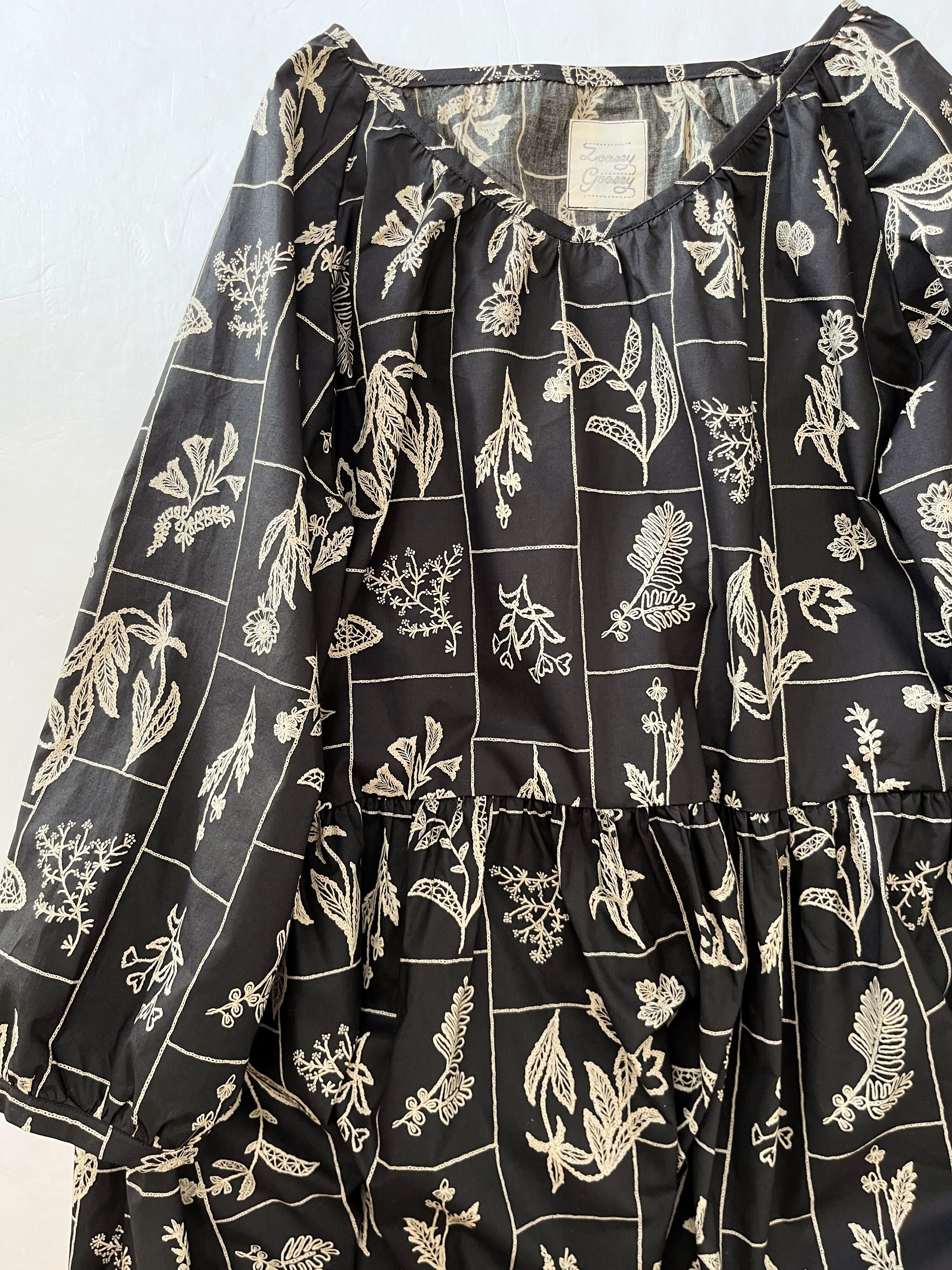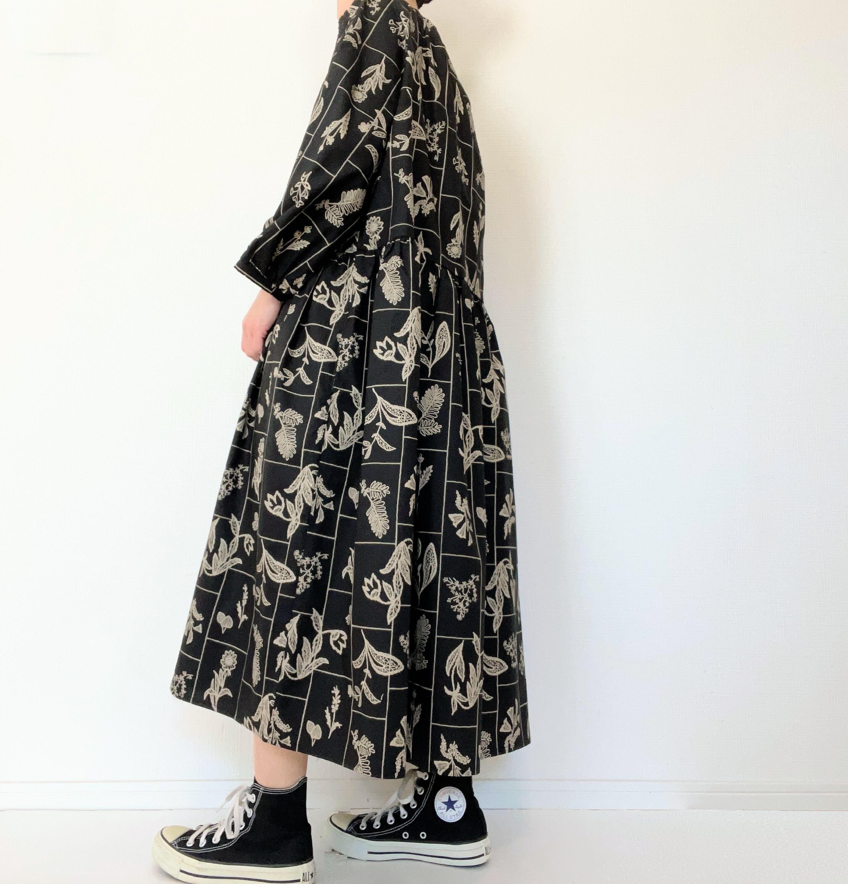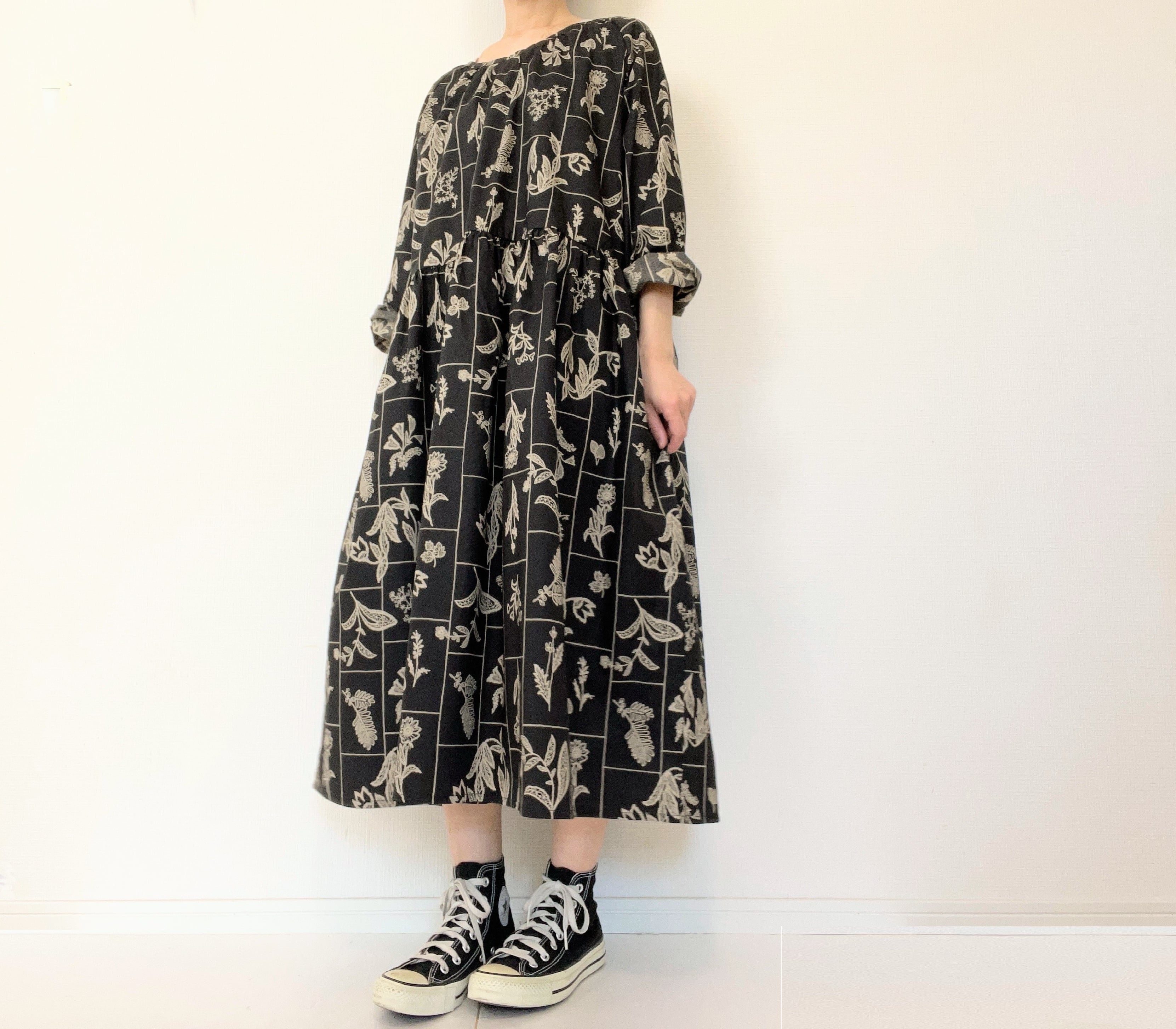大人の花柄ブラックワンピース*刺繍調の植物標本*長袖*ゆったりリラックス大きいサイズ*国産コットン100%*ポケット付