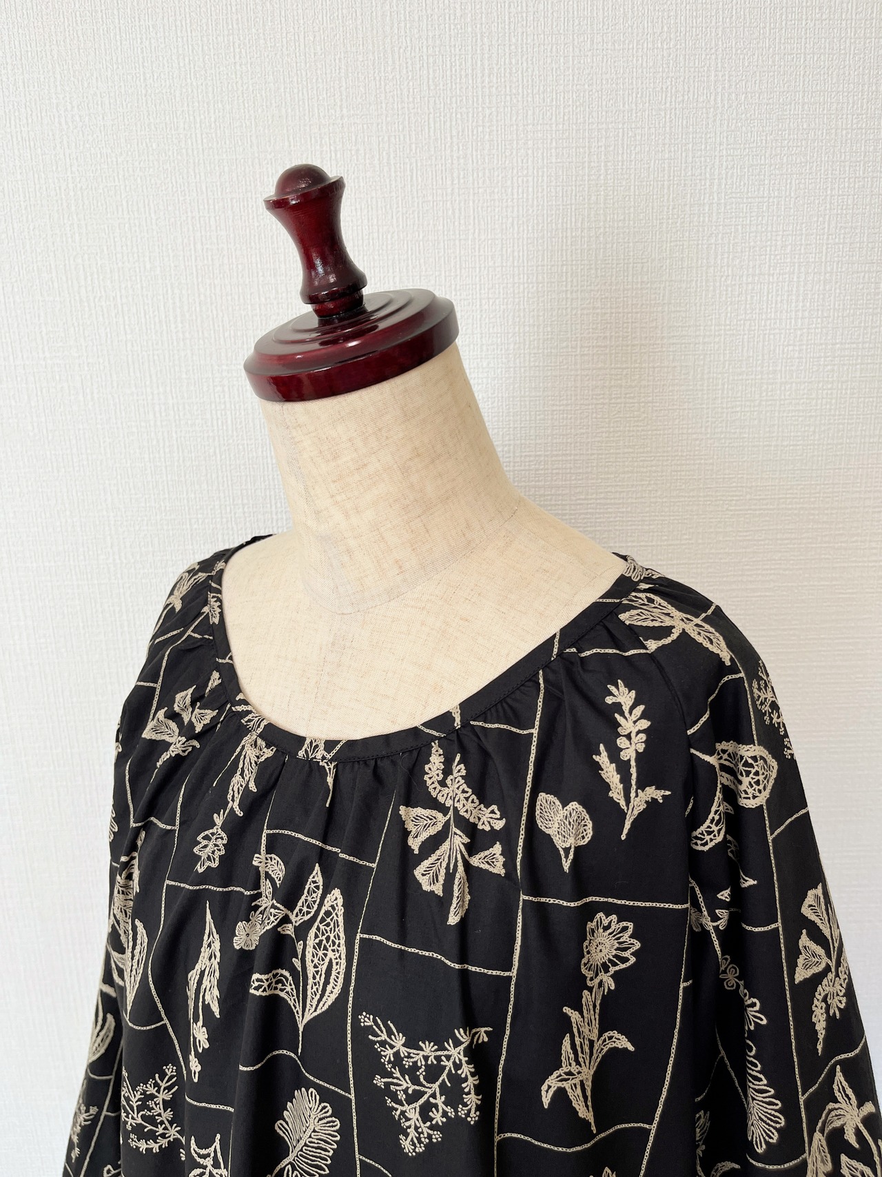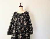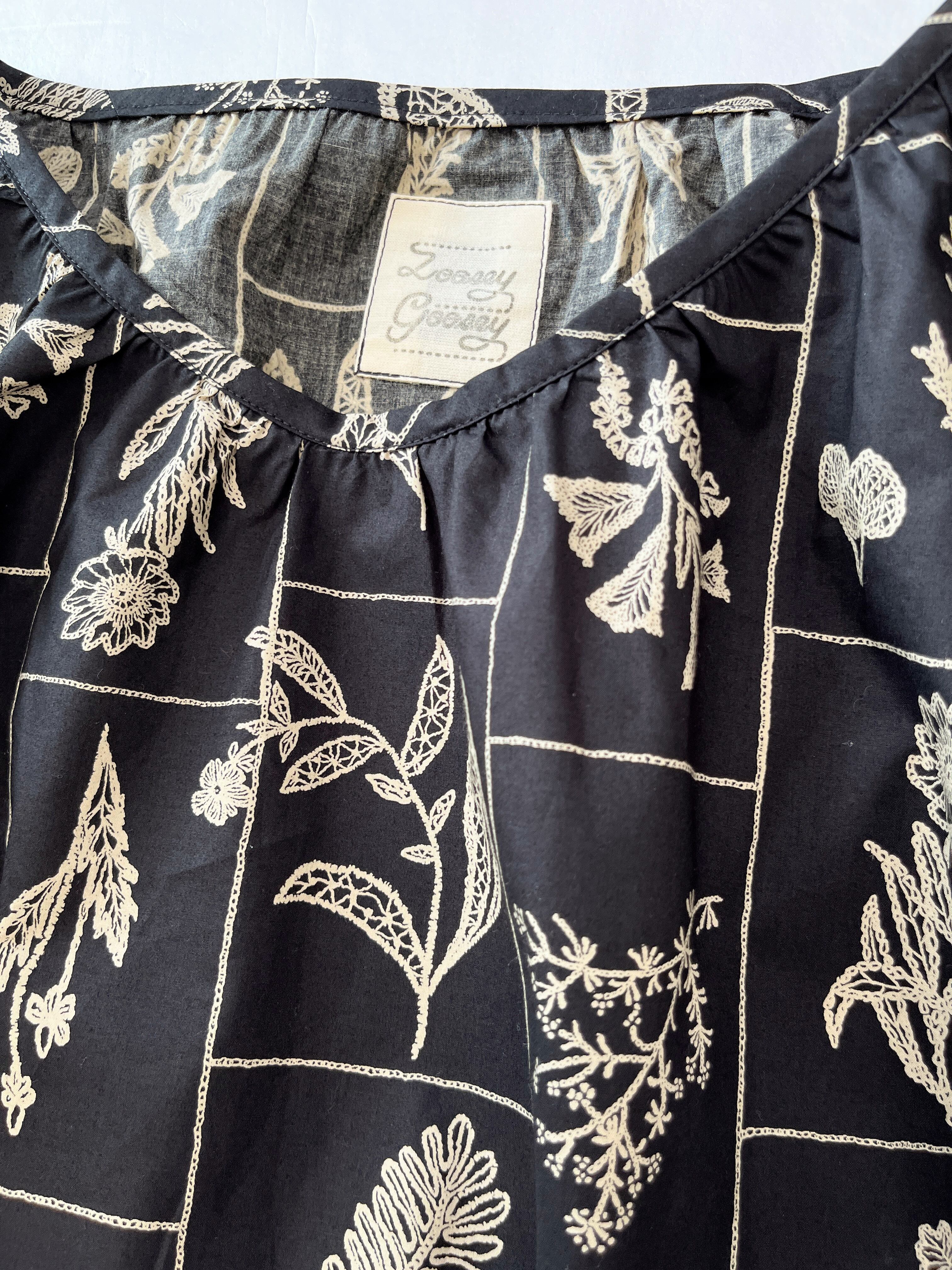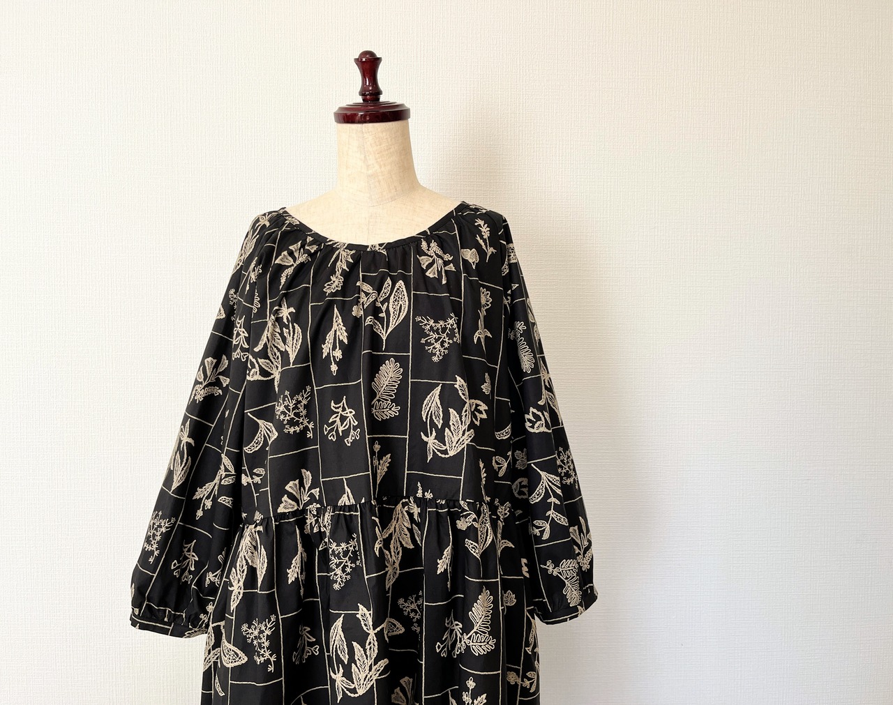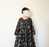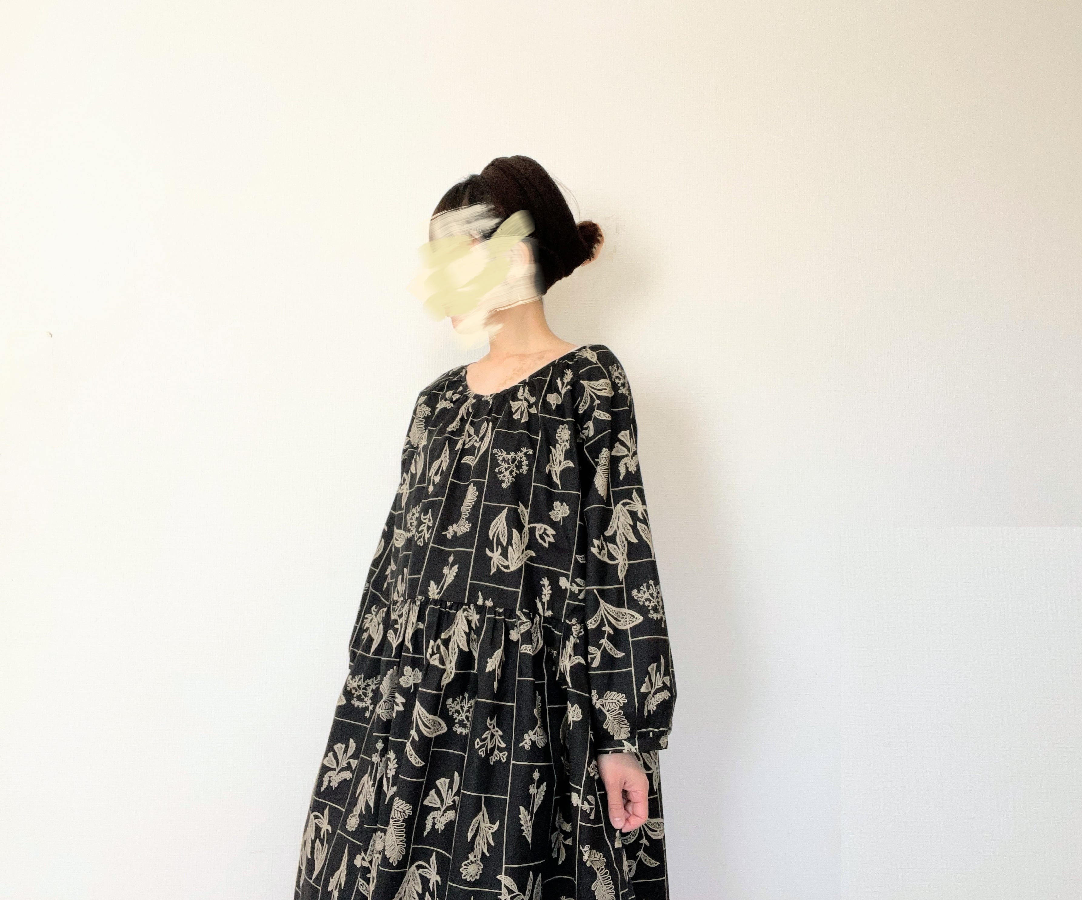 大人の花柄ブラックワンピース*刺繍調の植物標本*長袖*ゆったりリラックス大きいサイズ*国産コットン100%*ポケット付