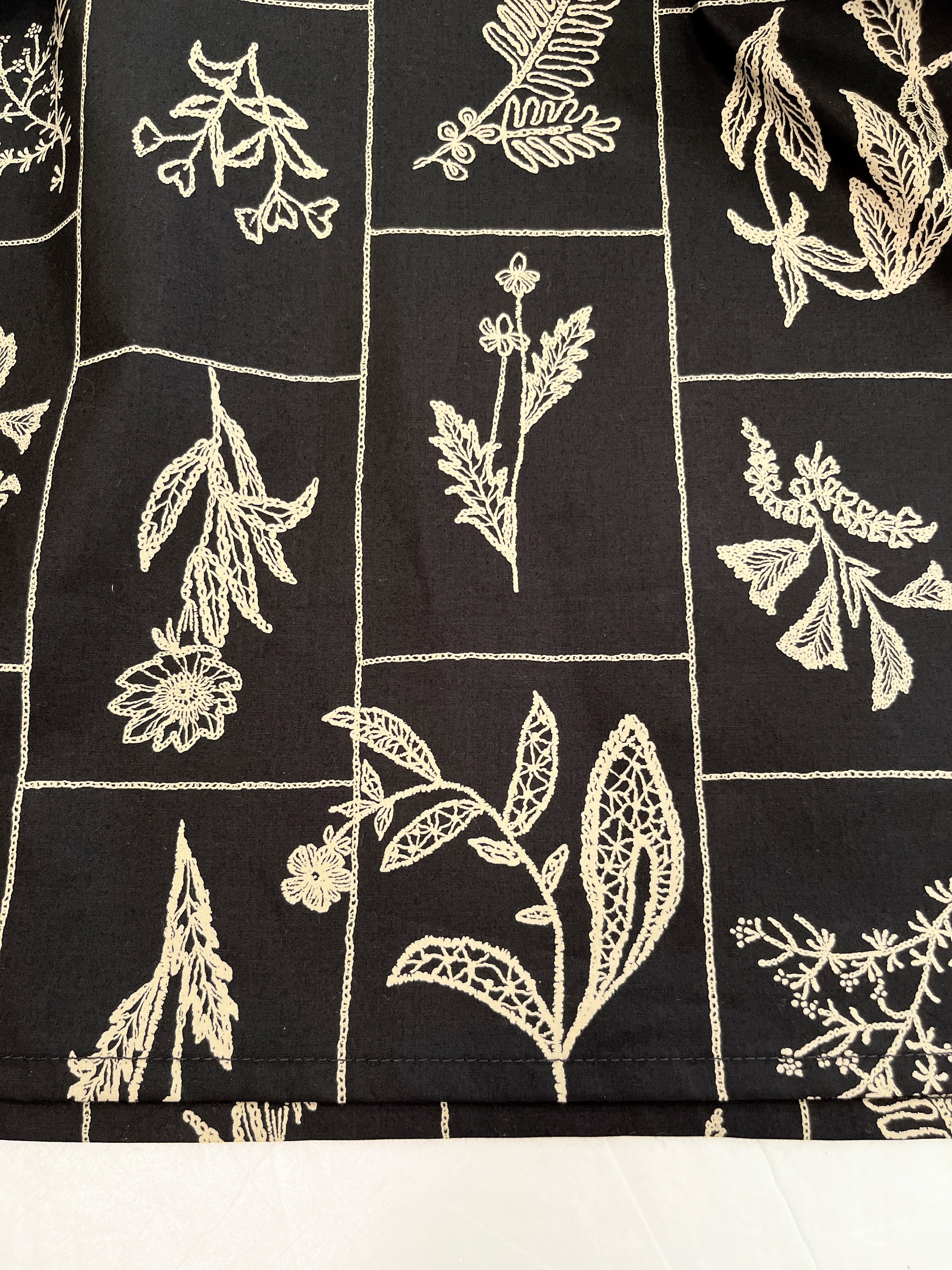 落ち着いたブラックの生地に、やさしい生成り色の草花が映え