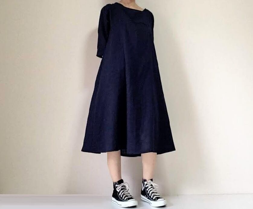 シンプルに仕上げたフレアワンピース。