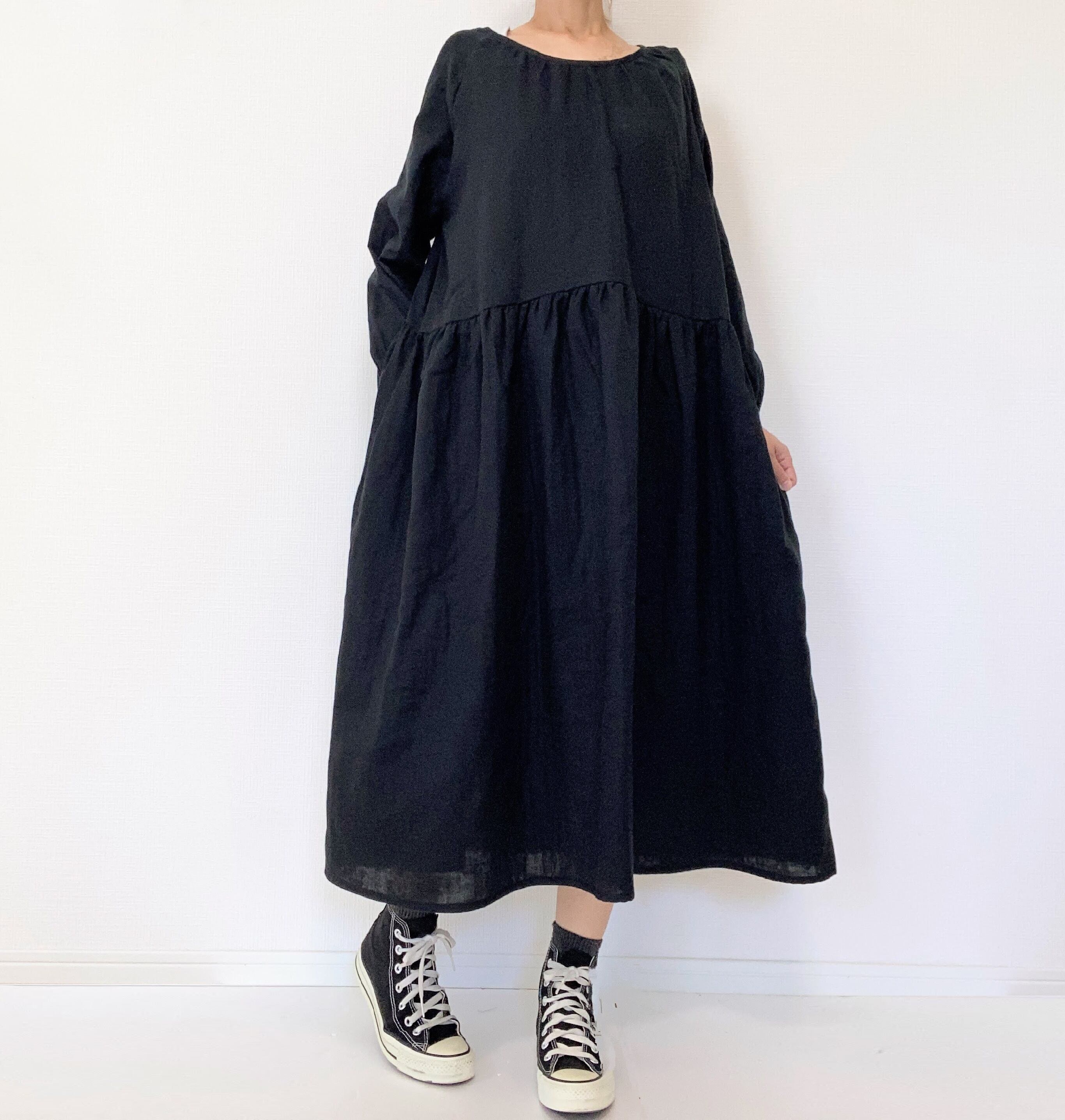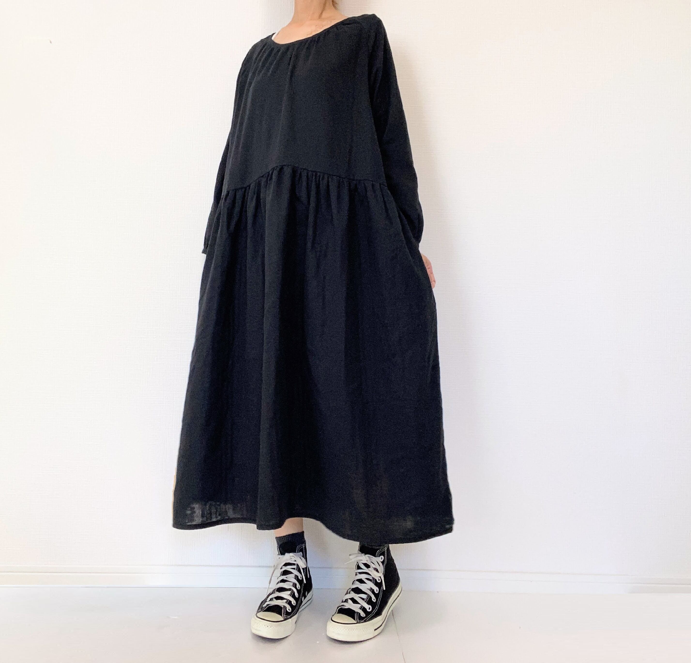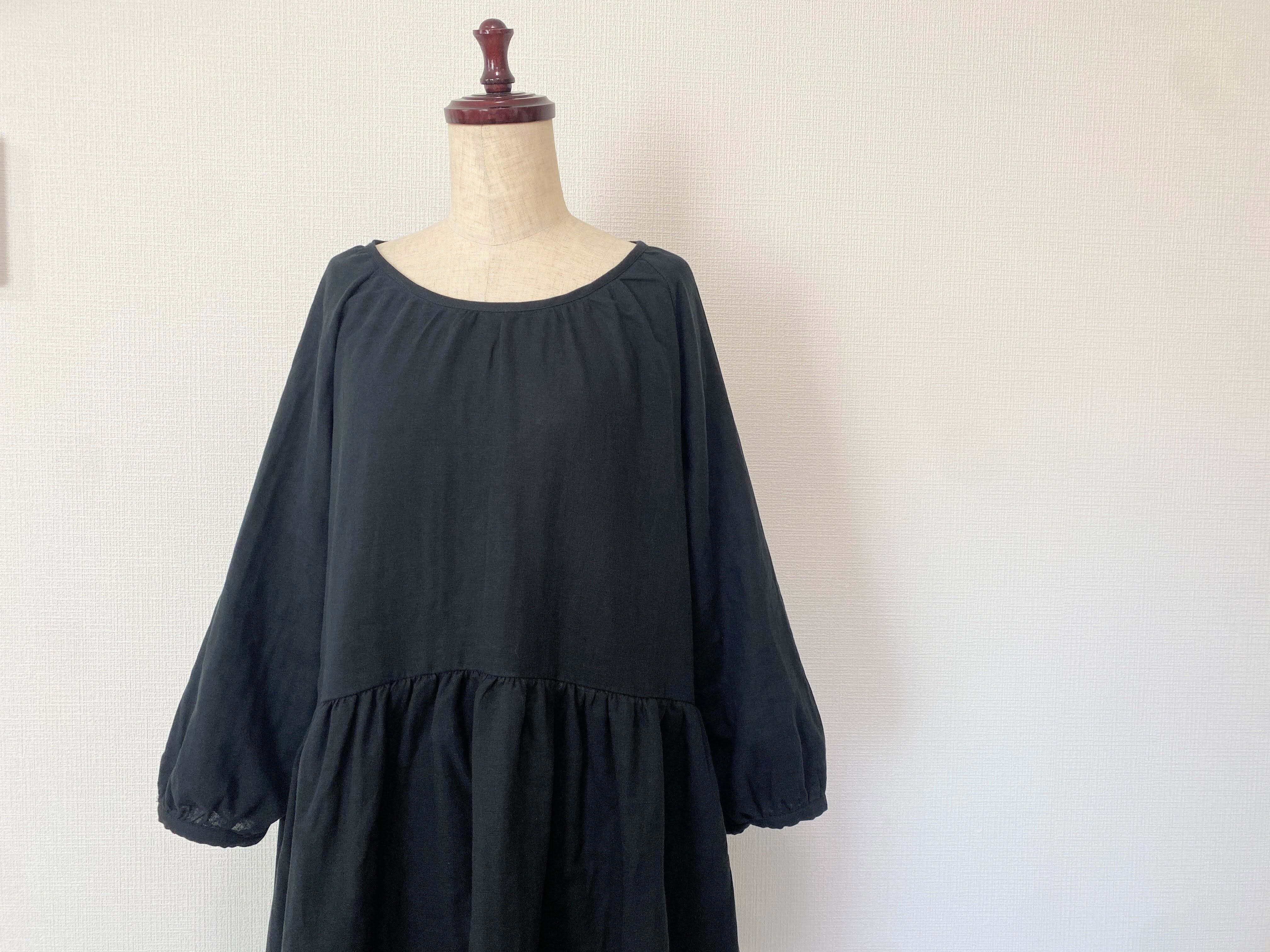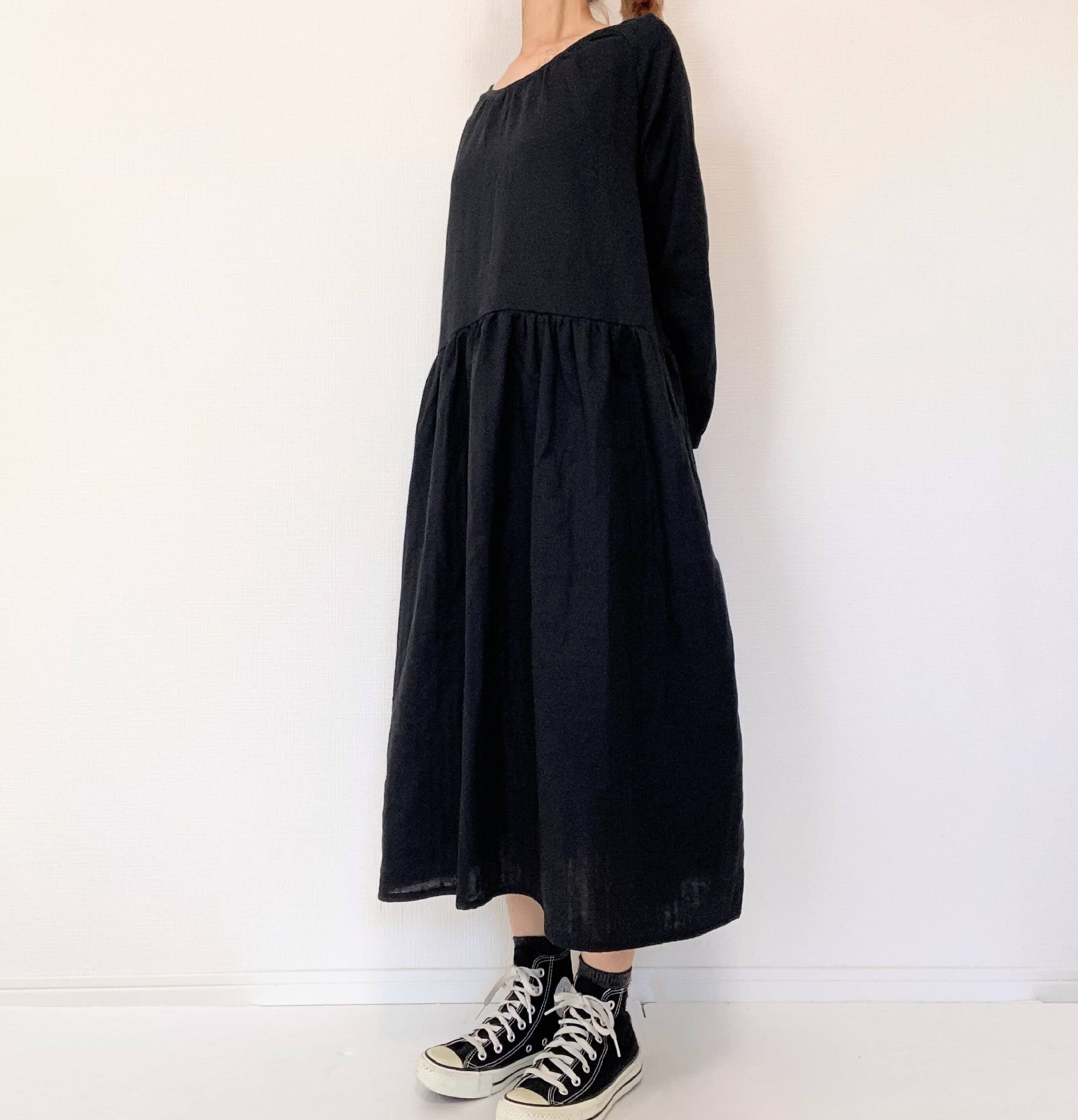 【送料無料】ふんわりダブルガーゼ*シンプル無地の長袖ワンピース*ゆったりフリーサイズ*国産コットン100%*ポケット付*ブラック