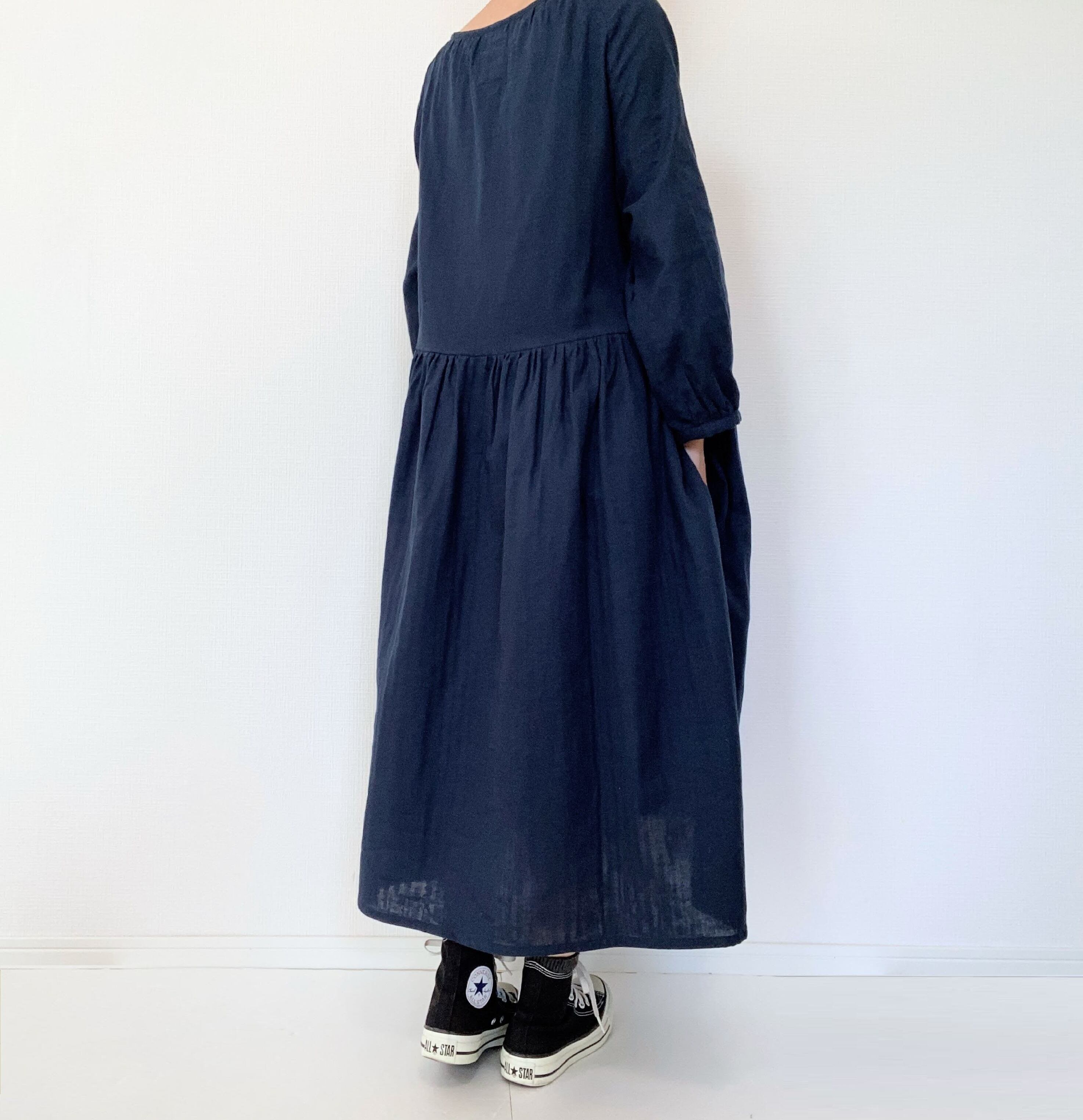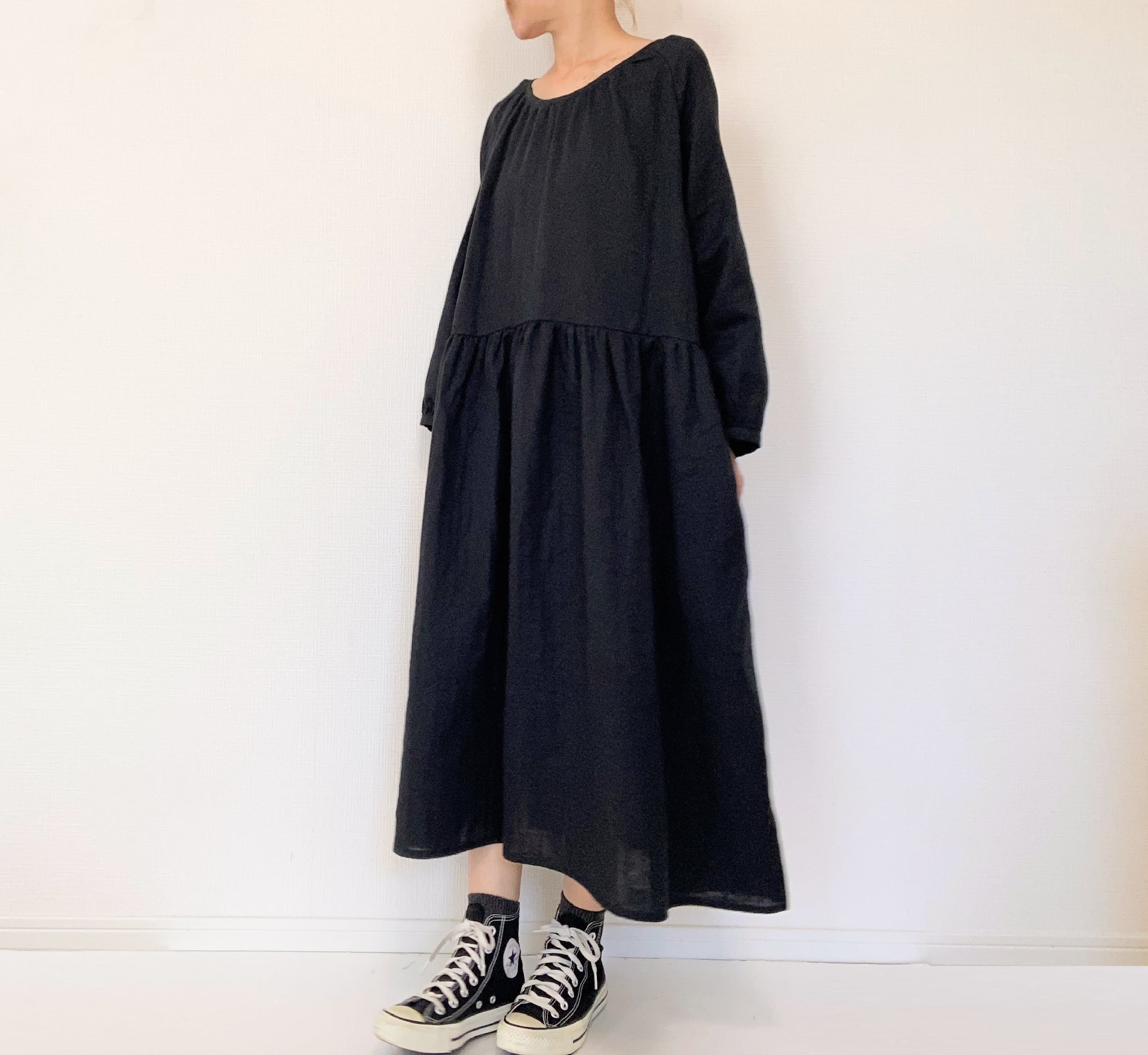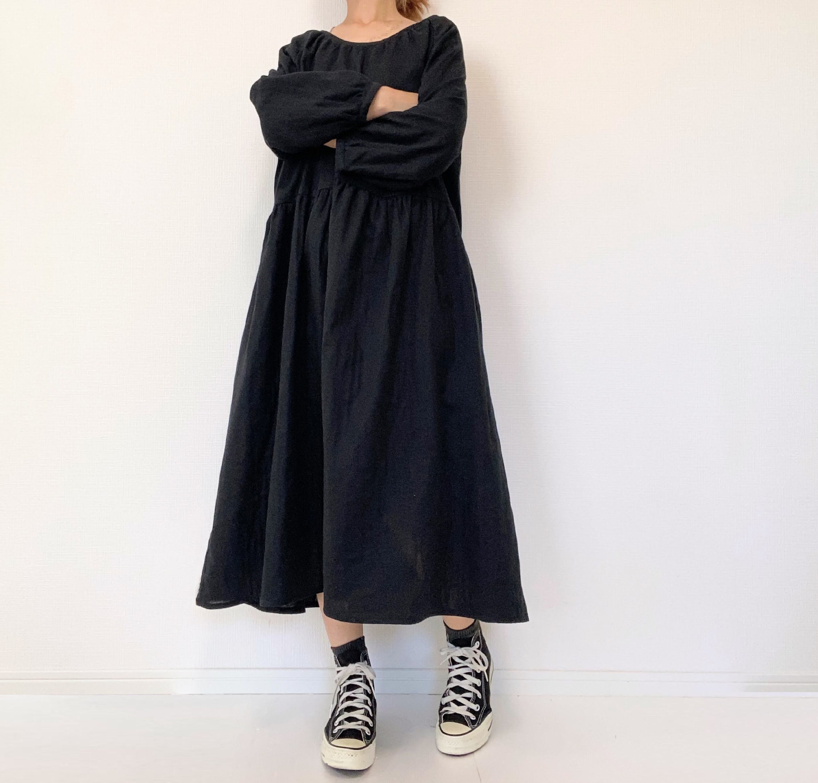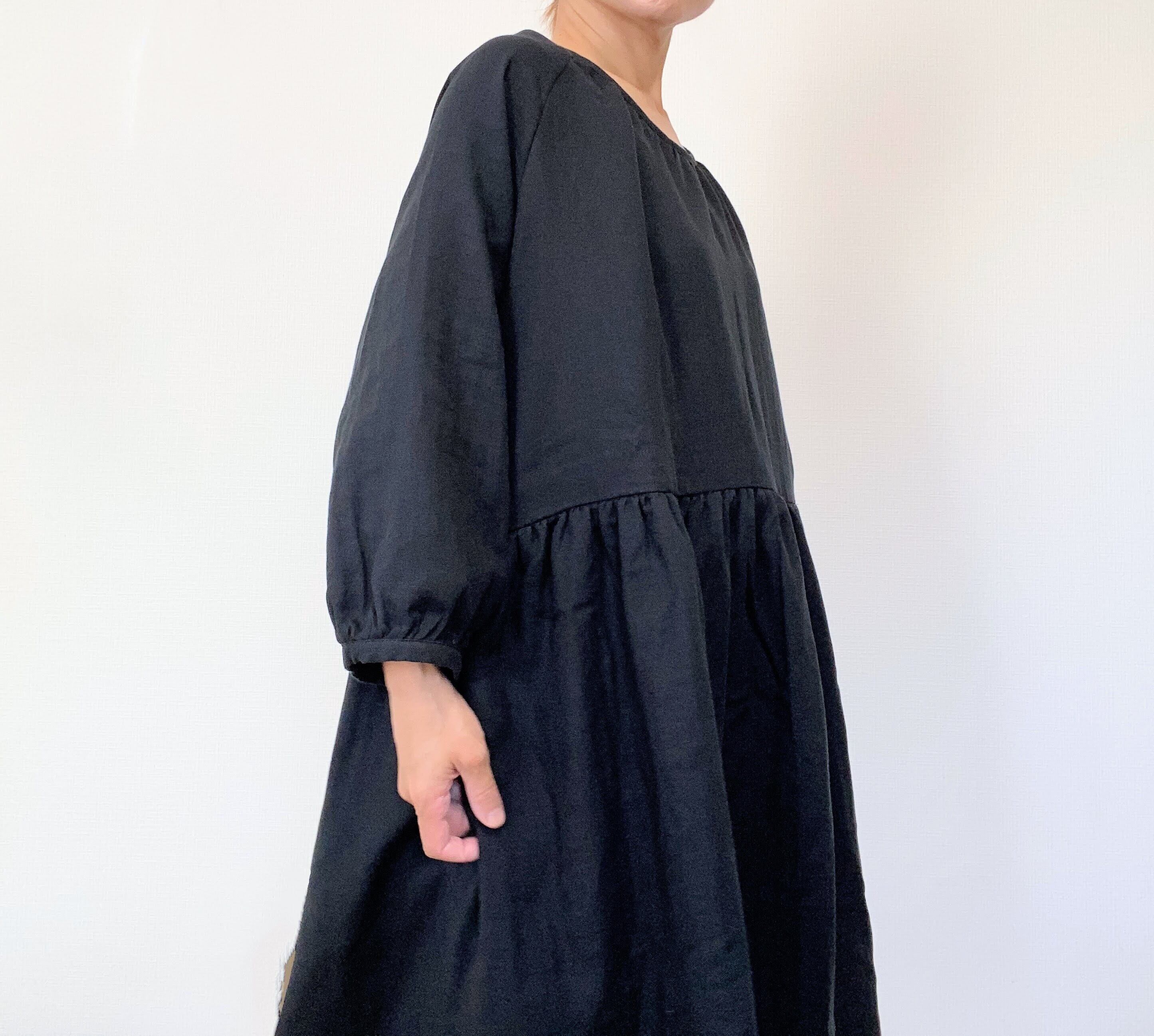 【送料無料】ふんわりダブルガーゼ*シンプル無地の長袖ワンピース*ゆったりフリーサイズ*国産コットン100%*ポケット付*ブラック